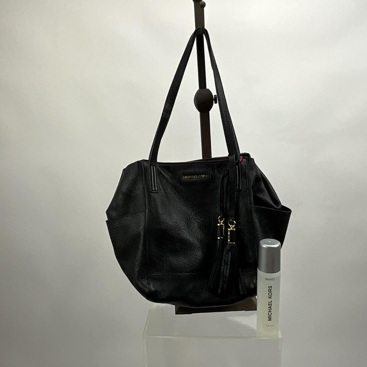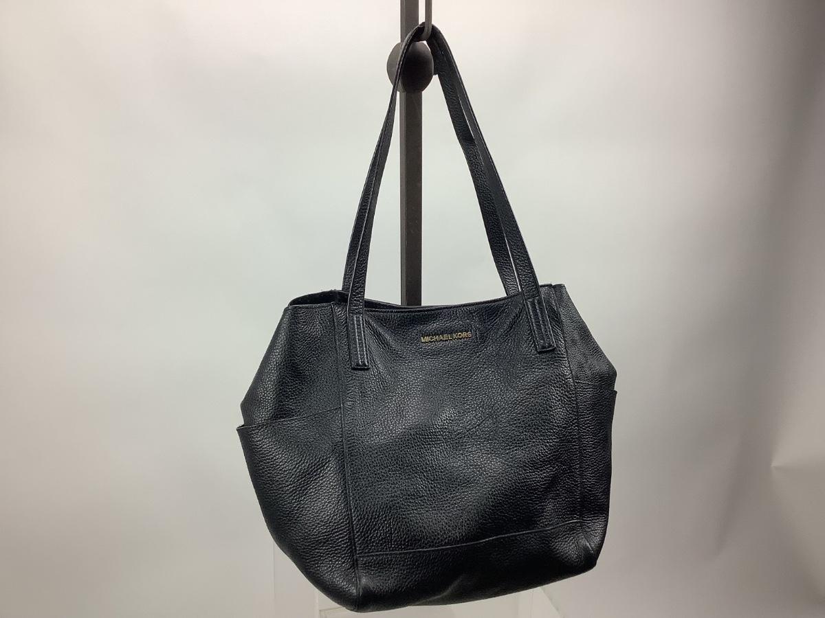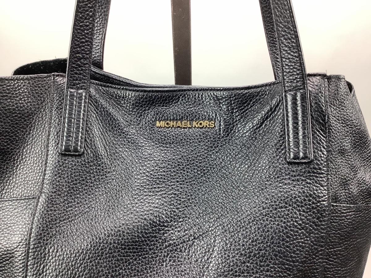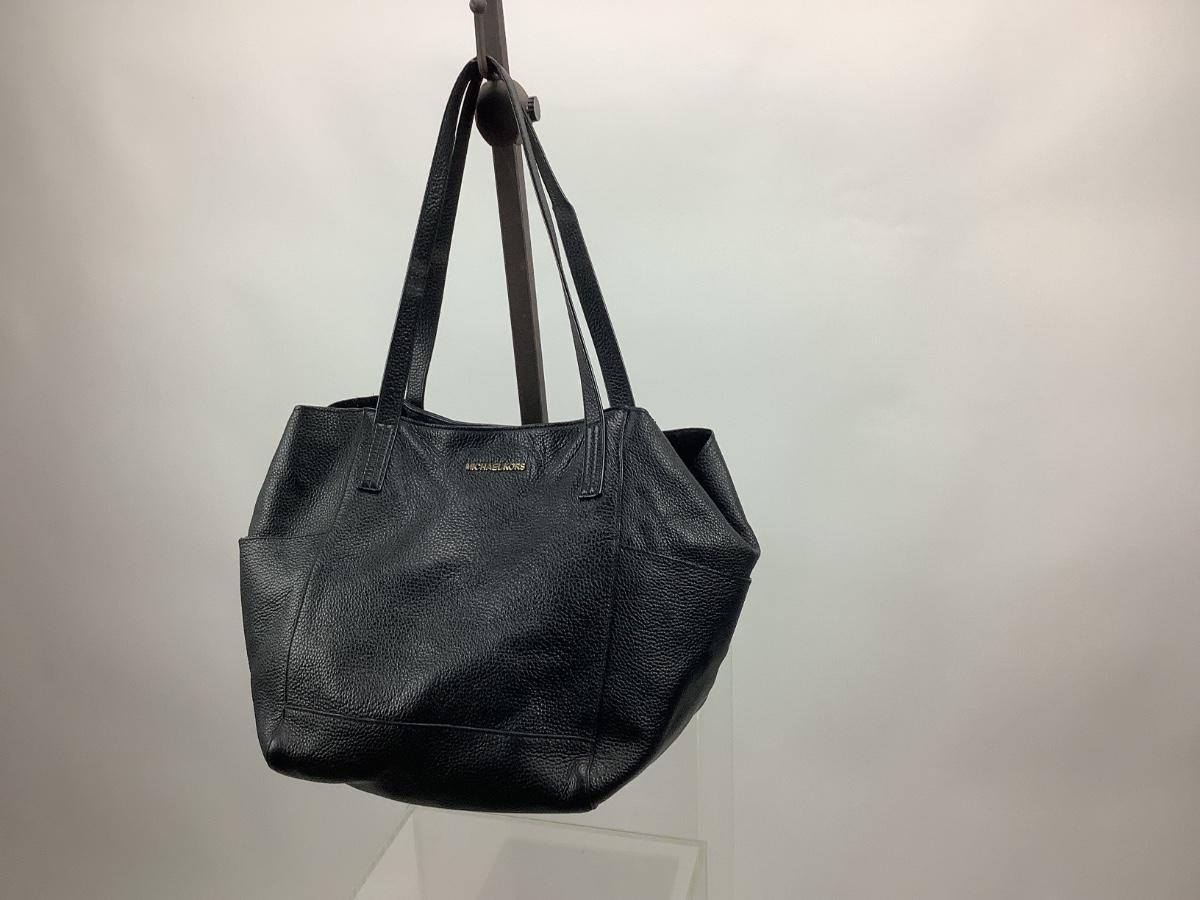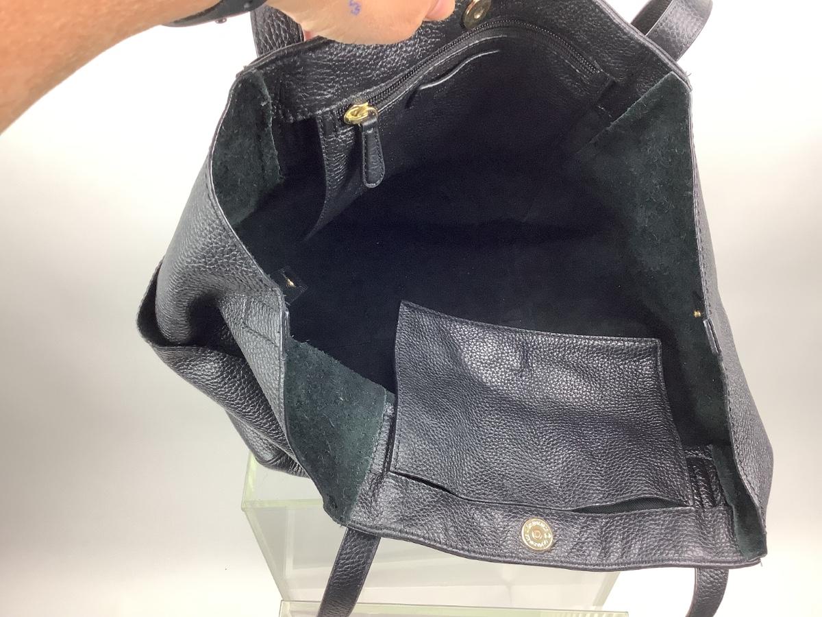 Black pebble leather, large tote style purse with 2 interior pockets, measures 17" x 11" 8".