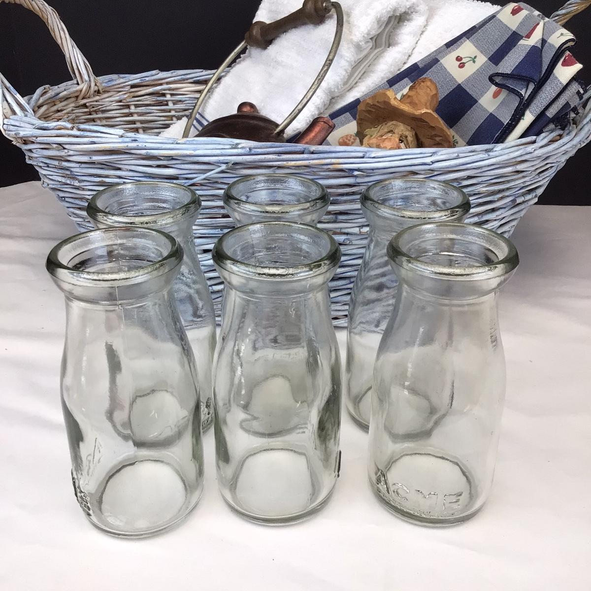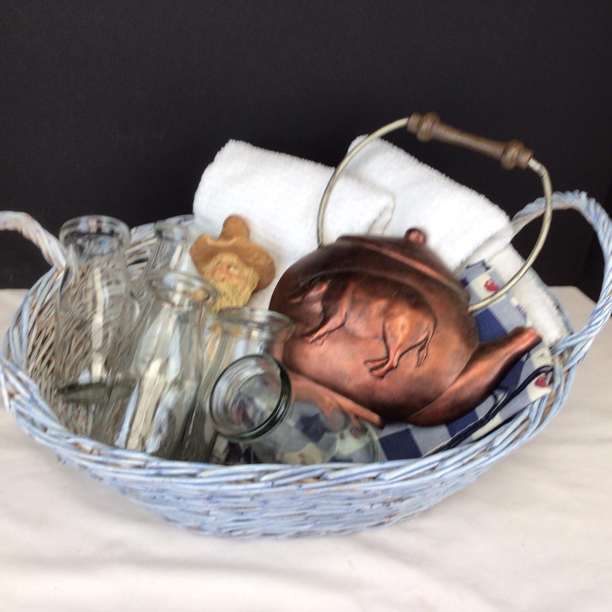 Basket with linens, milk bottles, faux copper kettle wall hanging, old man cork.