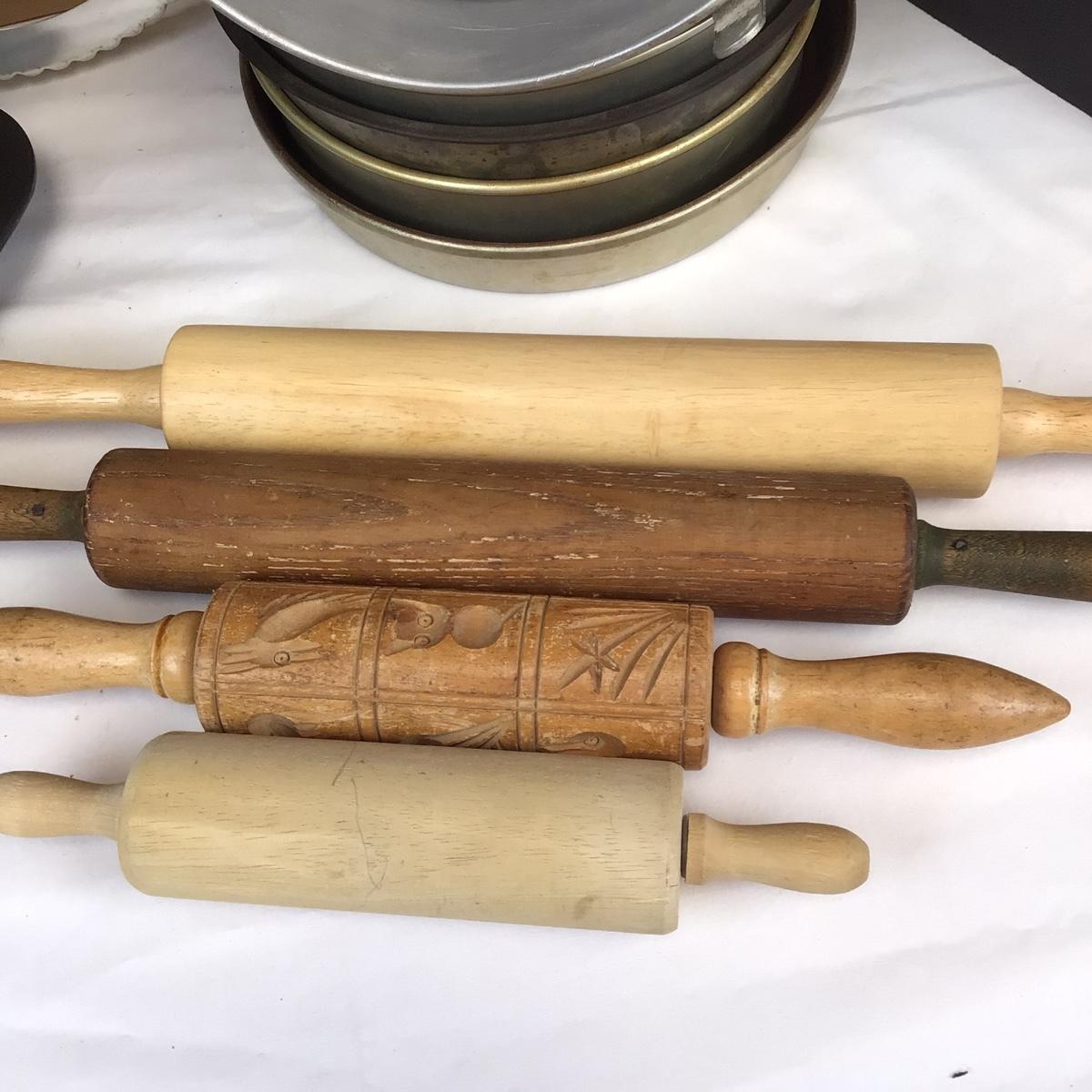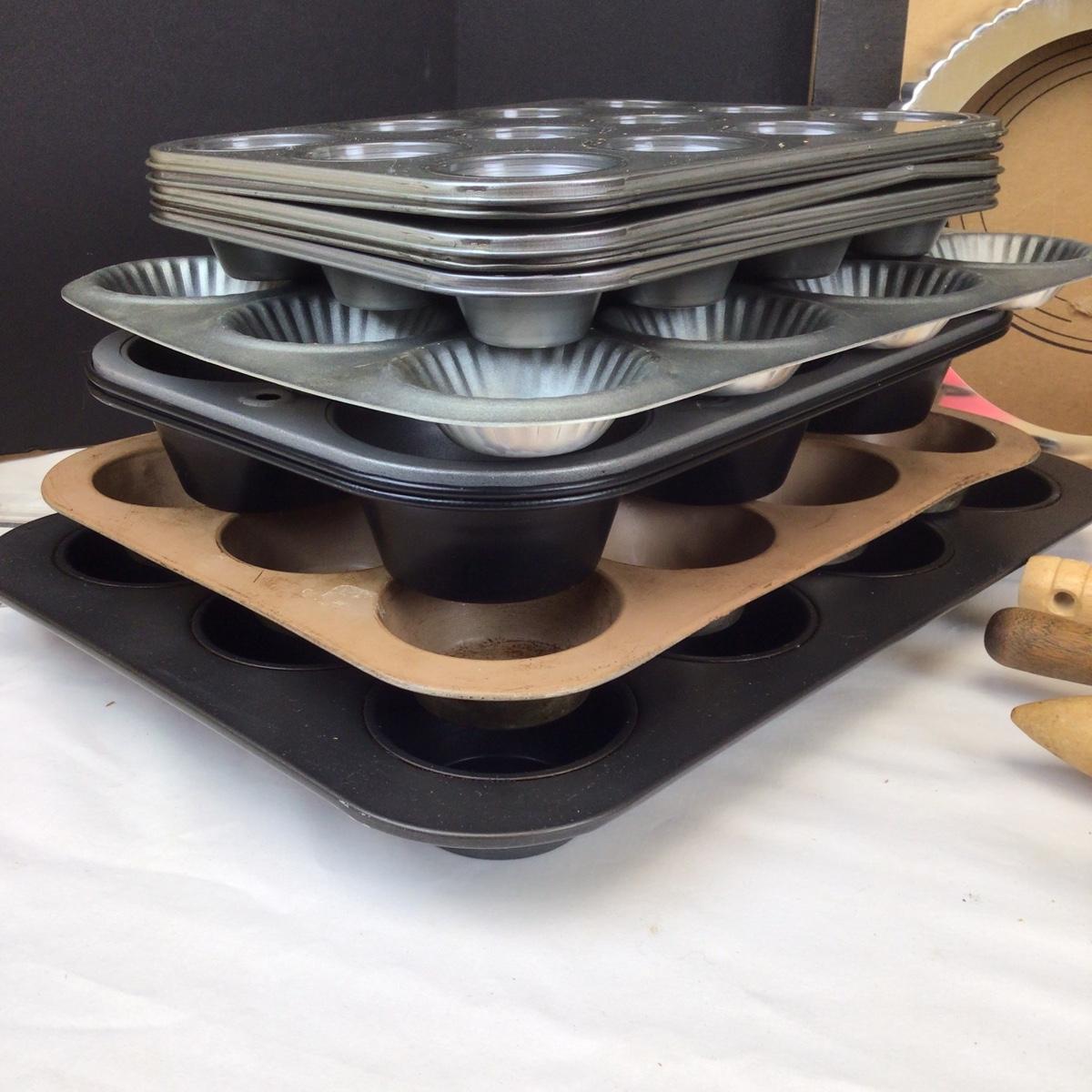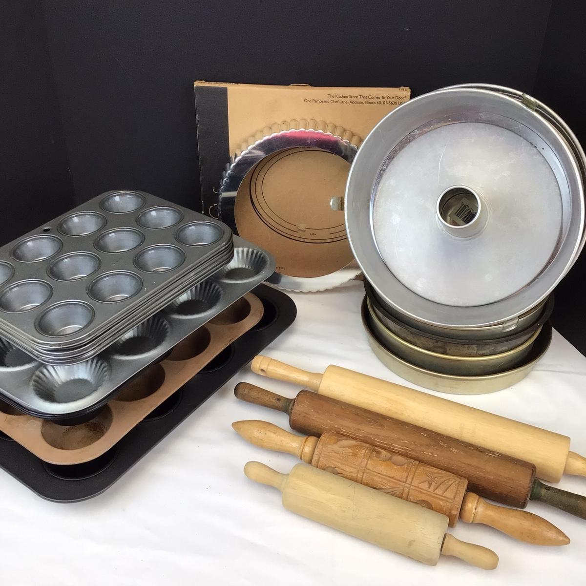Baking pans for muffins, cupcakes, pies, pie crust covers and 3 rolling pins.