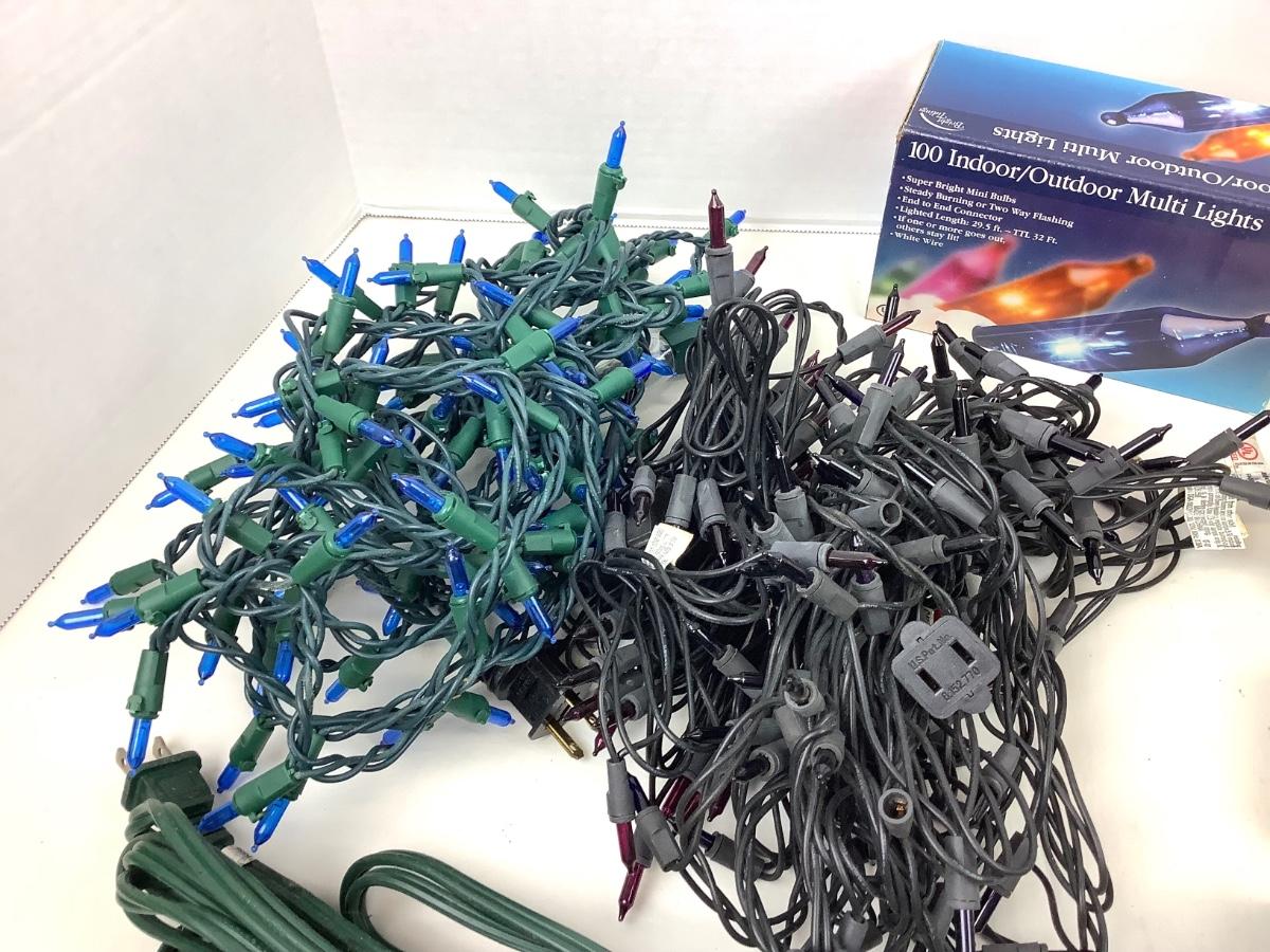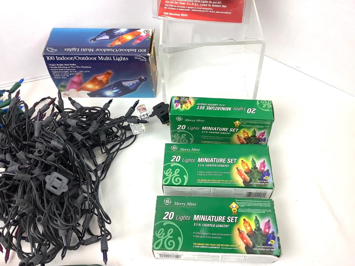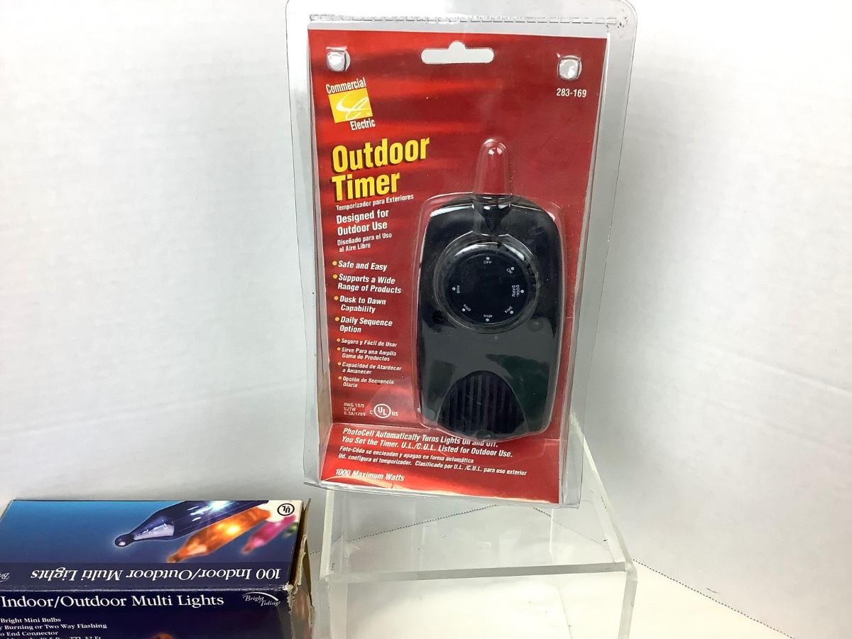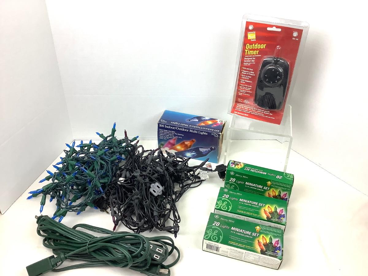 New extension cords, 4 boxes of new lights, outdoor timer and strings of blue, pink and purple lights that are new without their boxes.