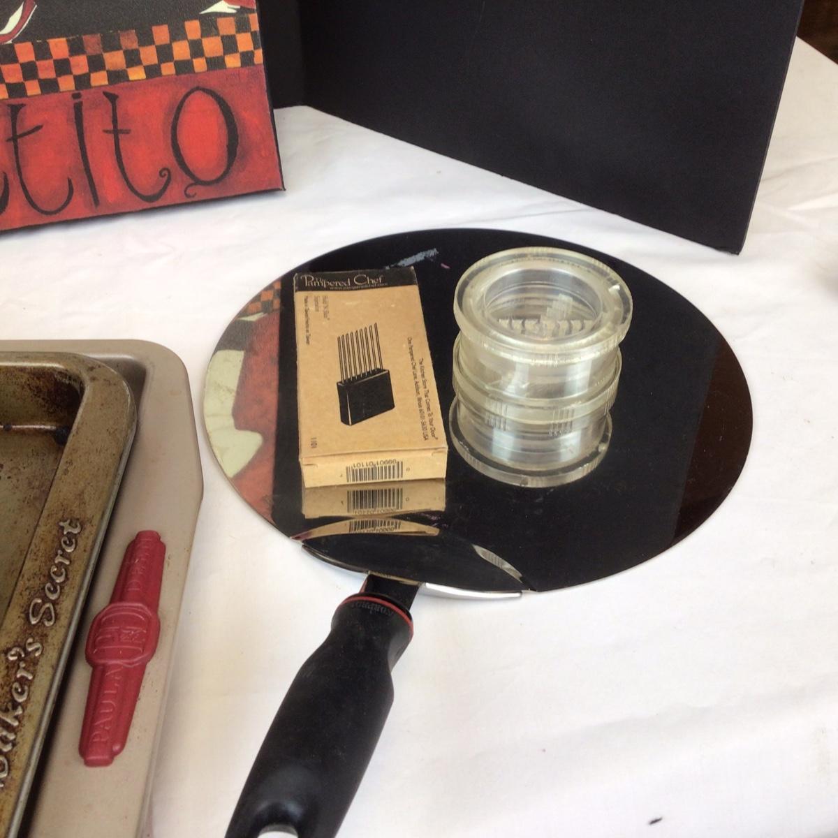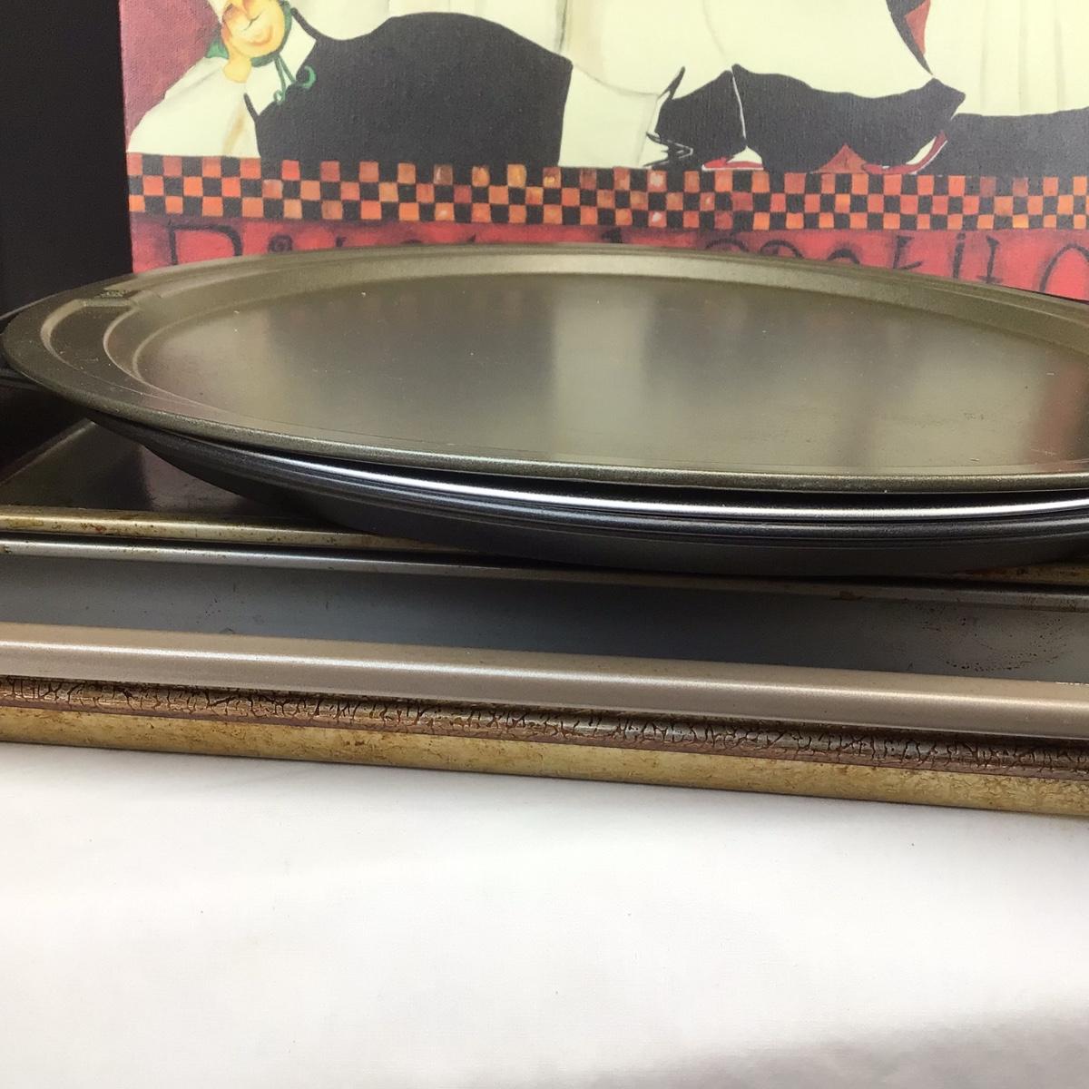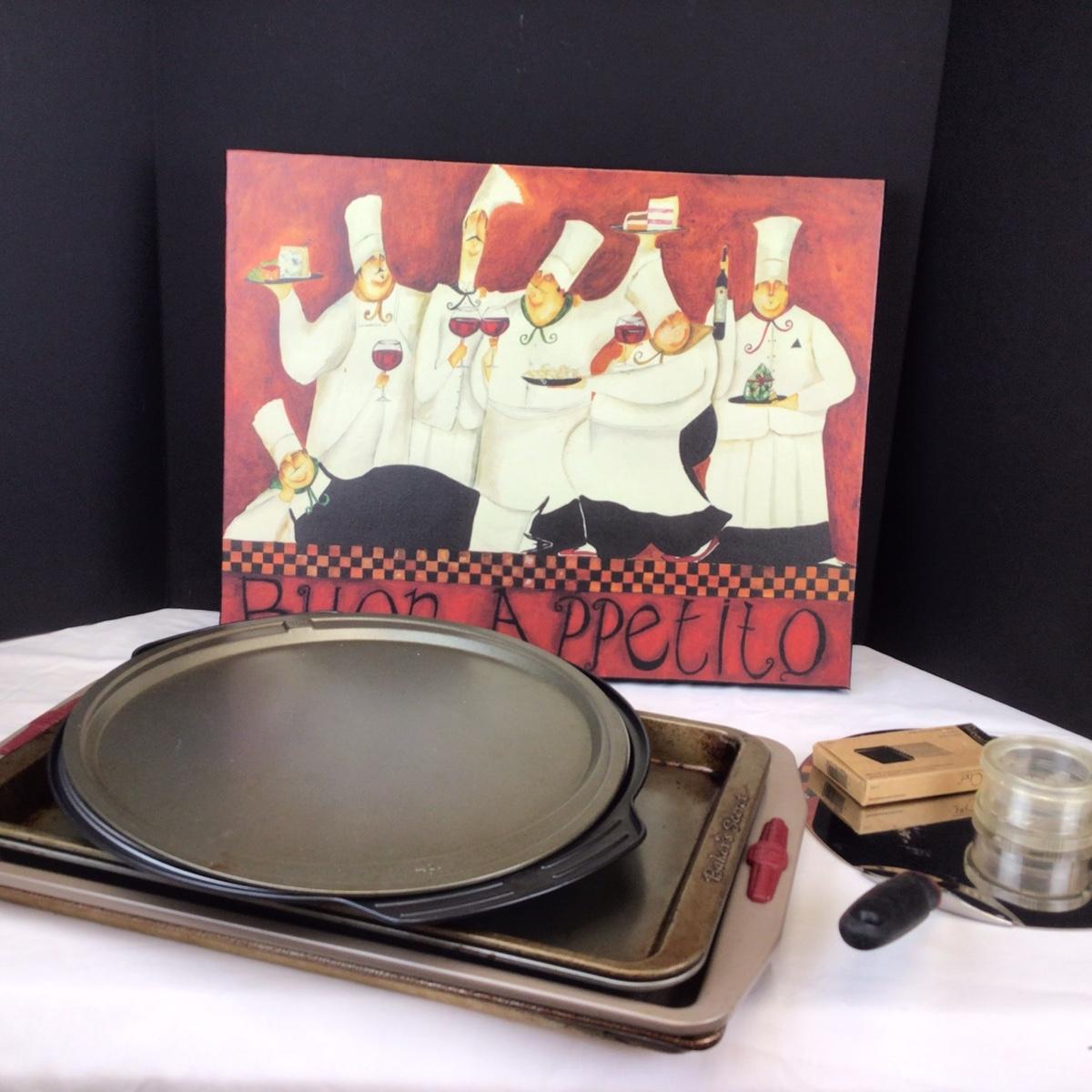 Lot contains pizza pans, cookie sheets, pizza spatula, garlic press and Buon Appetito wall art.