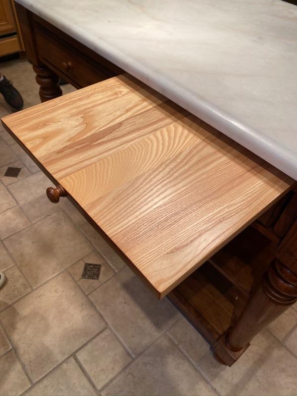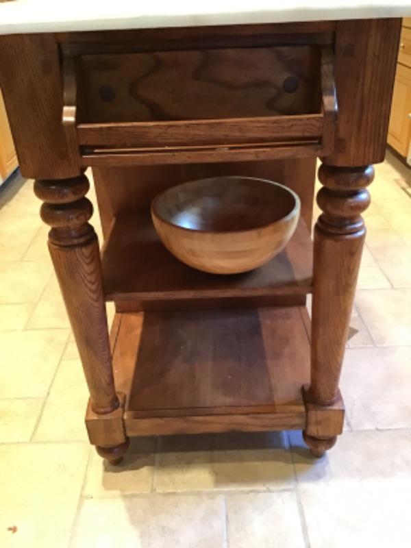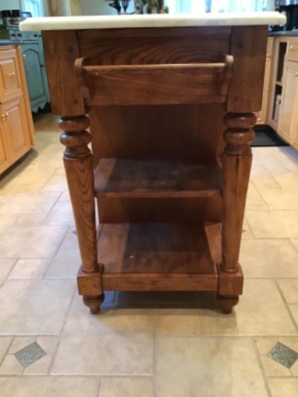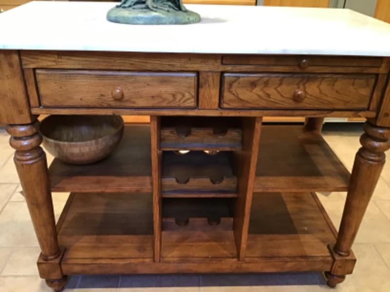 Beautiful Marble top Kitchen Island from Napa Home and Garden . Has a wine area and a pull out cutting board and two drawers