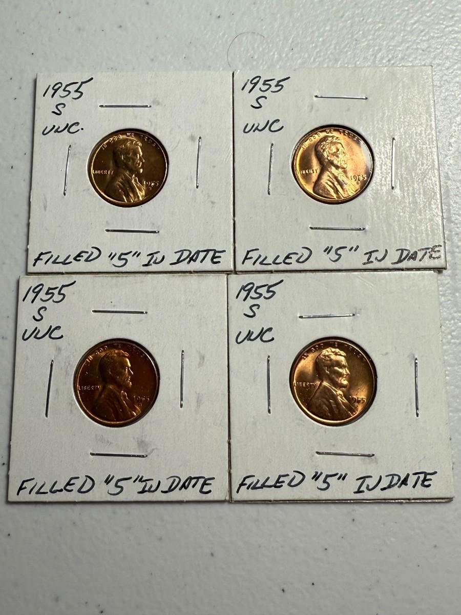 (4)-1955-S BU CONDITION MINOR MINT ERROR LINCOLN CENTS AS PICTURED. $5 DOMESTIC SHIPPING.