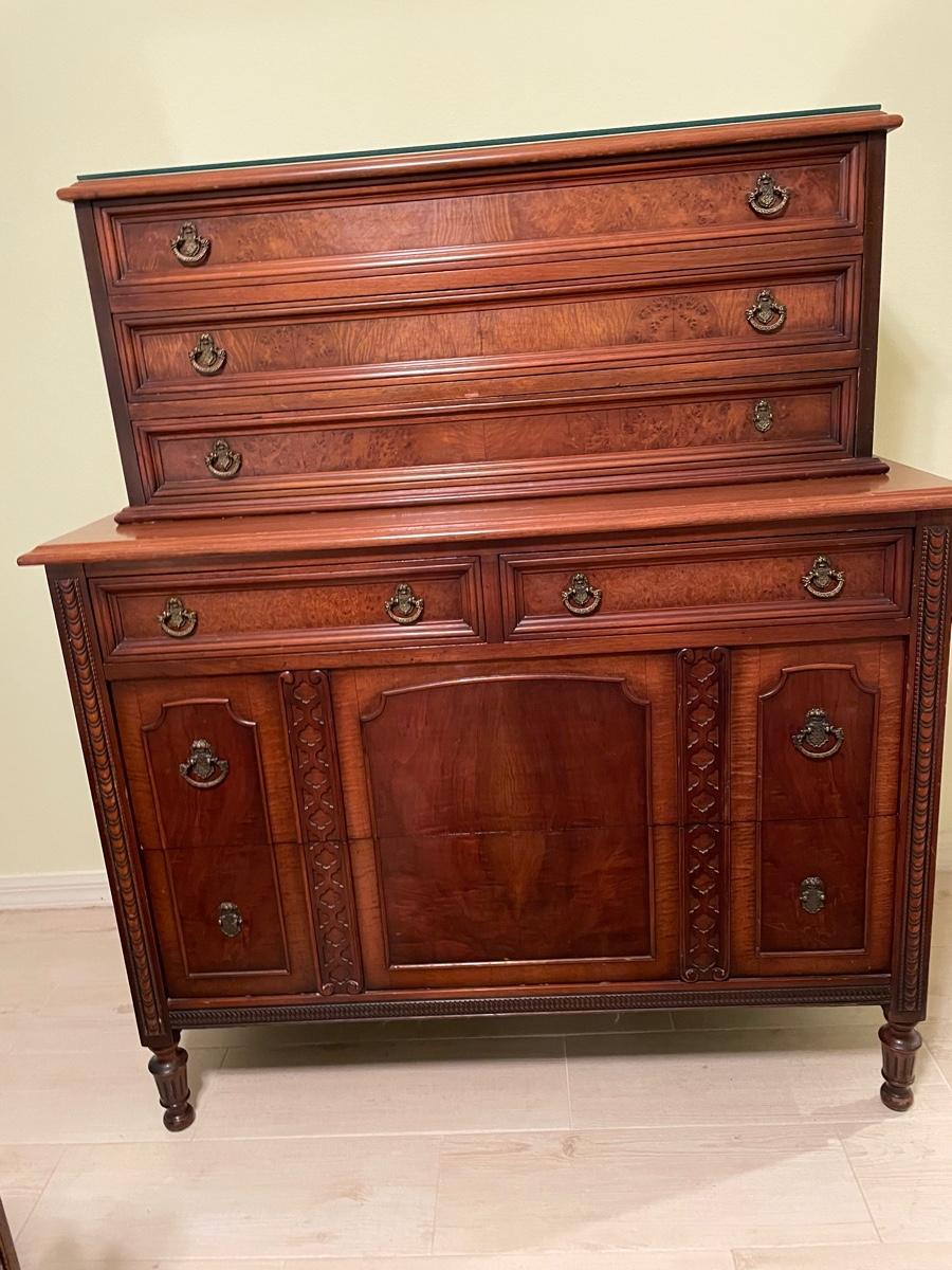 Beautiful chest of drawers with burl wood accents. Custom glass protector top. companion pieces listed in next lots