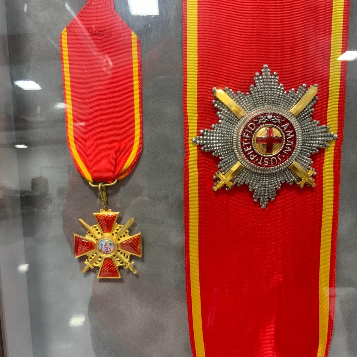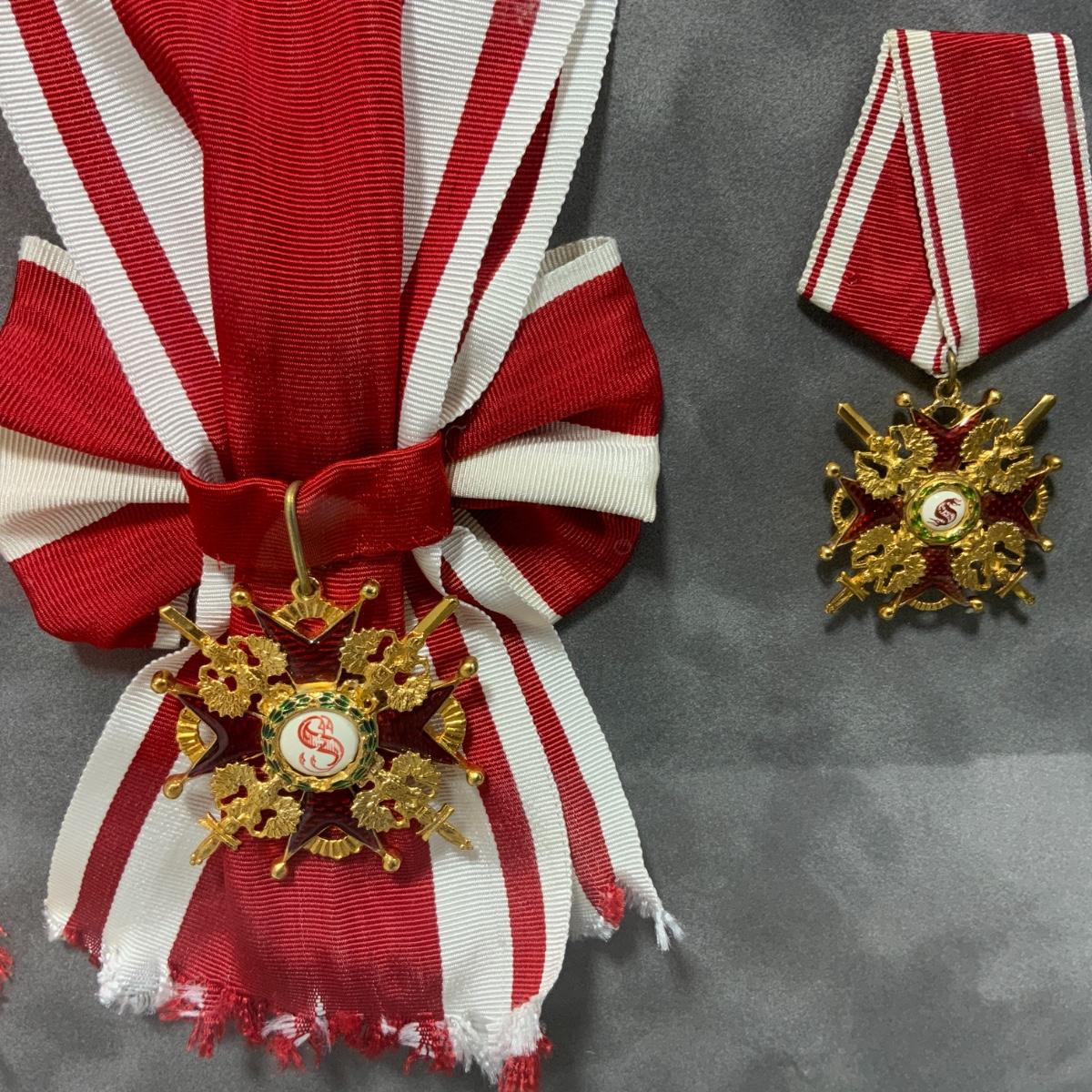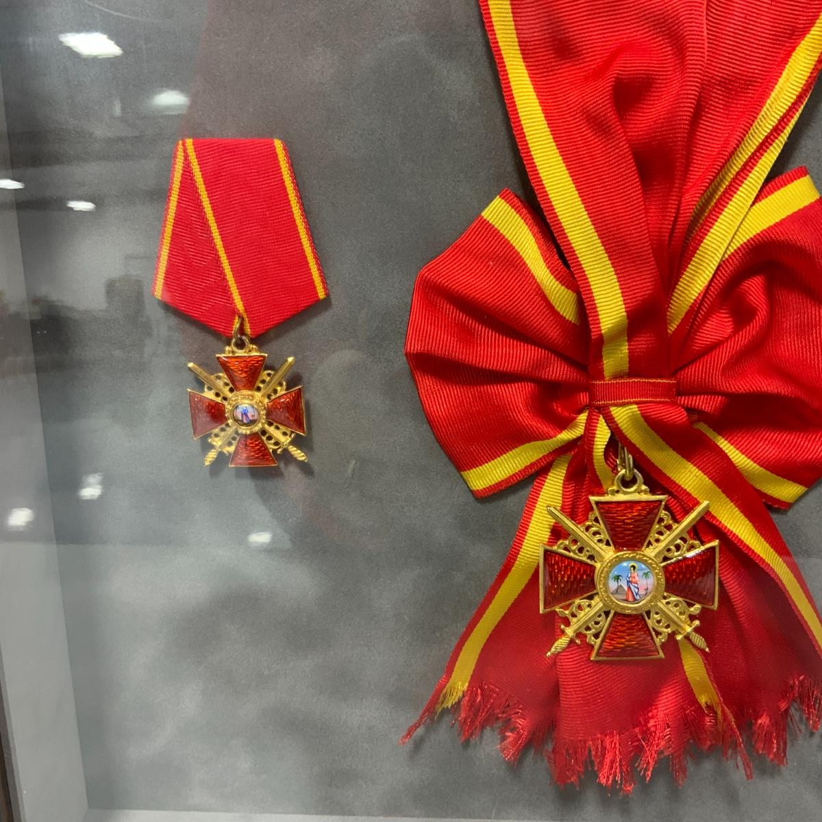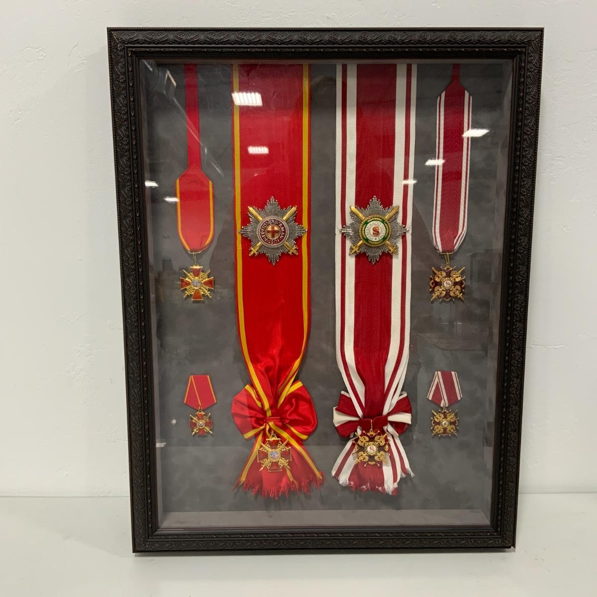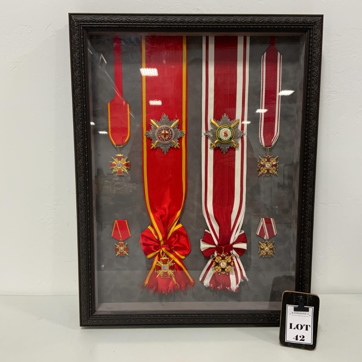 From the Estate of Peter Radovanovich: Elegantly framed Medals from the Russian Empire. On the Left are medals from the Order of Saint Anna, On the Right are medals from the Order of St. Stanislaus (awarded by the imperial government to those Poles who co-operated with Russia rule making the order a symbol of subservience to an occupying power). Medals are excellent reproductions. They are framed behind conservation glass by a reputable local frame shop. Frame measures 27” x 20.5”. Please see photos for details and condition. ::: Shipping is available on this lot. If you require shipping you must let us know at the close of the auction. We will coordinate with you after the item has been won. Shipping fees will include insurance up to or exceeding the value of all items being mailed. If you have any questions regarding this lot please contact the auctioneer either via this website, by direct email or by phone. PICK UP TIMES and other important information can be found in the TERMS and DESCRIPTION of the auction. Please take a look for pertinent information. Thanks!