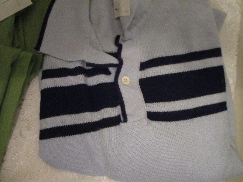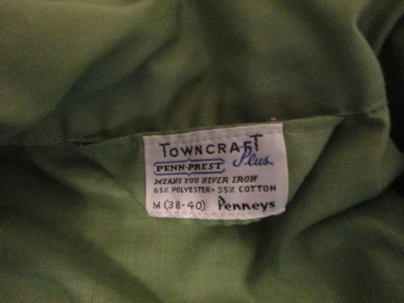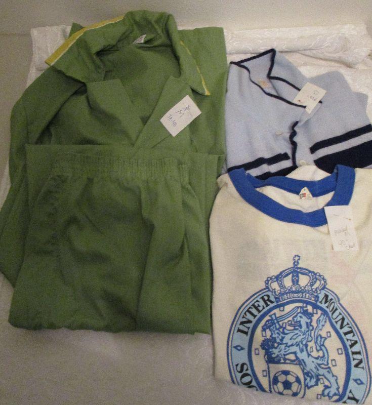 Pajamas, Towncraft green 38/40 long sleeve, long pants 65% polyester 35% cotton; Screenstars t-shirt cream size M; Knit polo shirt light blue size S