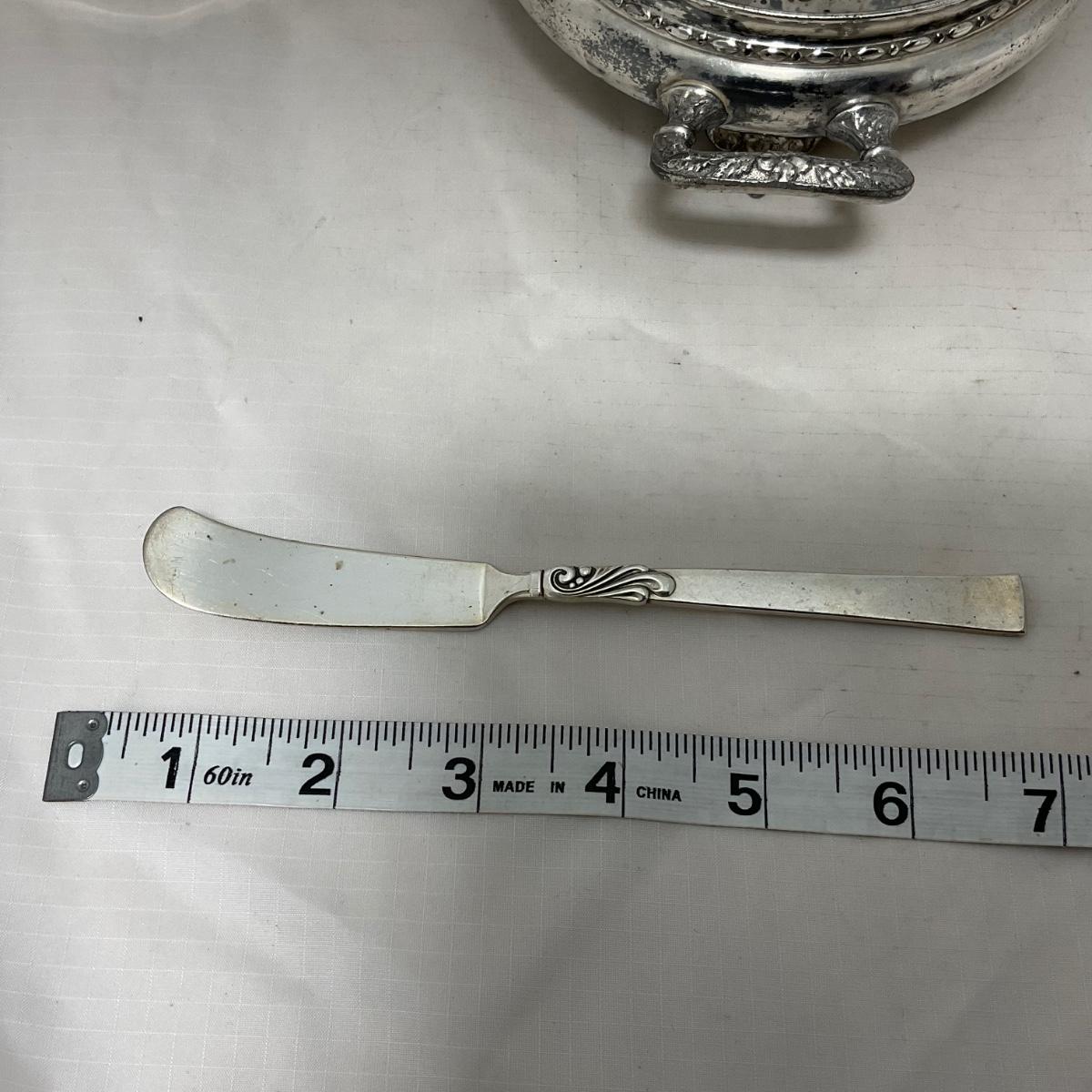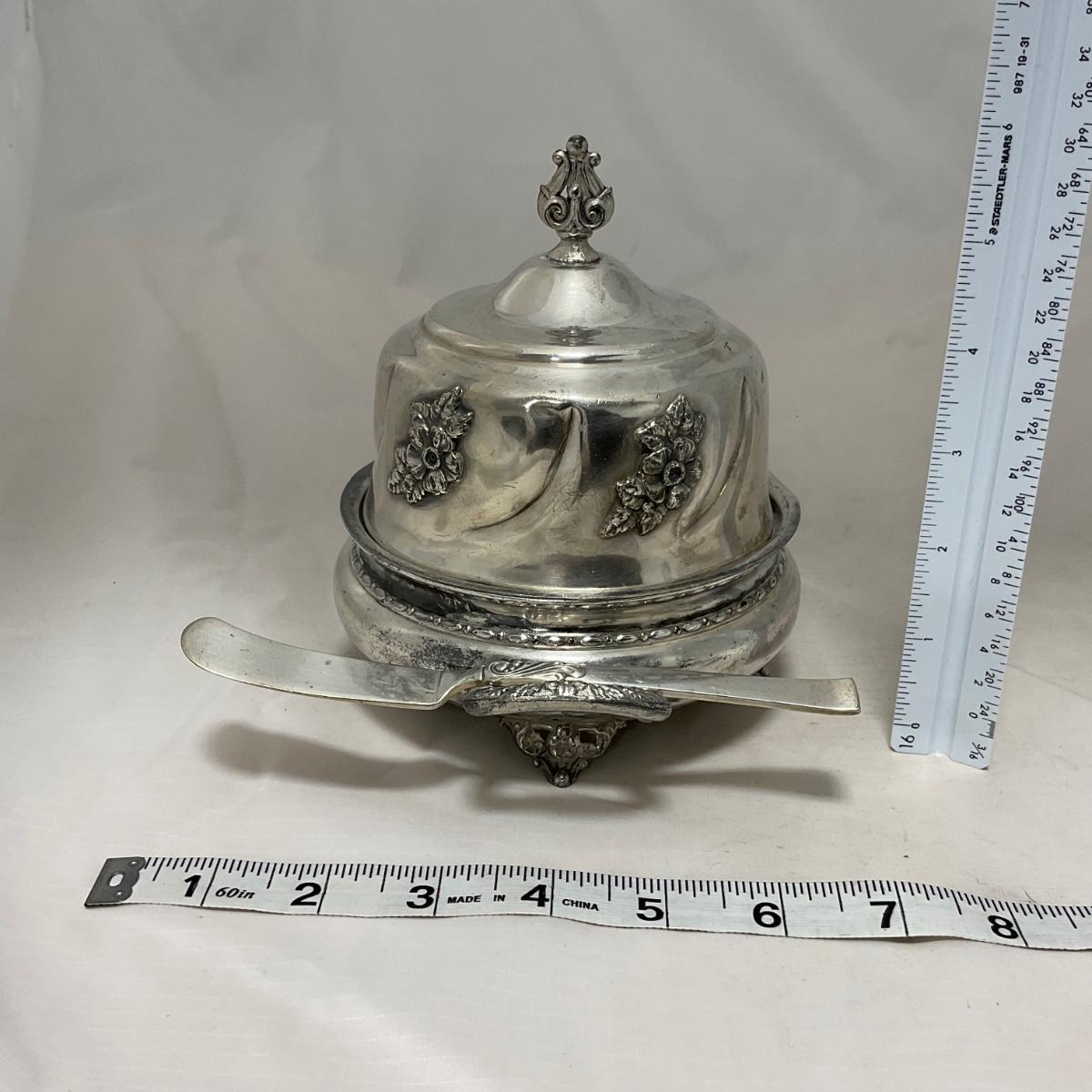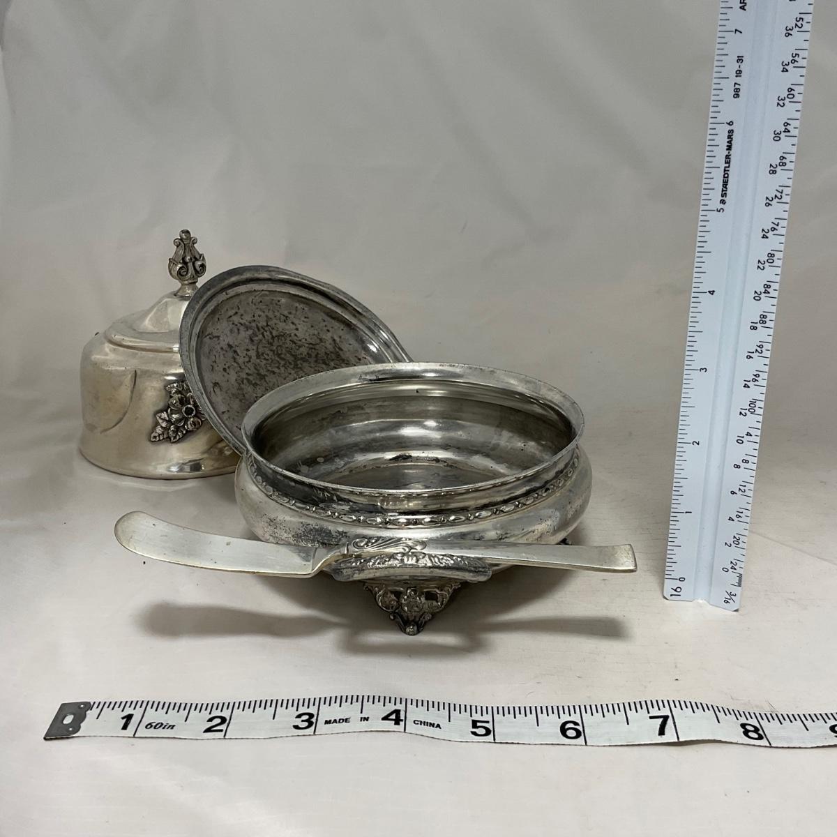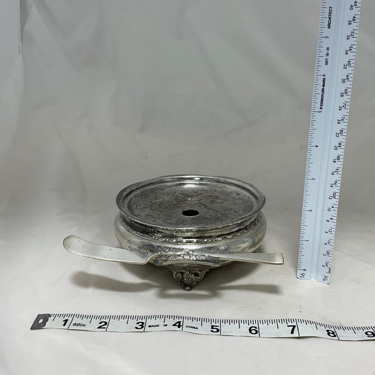4 pieces total covered metal butter dish insert and serving knife. The perfect addition to any table setting. This piece is marked on the bottom. Please see photos for details and condition. ::: Shipping is available on this lot. If you require shipping you must let us know at the close of the auction. We will coordinate with you after the item has been won. Shipping fees will include insurance up to or exceeding the value of all items being mailed. If you have any questions regarding this lot please contact the auctioneer either via this website, by direct email or by phone. PICK UP TIMES and other important information can be found in the TERMS and DESCRIPTION of the auction. Please take a look for pertinent information. Thanks!