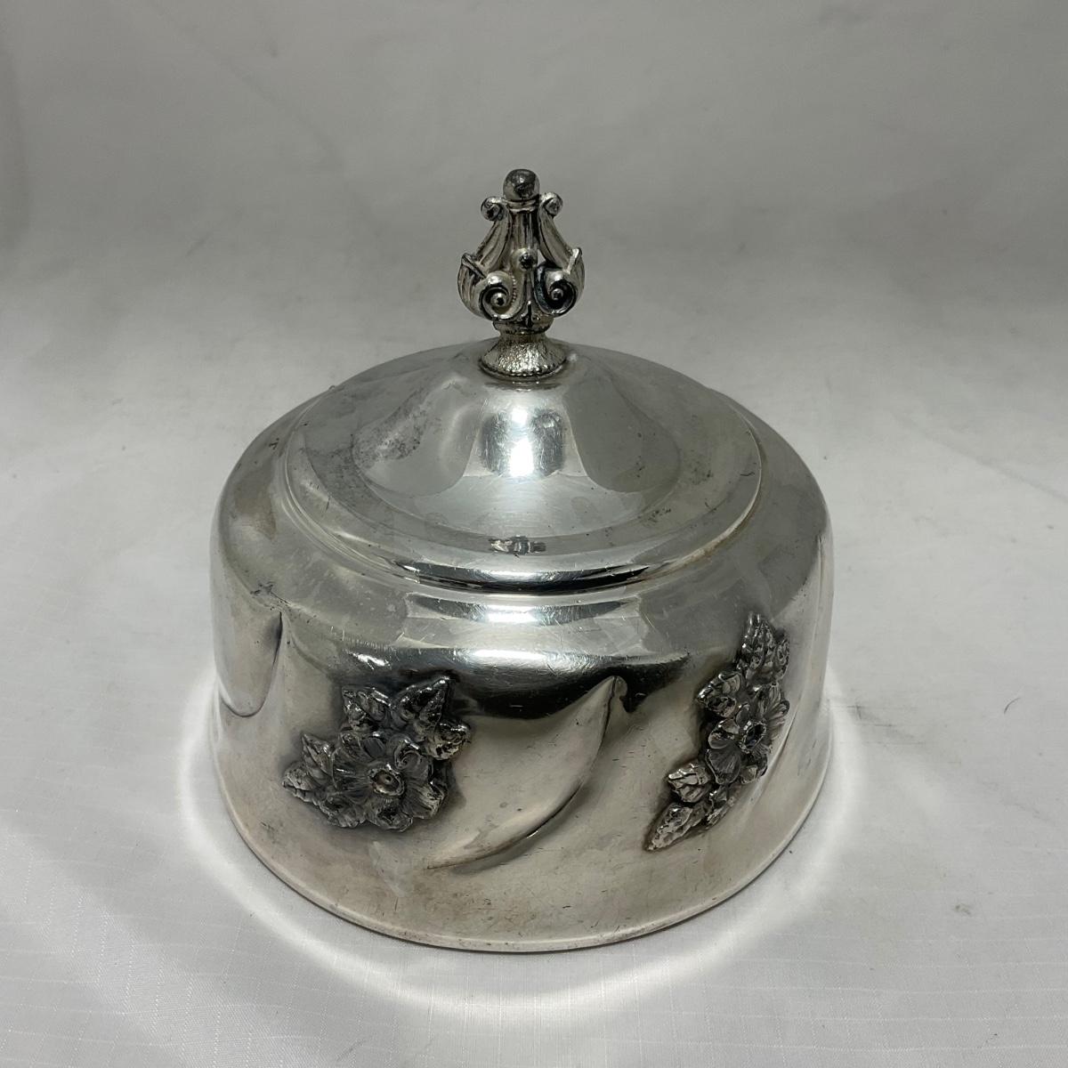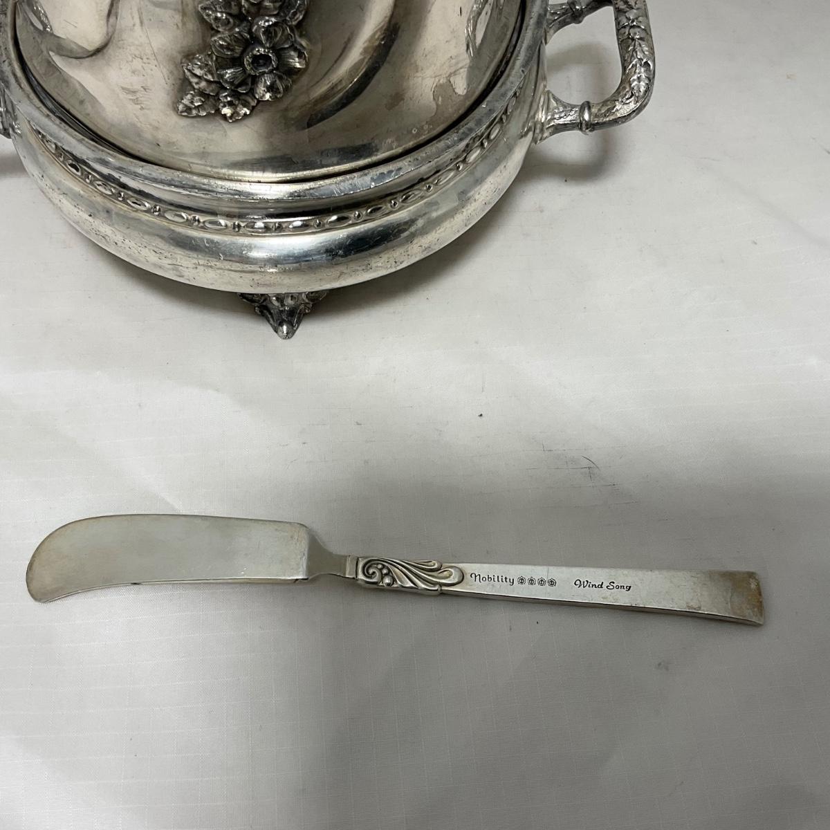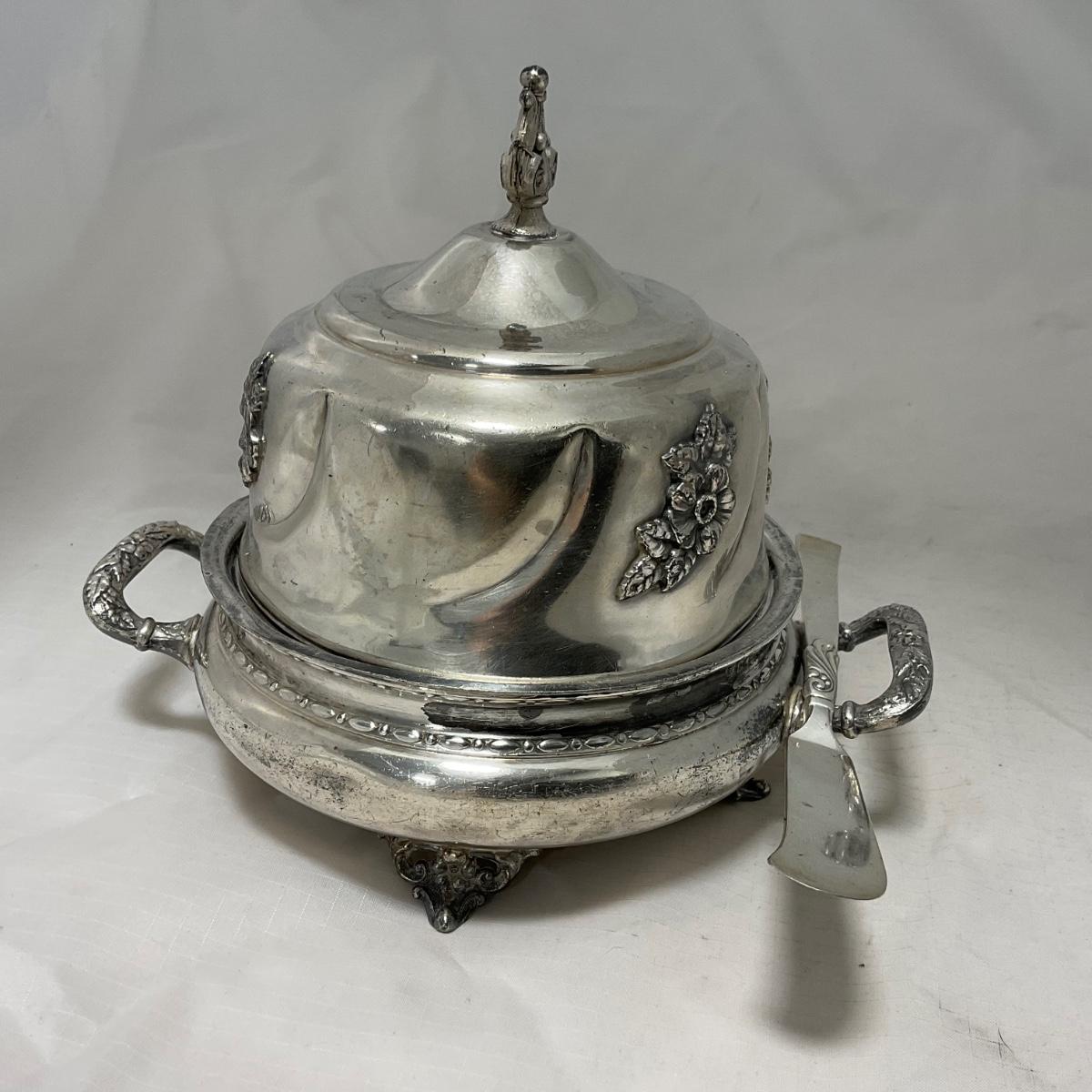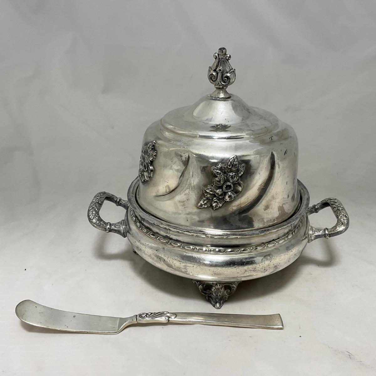 4 pieces total covered metal butter dish insert and serving knife. The perfect addition to any table setting. This piece is marked on the bottom. Please see photos for details and condition. ::: Shipping is available on this lot. If you require shipping you must let us know at the close of the auction. We will coordinate with you after the item has been won. Shipping fees will include insurance up to or exceeding the value of all items being mailed. If you have any questions regarding this lot please contact the auctioneer either via this website, by direct email or by phone. PICK UP TIMES and other important information can be found in the TERMS and DESCRIPTION of the auction. Please take a look for pertinent information. Thanks!