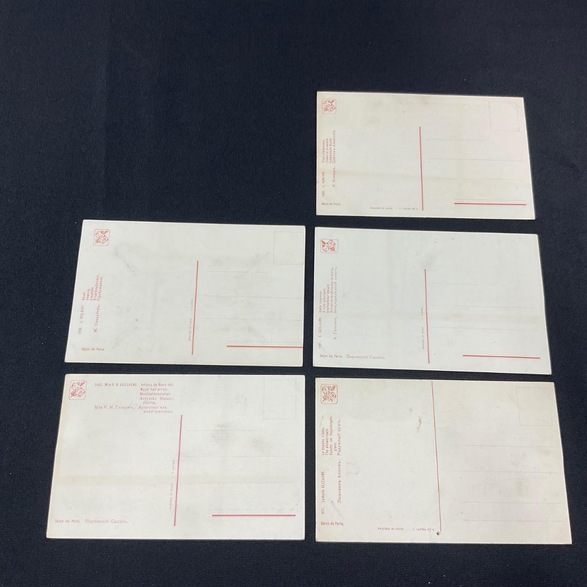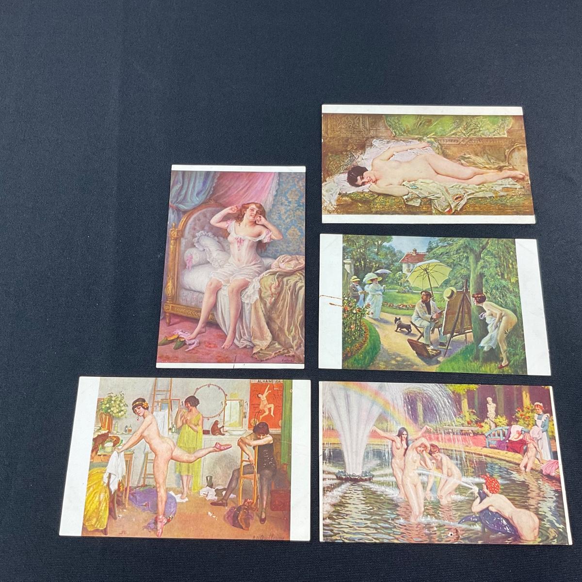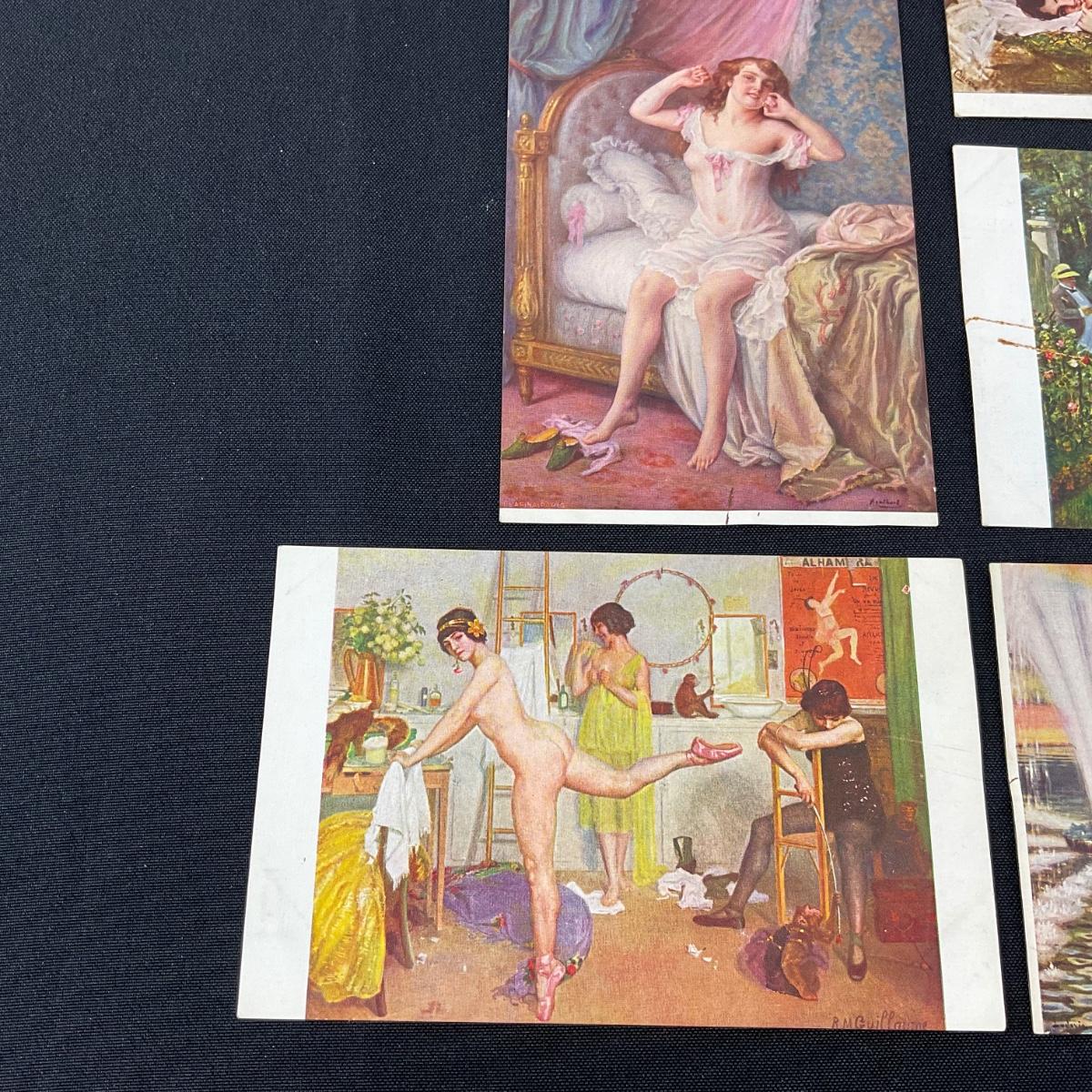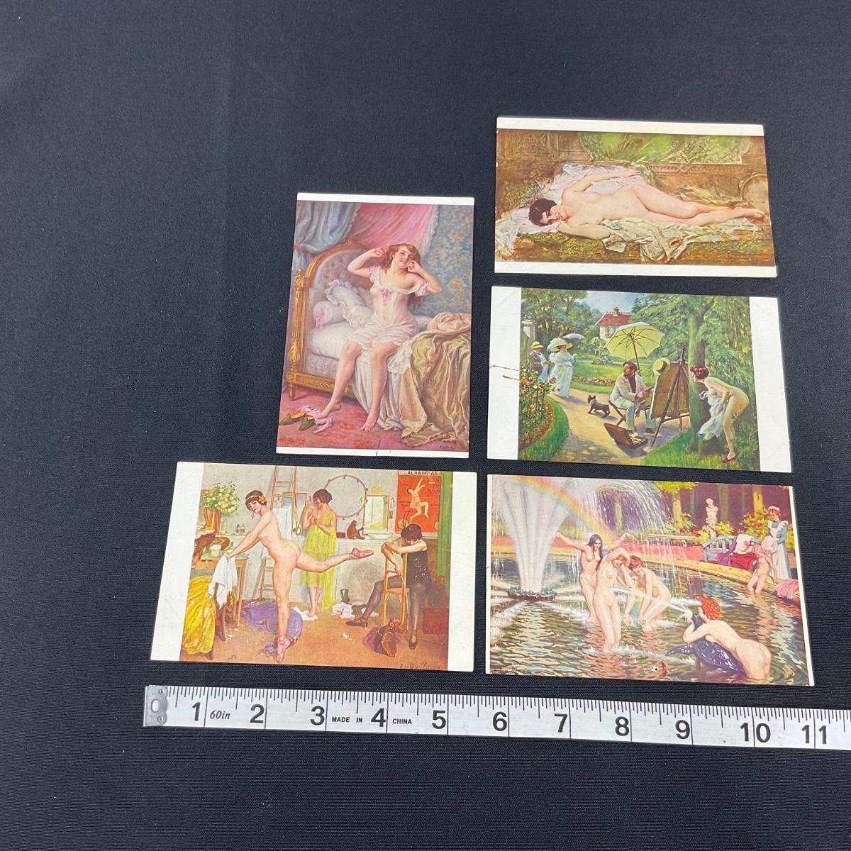Five risqué art nouveau style vintage postcards. Please see photos for details and condition. Any condition statement is given as a courtesy to a client, is an opinion, and should not be treated as a statement of fact. Reference to condition written, oral or within a condition report shall not be regarded as a full account of condition and may not include all defects, alterations, or restorations. Absence of a condition report does not imply a lot is flawless or lacking imperfections or damage. Katherine’s Auction & Appraisal Service shall have no responsibility for any error or omission. Returns shall not be accepted on the basis of condition. ::: Shipping is available on this lot. If you require shipping you must let us know at the close of the auction. We will coordinate with you after the item has been won. Shipping fees will include insurance up to or exceeding the value of all items being mailed. If you have any questions regarding this lot please contact the auctioneer either via this website, by direct email or by phone. PICK UP TIMES and other important information can be found in the TERMS and DESCRIPTION of the auction. Please take a look for pertinent information. Thanks!