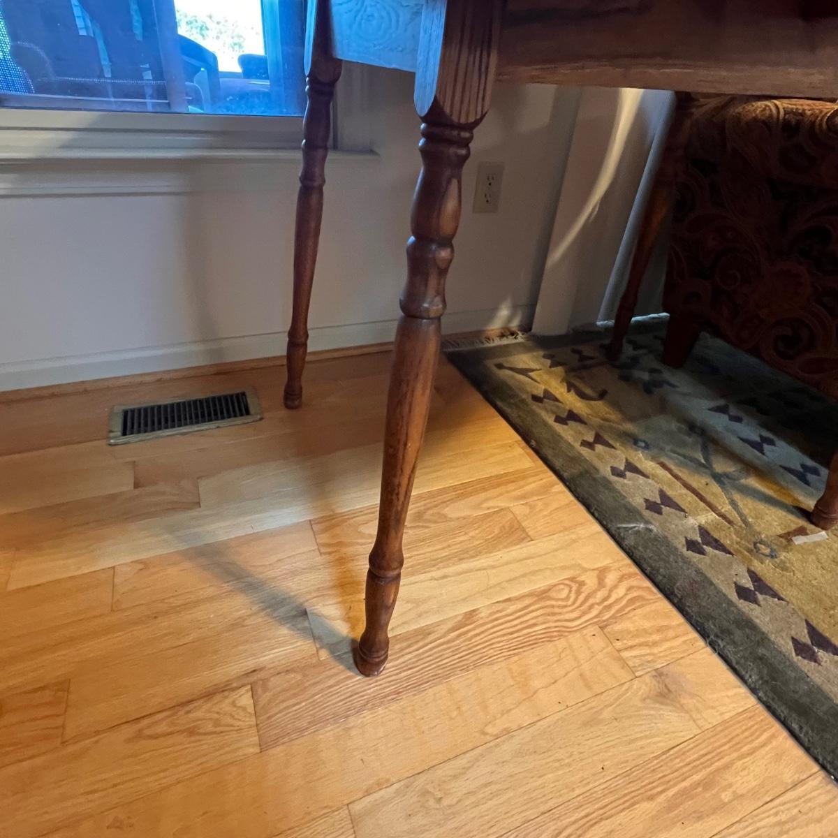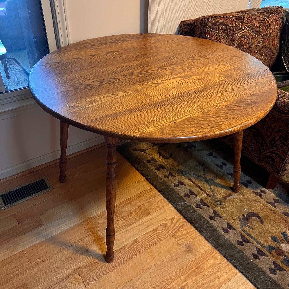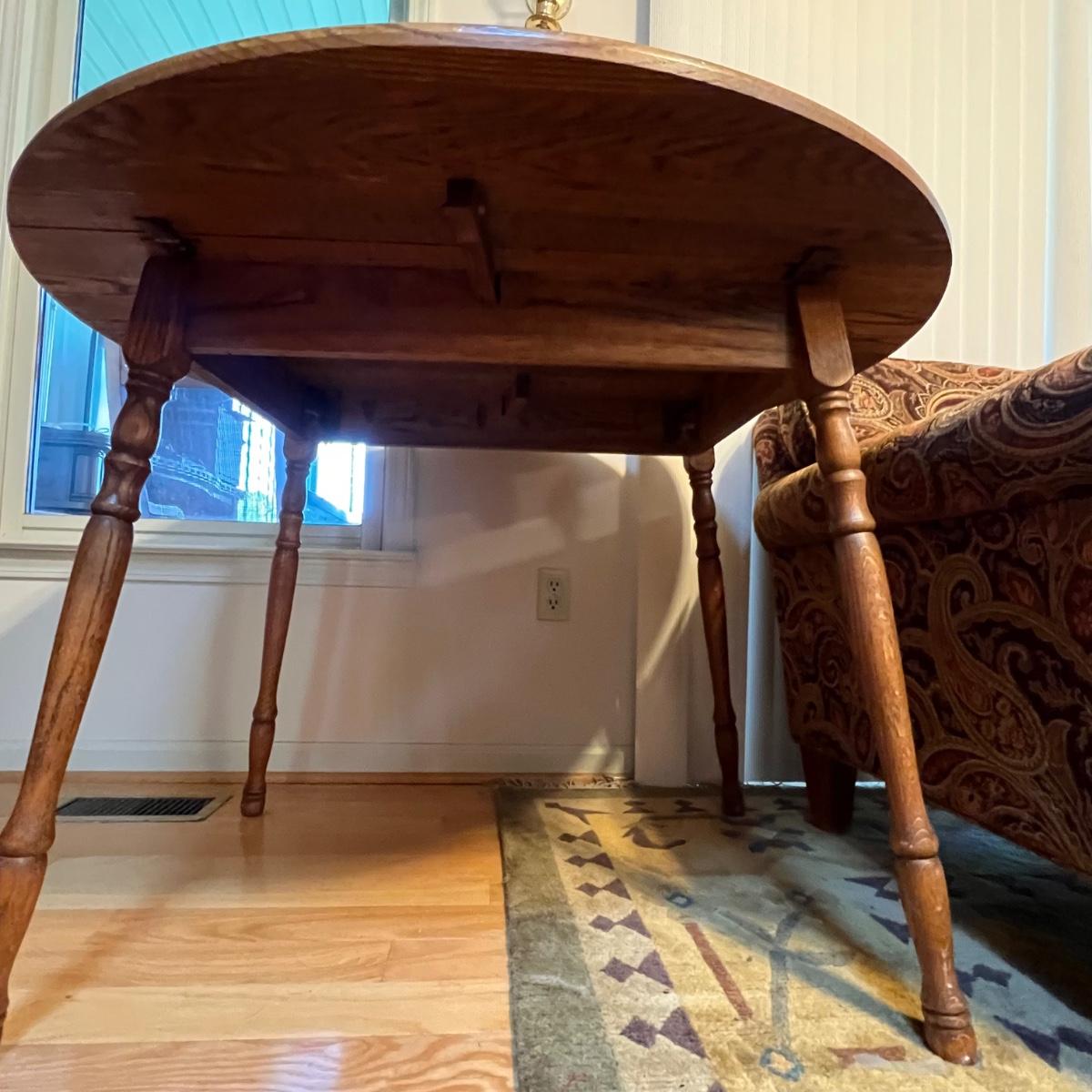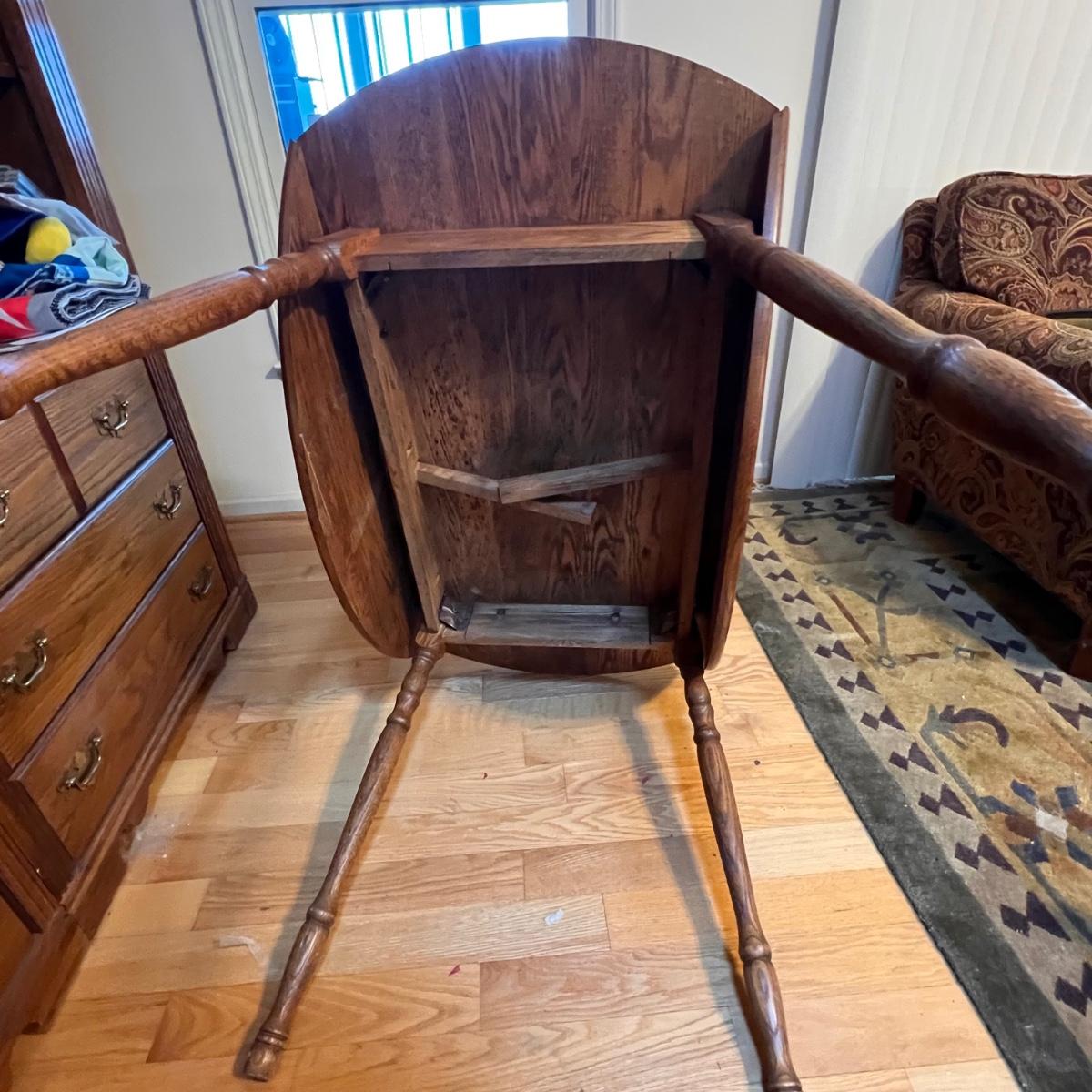 This versatile drop leaf table is fairly lightweight solid wood with a honey brown finish.