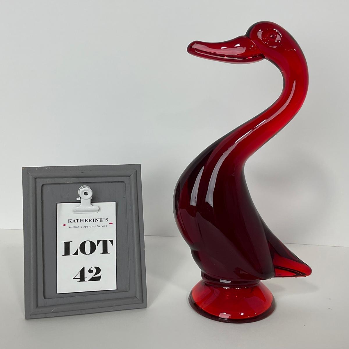 One Viking mid century ruby red duck with curved neck. 5 inches wide, and 9 3/4 inches tall. This piece has no damage, and appears to be in great shape with no visable chips, cracks, or broken pieces. Please see photos for details and condition. Any condition statement is given as a courtesy to a client, is an opinion, and should not be treated as a statement of fact. Reference to condition written, oral or within a condition report shall not be regarded as a full account of condition and may not include all defects, alterations, or restorations. Absence of a condition report does not imply a lot is flawless or lacking imperfections or damage. Katherine’s Auction & Appraisal Service shall have no responsibility for any error or omission. Returns shall not be accepted on the basis of condition. ::: Shipping is available on this lot. If you require shipping you must let us know at the close of the auction. We will coordinate with you after the item has been won. Shipping fees will include insurance up to or exceeding the value of all items being mailed. If you have any questions regarding this lot please contact the auctioneer either via this website, by direct email or by phone. PICK UP TIMES and other important information can be found in the TERMS and DESCRIPTION of the auction. Please take a look for pertinent information. Thanks!
