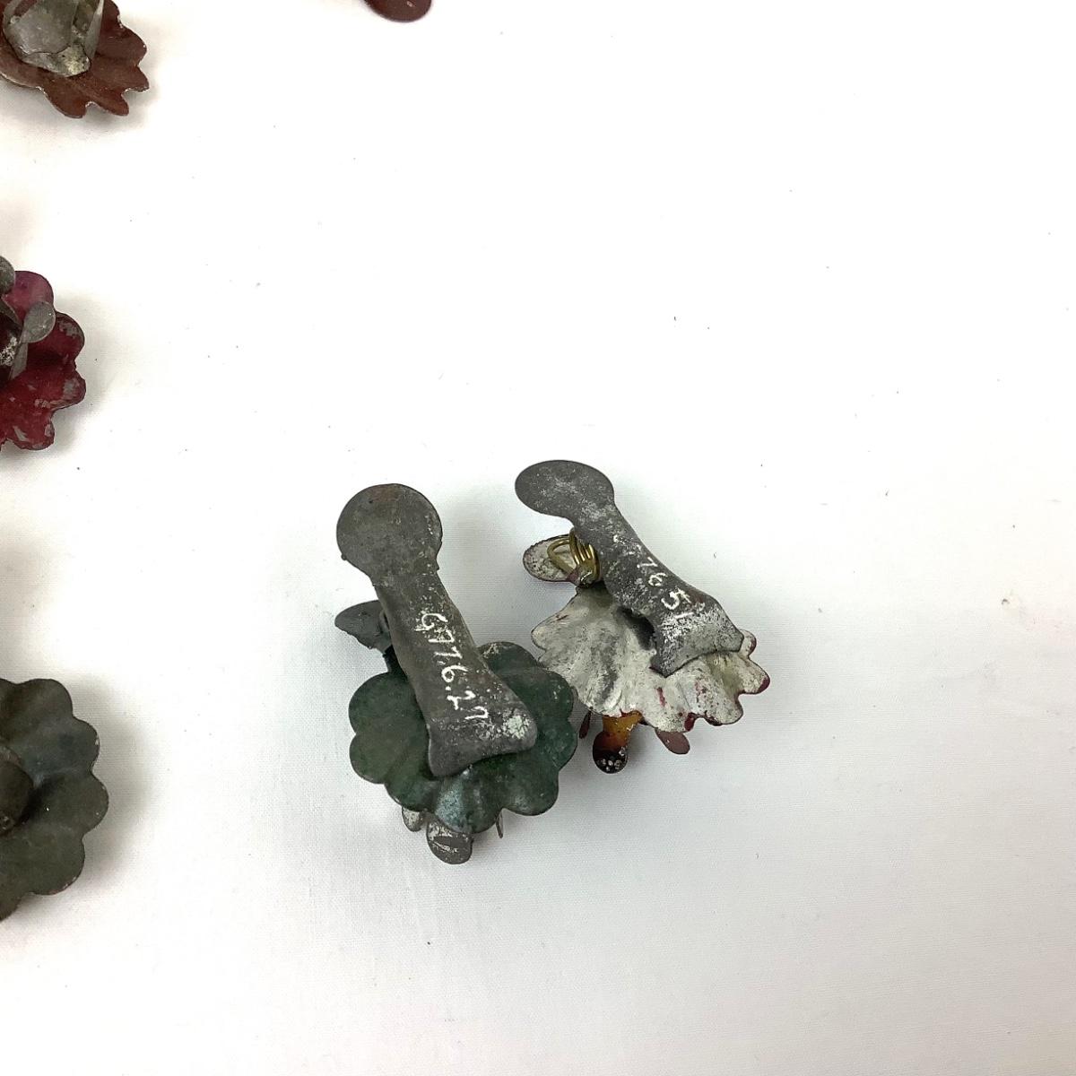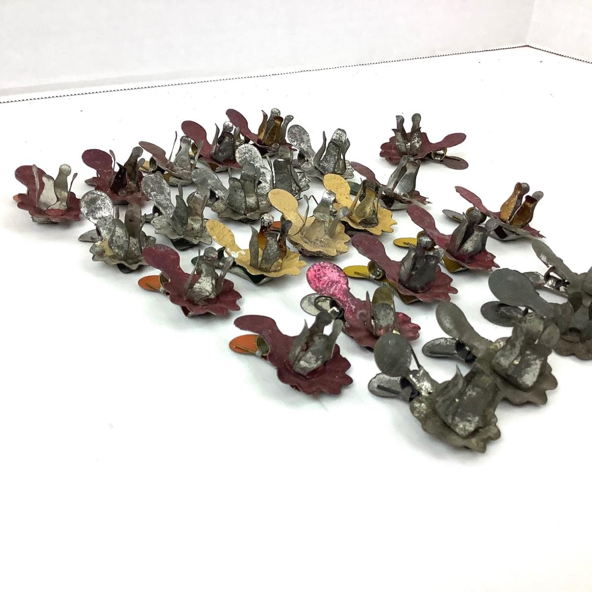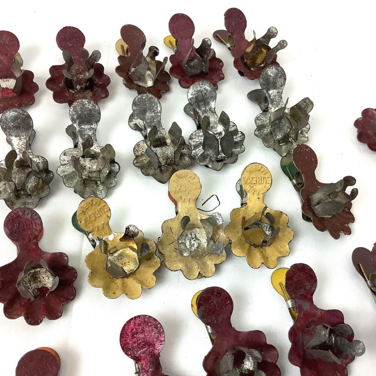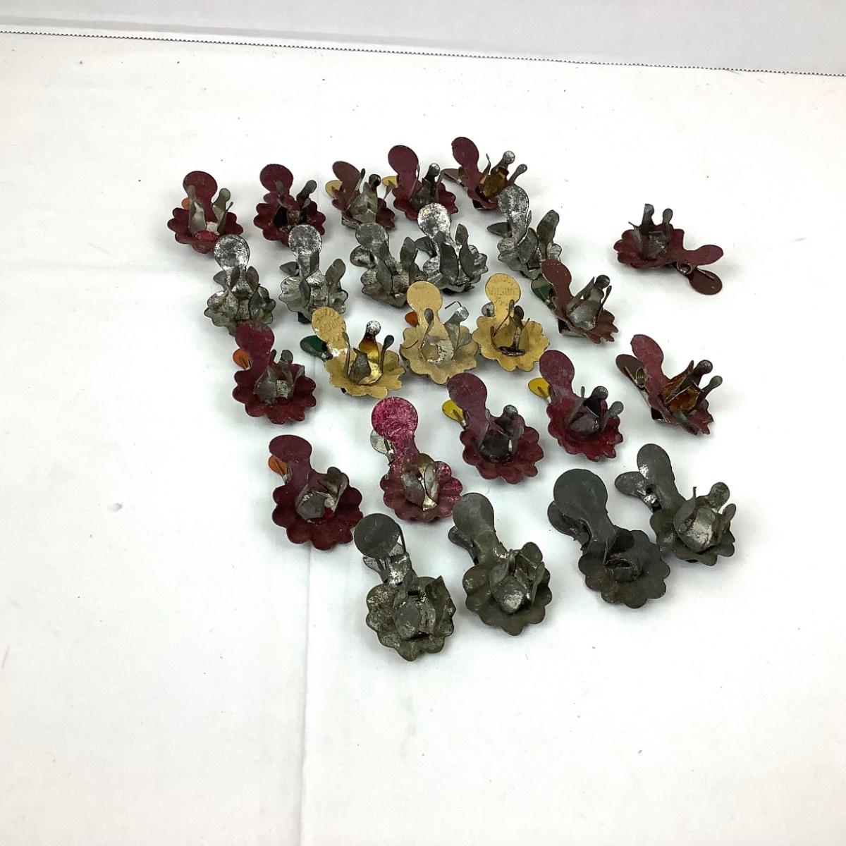 There are 25 tin candle holders to clip on to a tree, they are approximately 1.75" long, various colors and signs of use/wear from age.