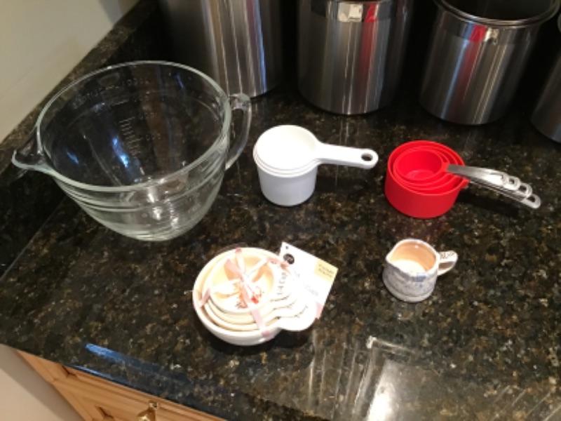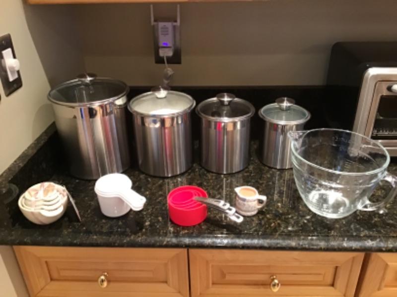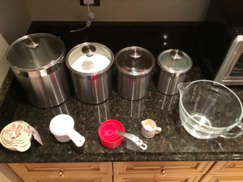 Set of 4 tramontina storage canisters with measuring cups and mini pitcher