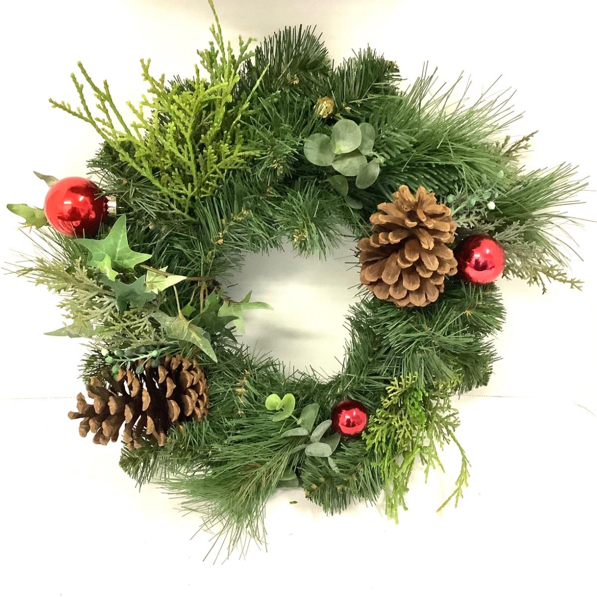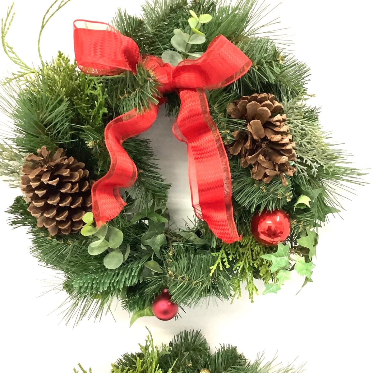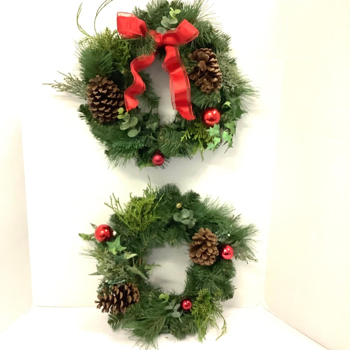 421 Pair of Artificial Pinecone and Red Ball Wreaths
