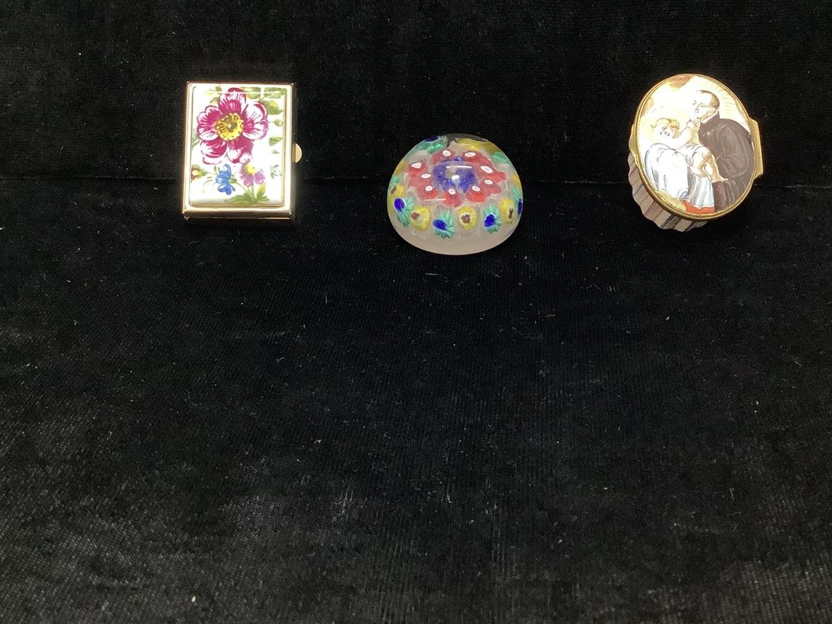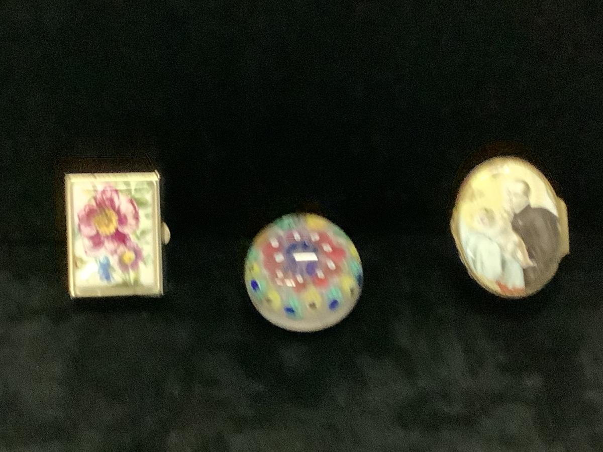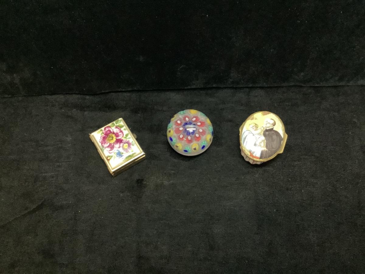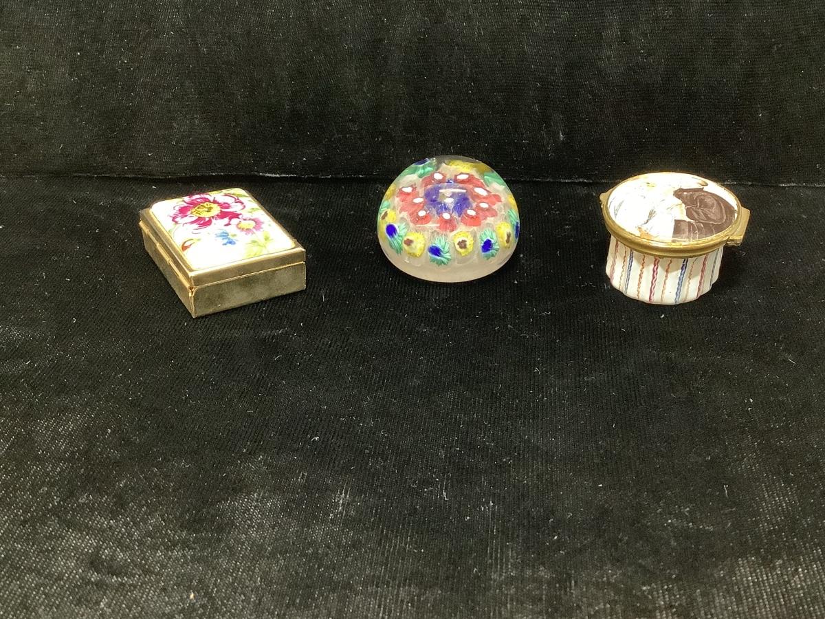421 Pair of Vintage Pill Boxes & One Glass Paperweight