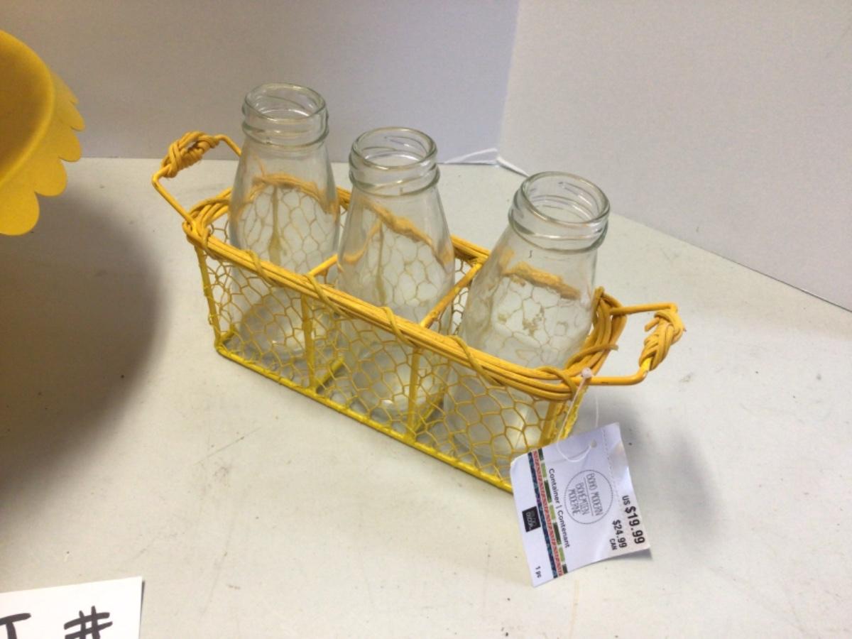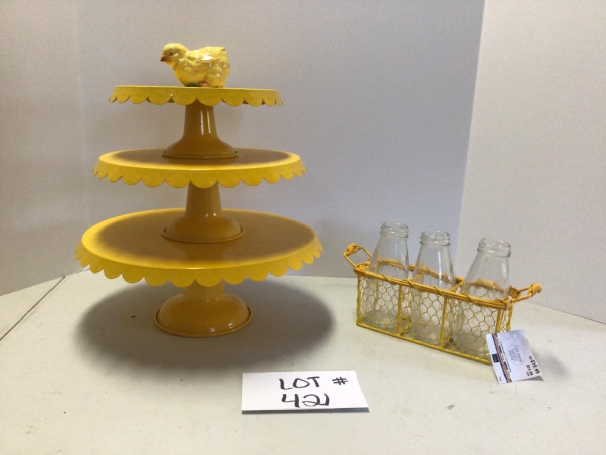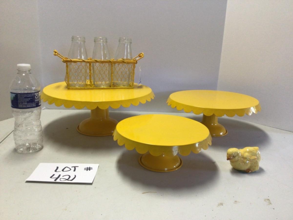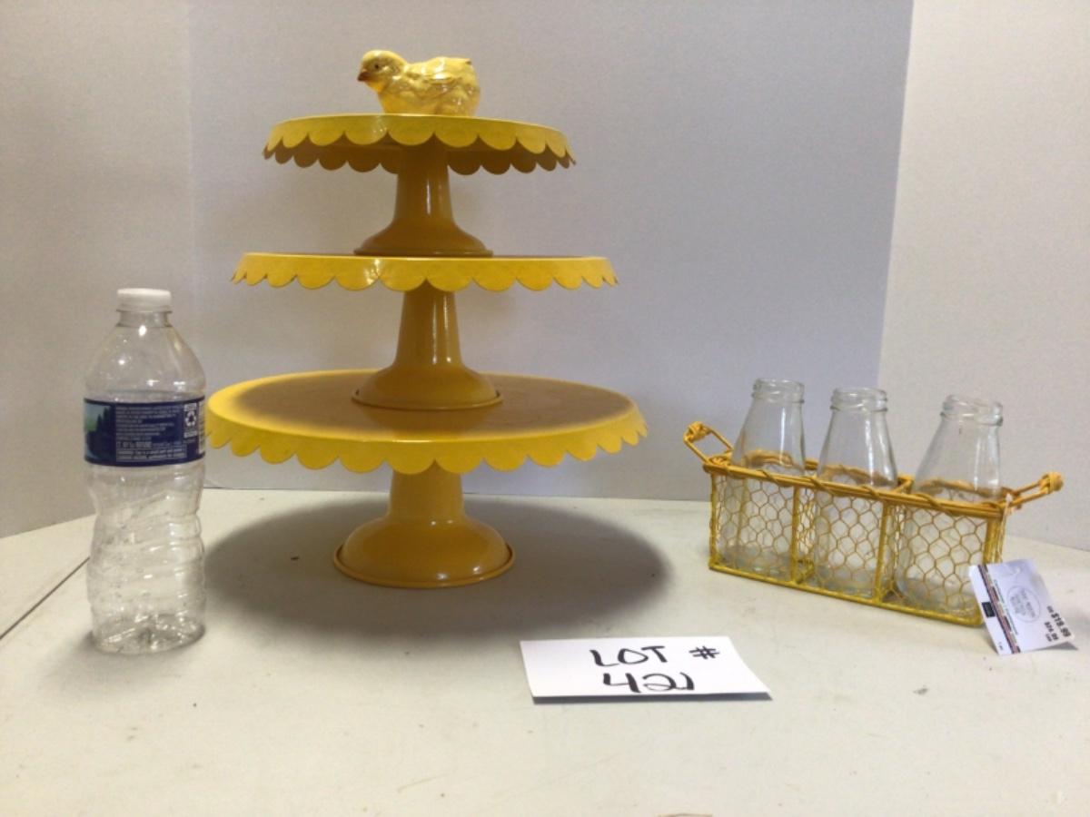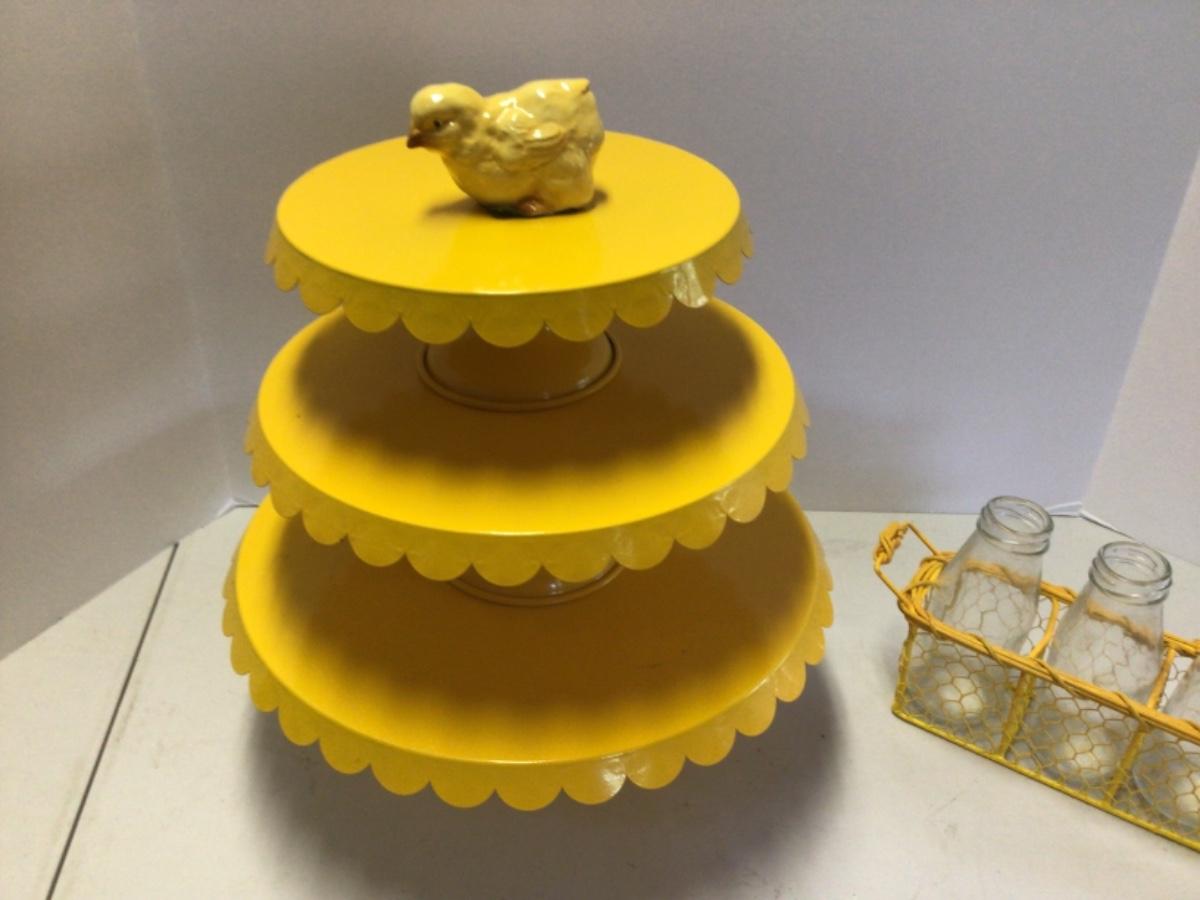 421 Three piece Yellow Metal Cake Stands with Bottles and Chick