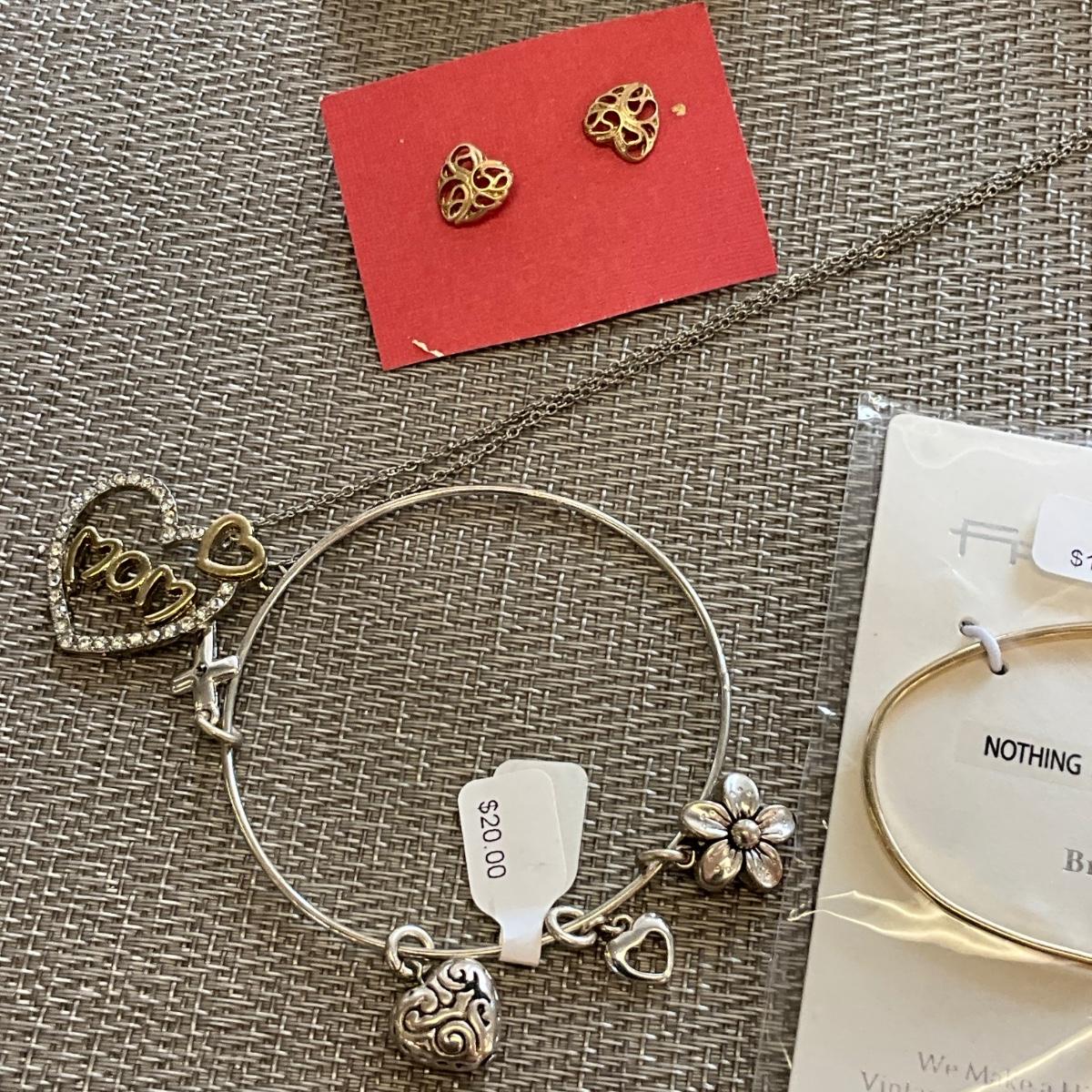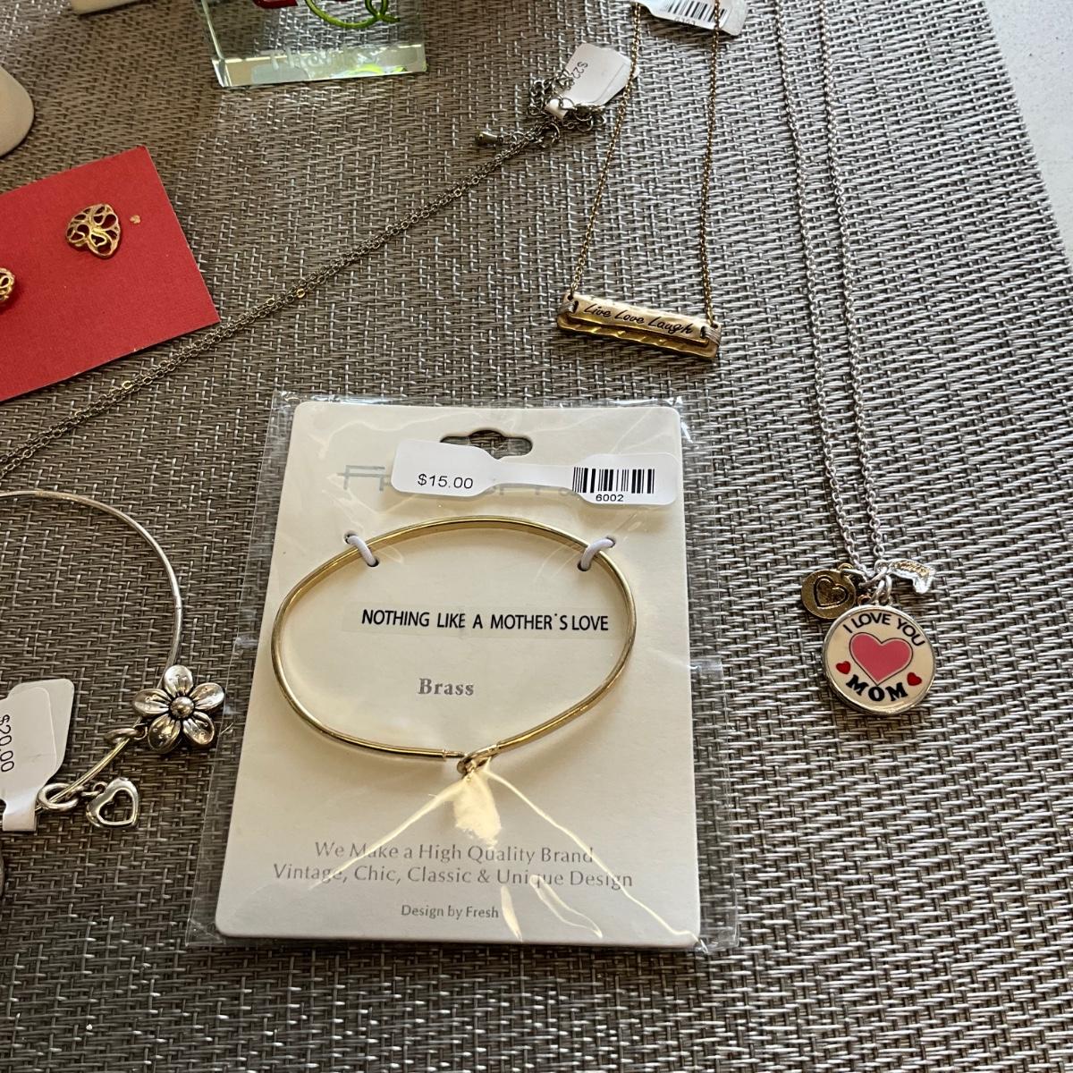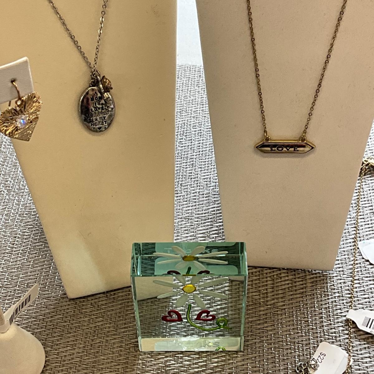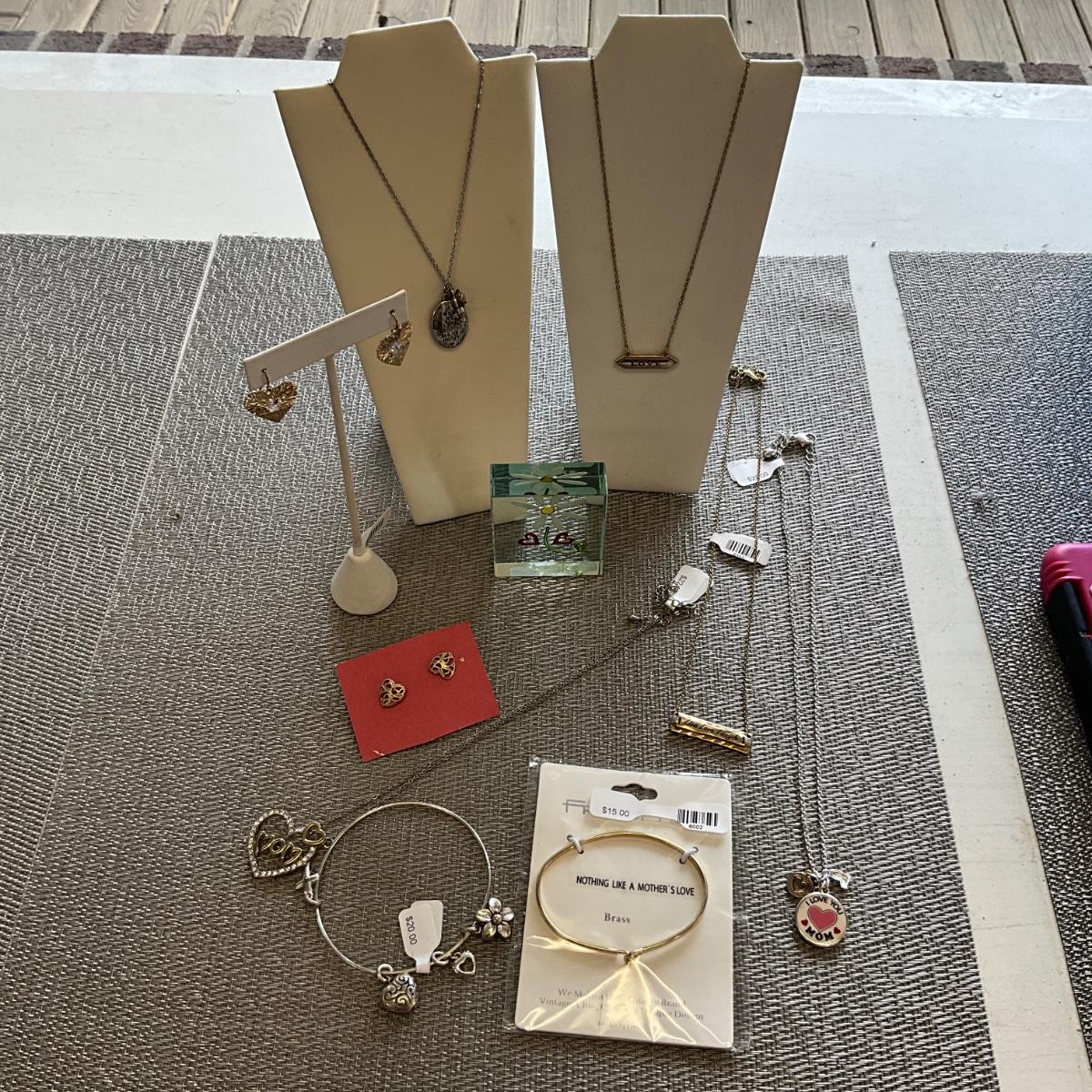 Five necklaces , 2 bracelets , 2 pairs of earrings, one clear acrylic mom paperweight