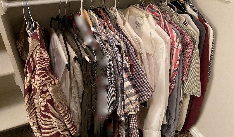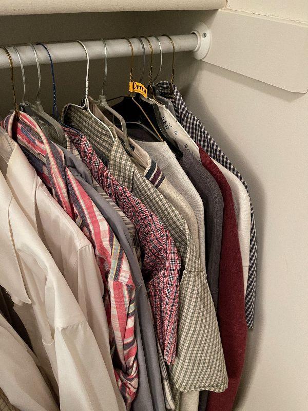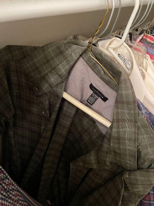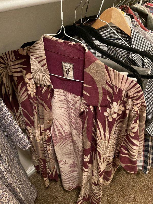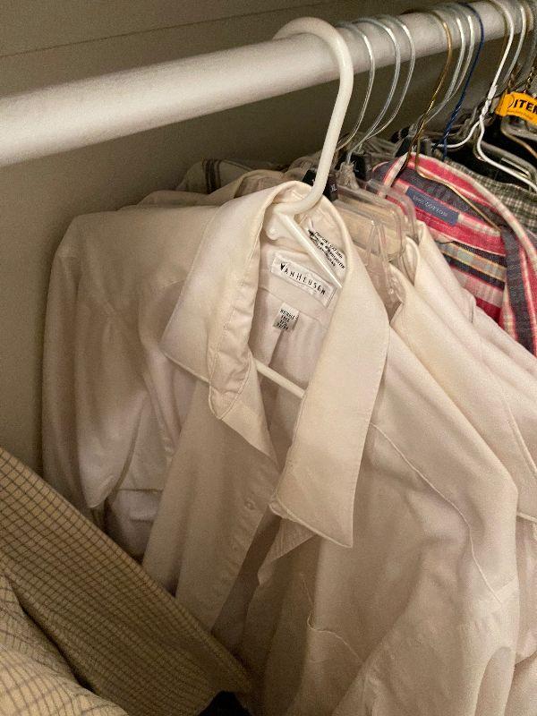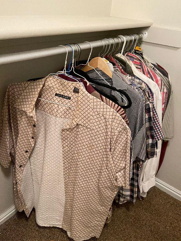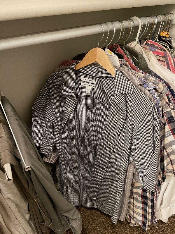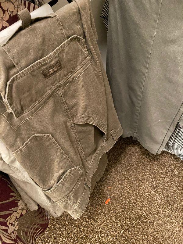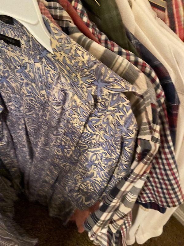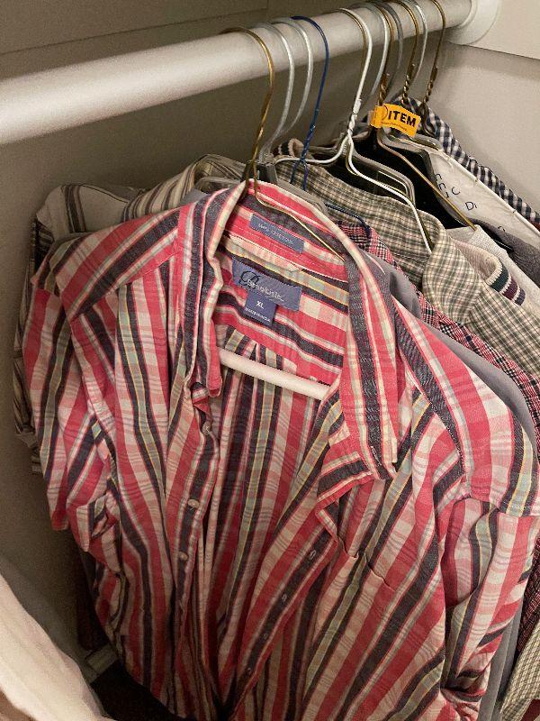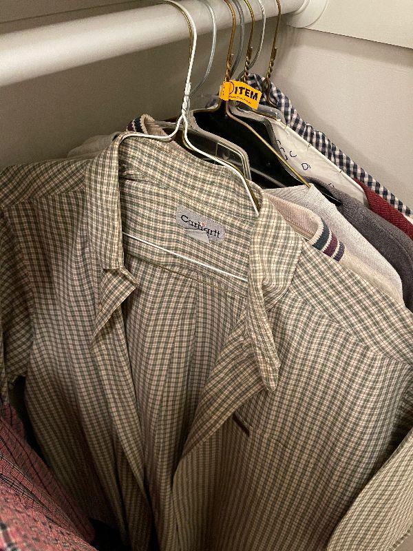 See Photos, Variety of Men's Shirts Marked Size XL . All other Clothing was marked Waist 40 to 42 And Inseam is 30 and XL jackets where not marked.