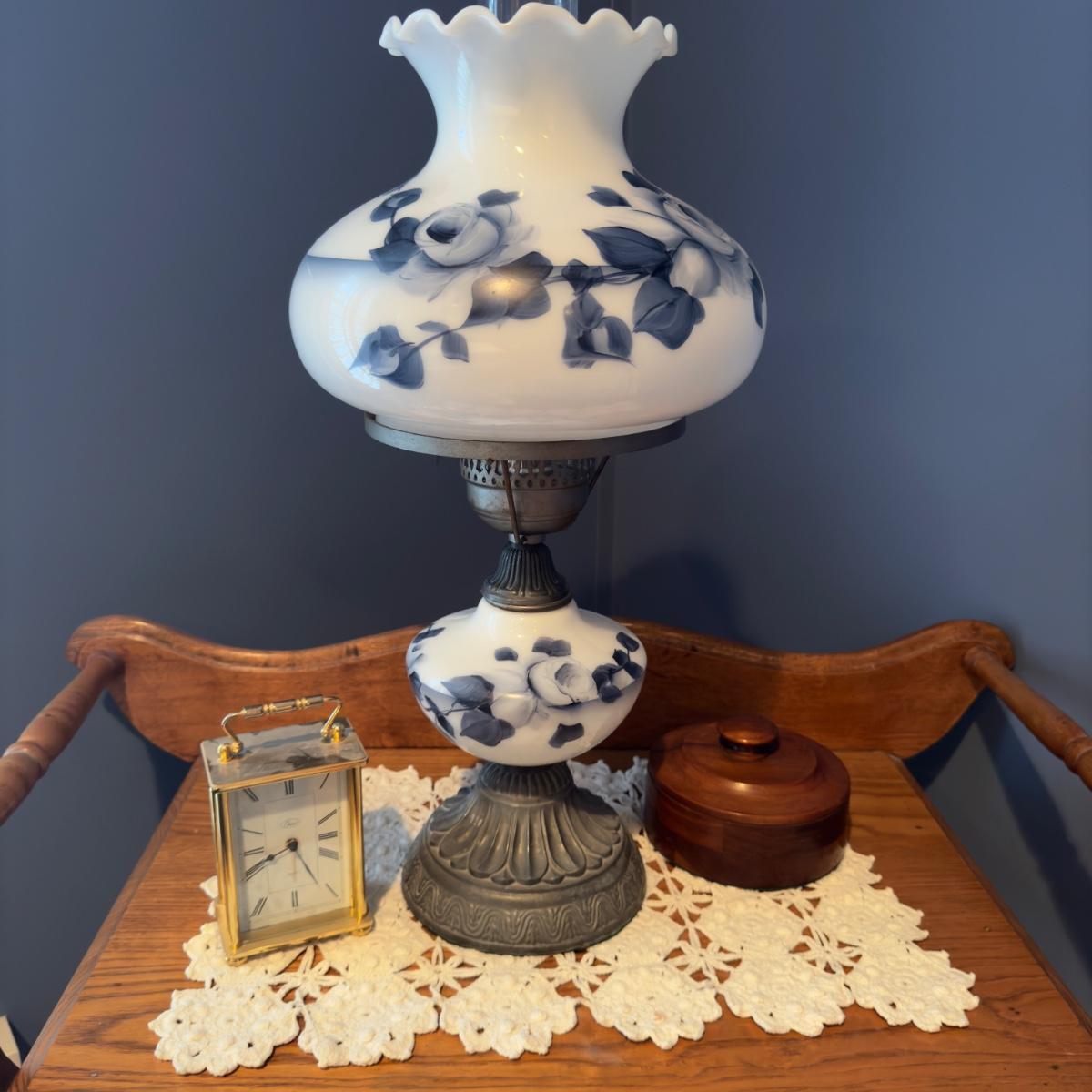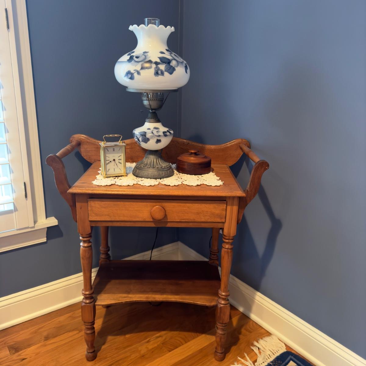 424 Vintage Wash Stand w/Towel Bars, Wooden Bowl and Antique Lamp