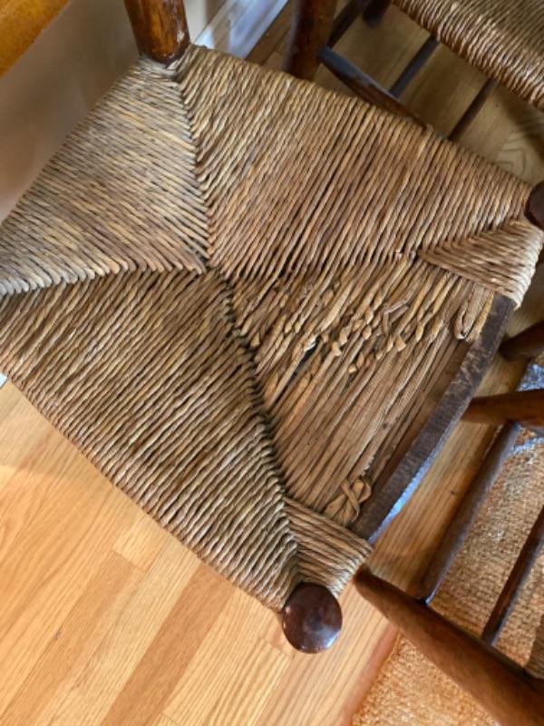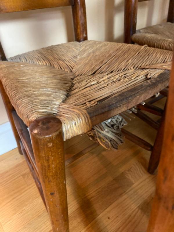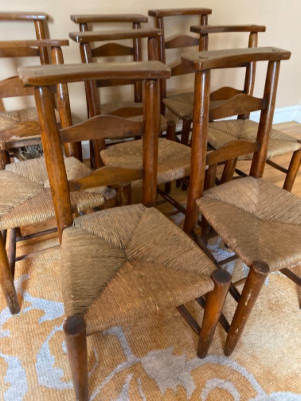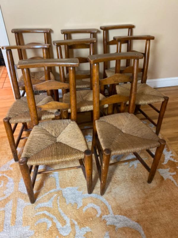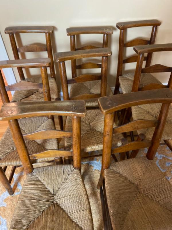 Set of 8 Antique French cock fighting chairs with rush seats (1-damaged)