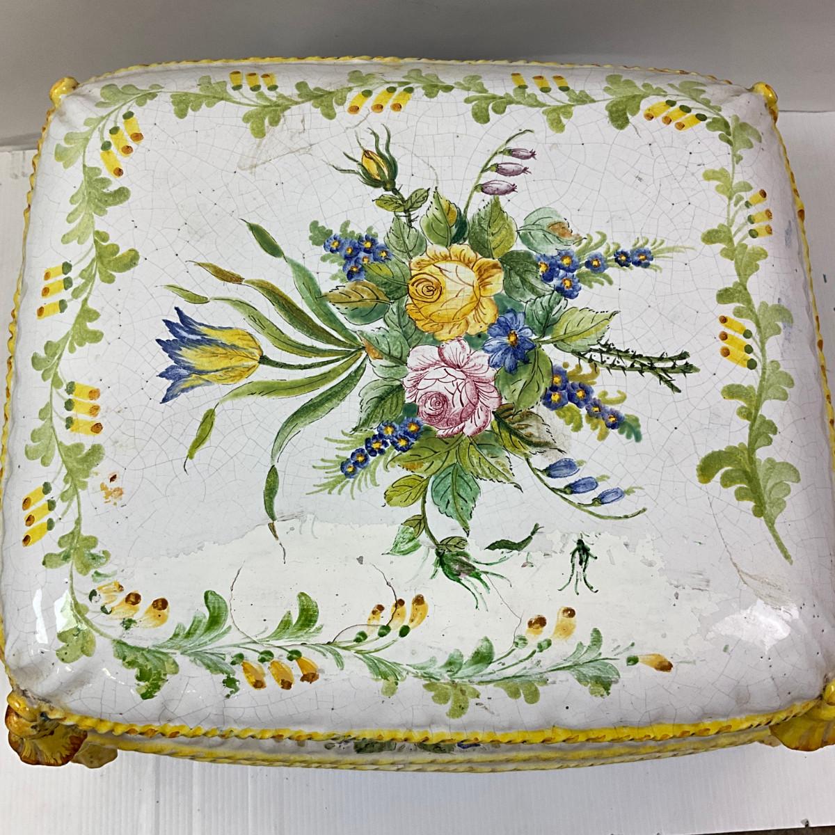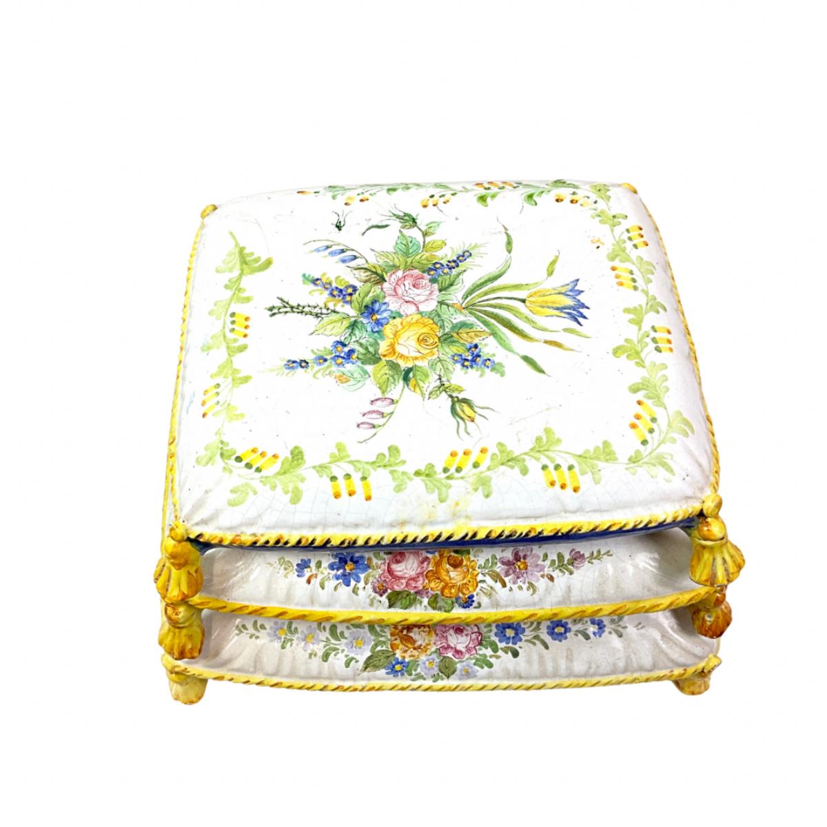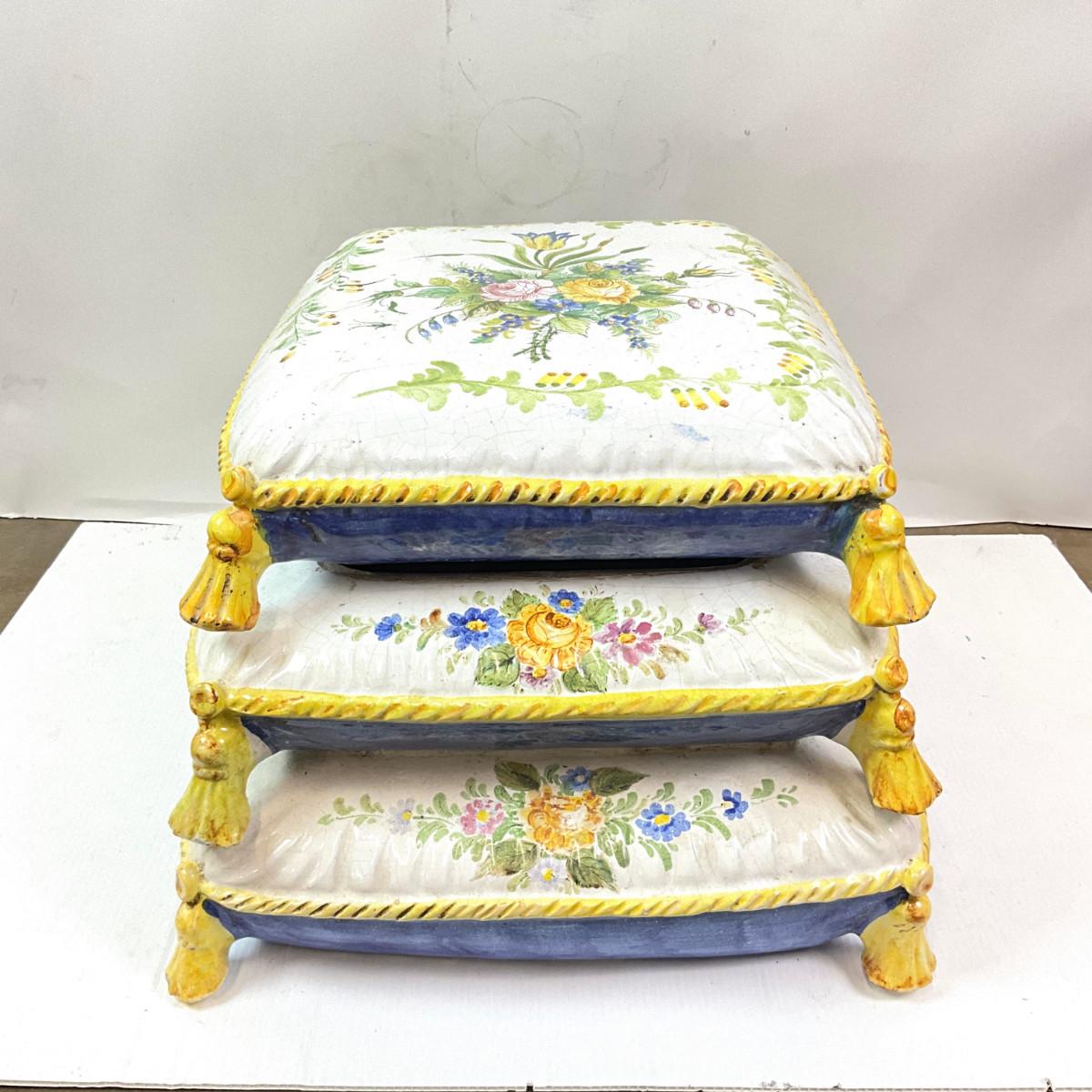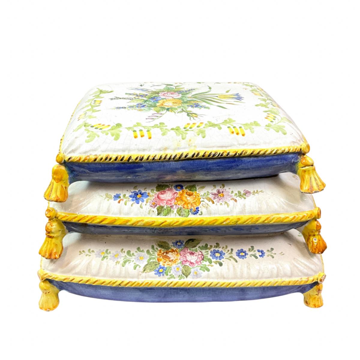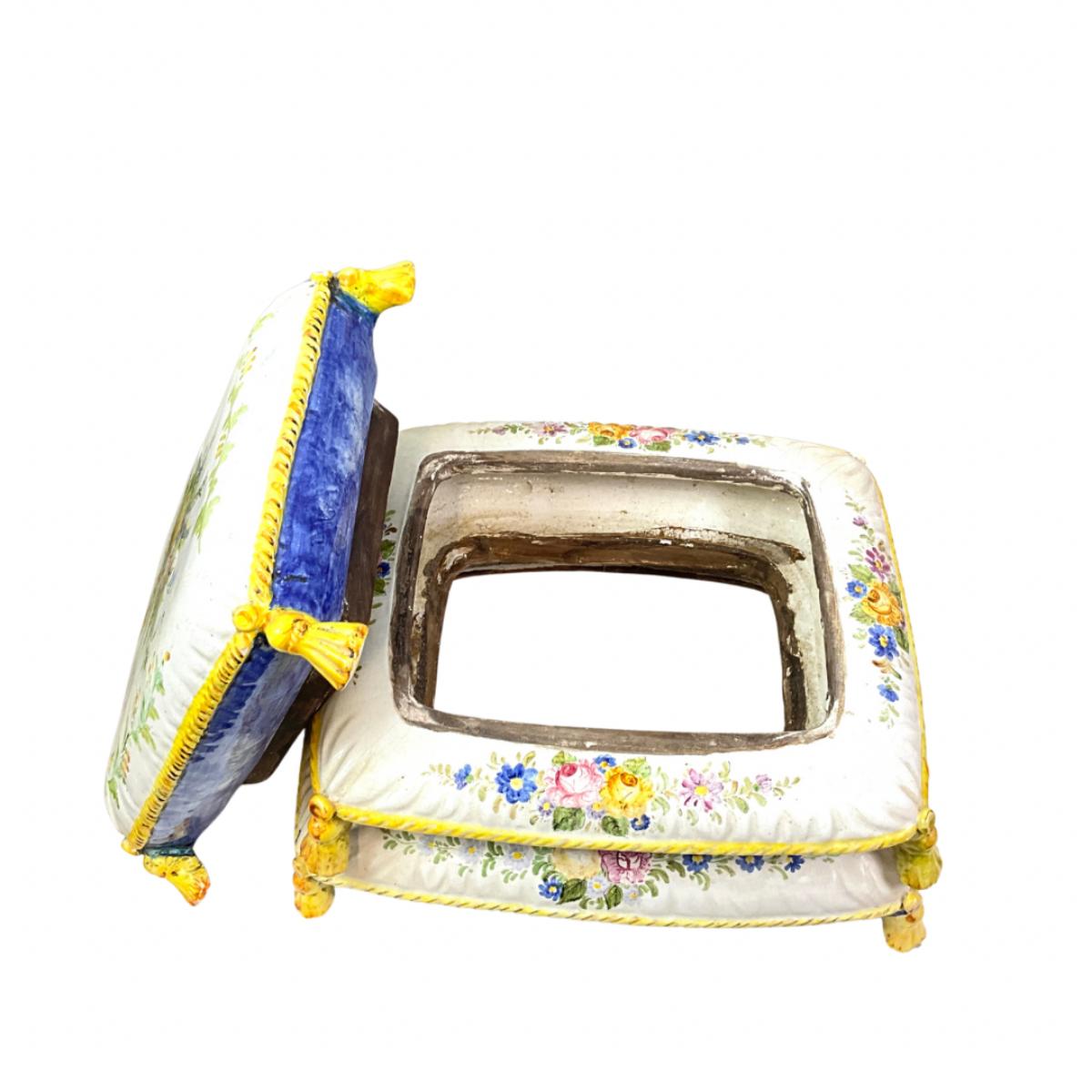 Ceramic and glazed Italian pottery depicting three stacked pillows , top pillow opens up for storage