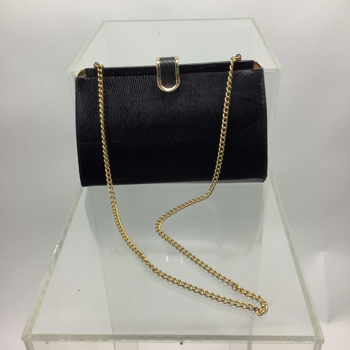 Genuine lizard, gold tone hardware and chain style strap, measures 10" x 7".