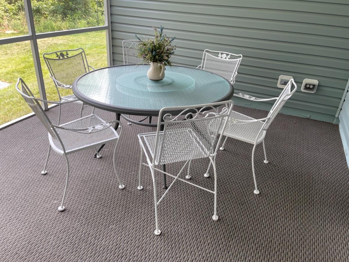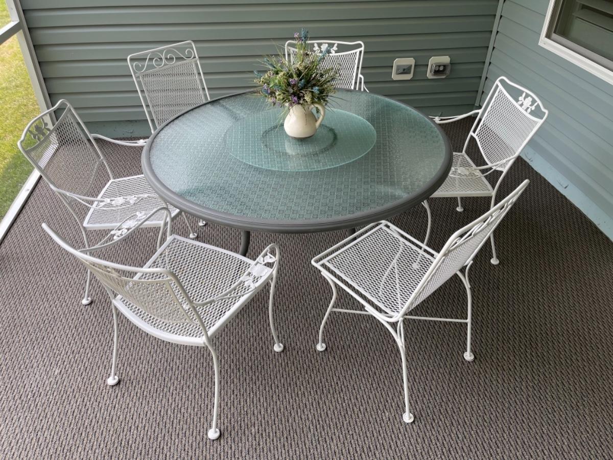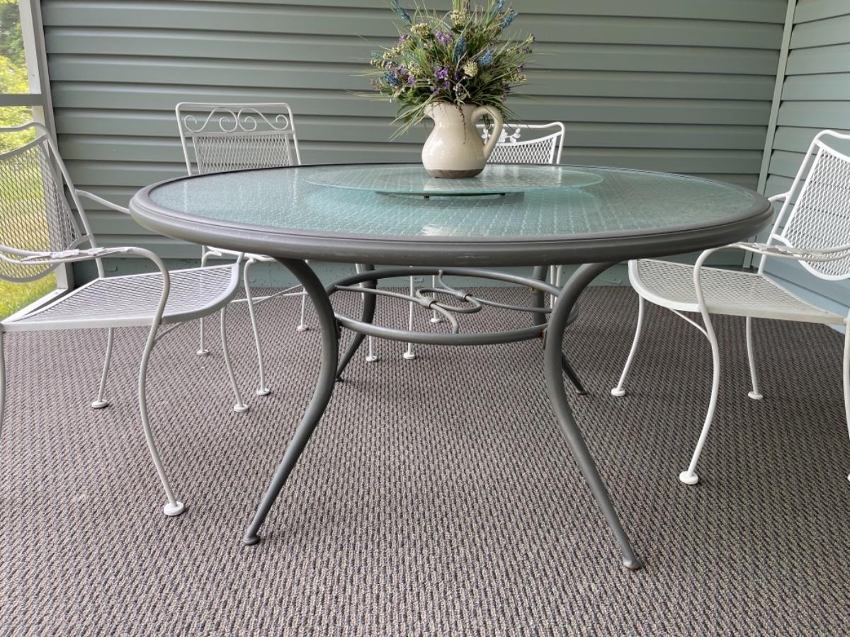 Outdoor round aluminum tempered glass top table with a lazy Susan. Measuring approximately 48” round. There are 6 wrought iron chairs 4- arm and 2- regular. And one large umbrella with stand. NOTE: The Lazy Susan bottom plastic round roller assembly will need to be replaced/damaged/missing rollers.
