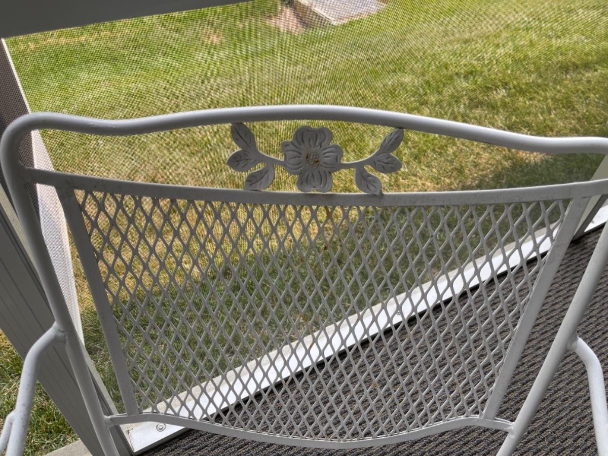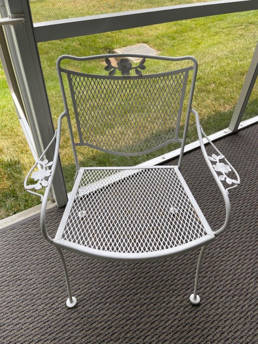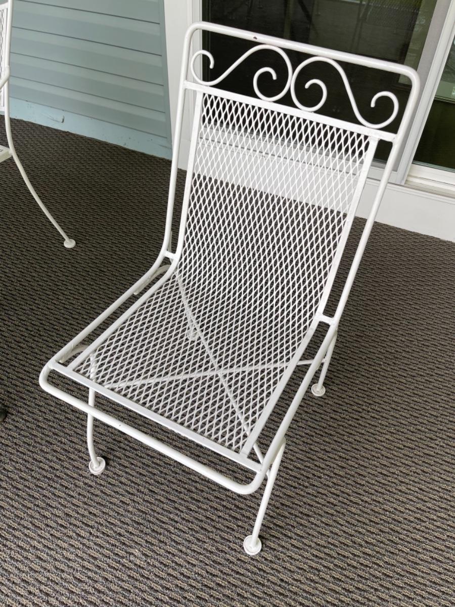 Outdoor round aluminum tempered glass top table with a lazy Susan. Measuring approximately 48” round. There are 6 wrought iron chairs 4- arm and 2- regular. And one large umbrella with stand. NOTE: The Lazy Susan bottom plastic round roller assembly will need to be replaced/damaged/missing rollers.