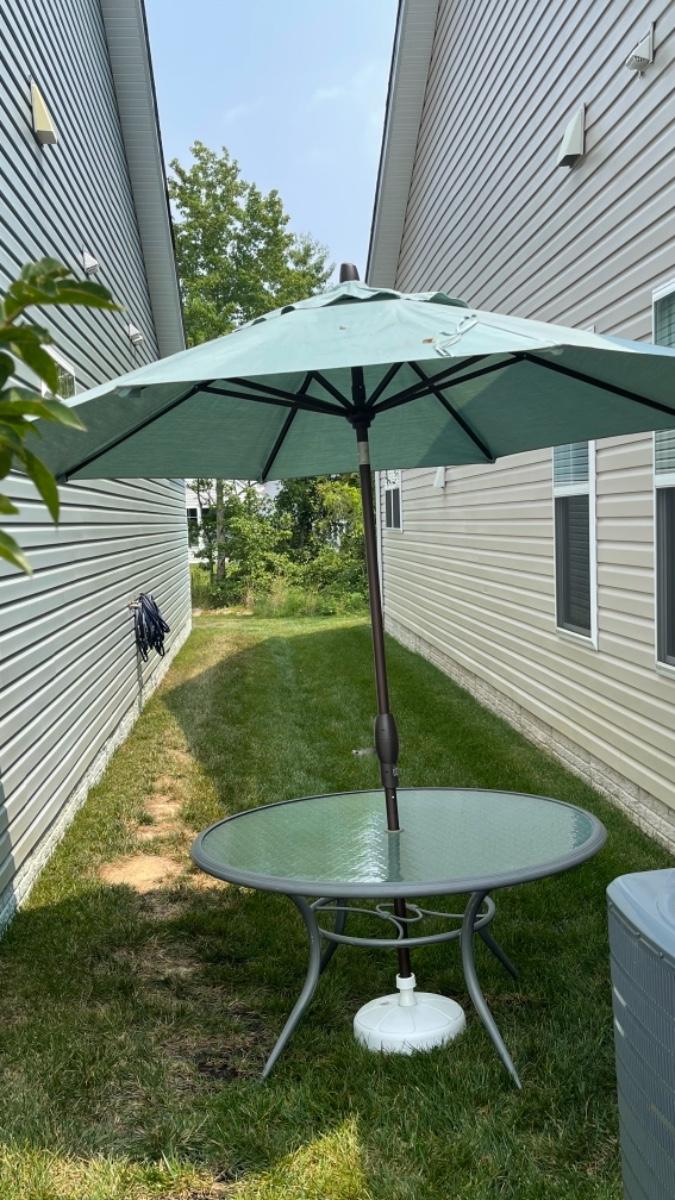 429 8 pc Outdoor Table and Chair Set With Light Green Umbrella and Stand