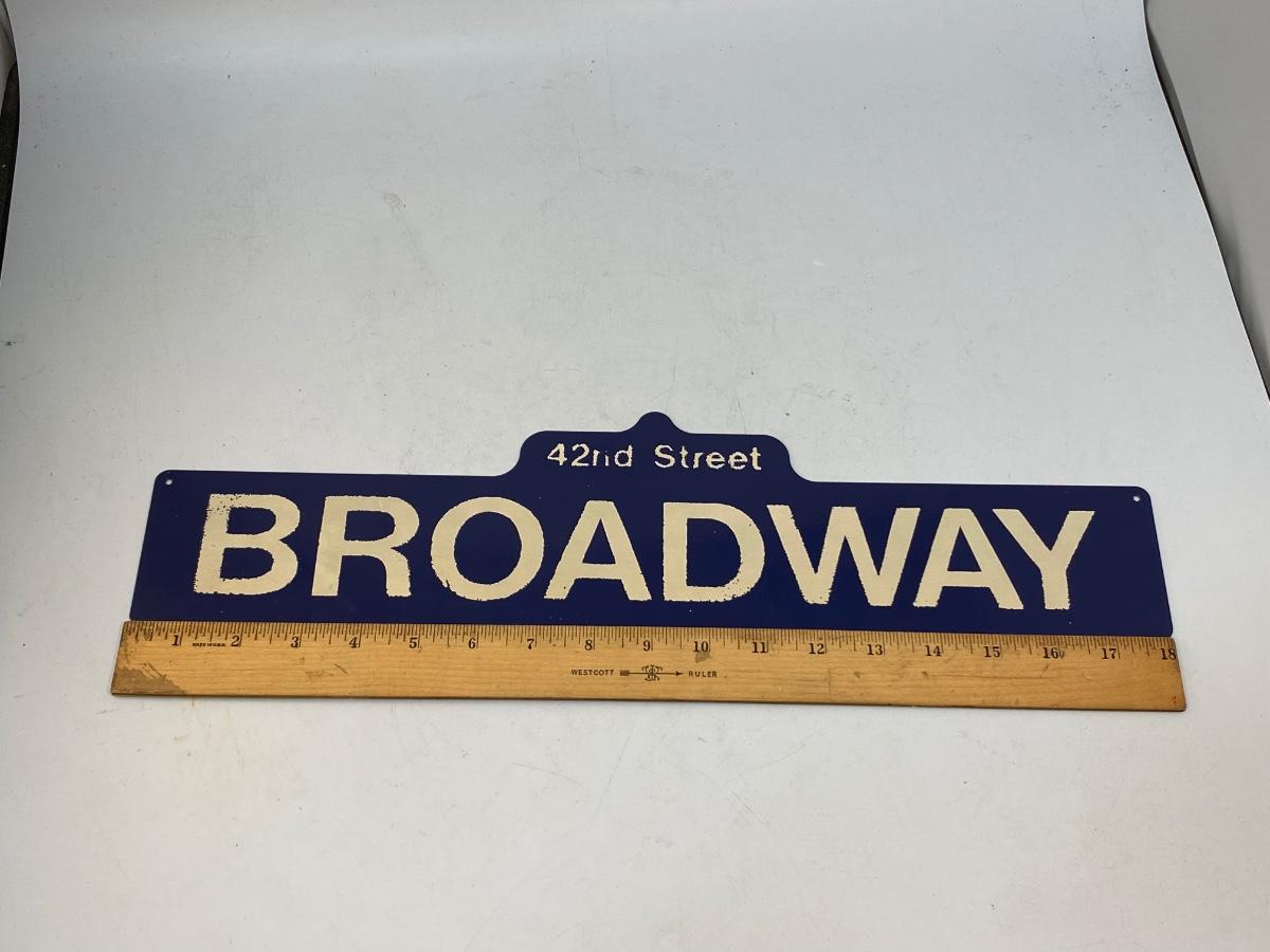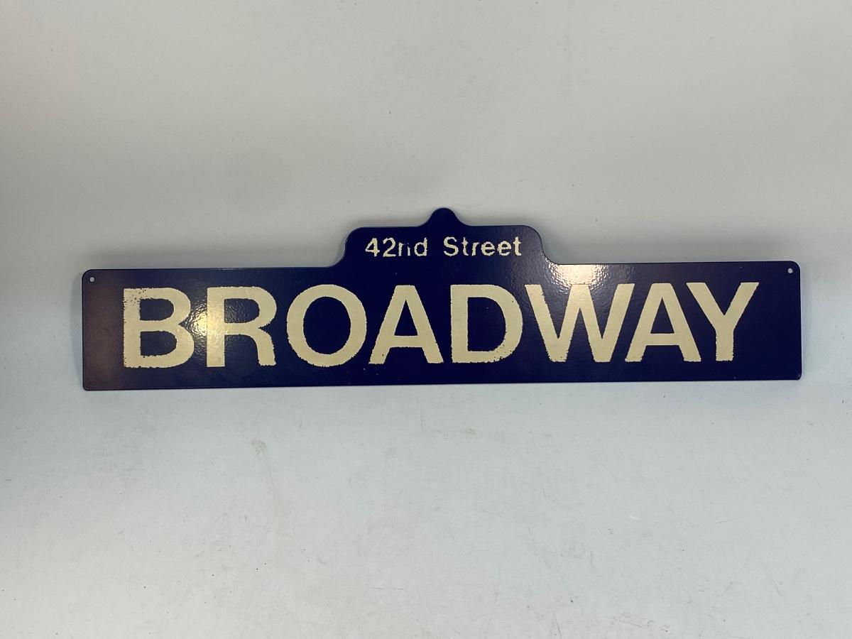 42nd Street & Broadway Reproduction Street Sign. Light wear but in displayable condition. There is a small hole in each end for hanging.