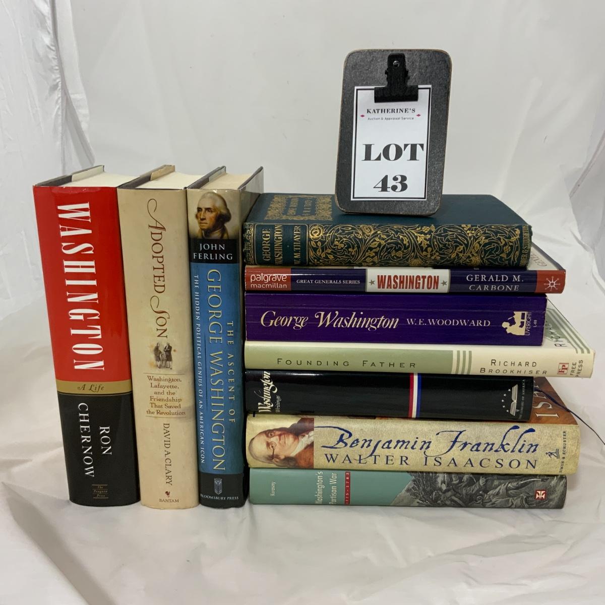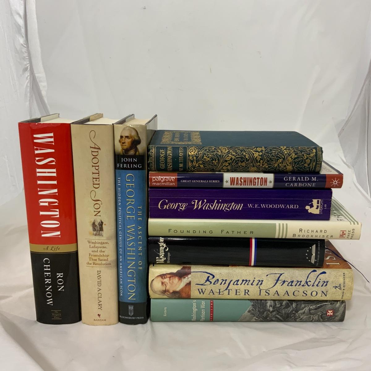From the Estate of Peter Radovanovich: Ten Books about the life and times of George Washington and Benjamin Franklin. Washington; A Life by Ron Chernow | The Ascent of George Washington by John Ferling | Adopted Son; Washington, Lafayette and the Friendship that Saved the Revolution by David A Clary | George Washington by W.M. Thayer | Washington Lessons in Leadership by Gerald M Carbone | George Washington the Image and the Man by W.E. Woodward | Founding Father; Rediscovering Washington by Richard Brookhiser | Washington Writings edited by John Rhodehamel | Benjamin Franklin; an American Life by Walter Isaacson | Washington’s Partisan War by Mark V Kwasny. All books are in excellent used condition and would be a lovely addition to any library. Please see photos for details and condition. ::: Shipping is available on this lot. If you require shipping you must let us know at the close of the auction. We will coordinate with you after the item has been won. Shipping fees will include insurance up to or exceeding the value of all items being mailed. If you have any questions regarding this lot please contact the auctioneer either via this website, by direct email or by phone. PICK UP TIMES and other important information can be found in the TERMS and DESCRIPTION of the auction. Please take a look for pertinent information. Thanks!