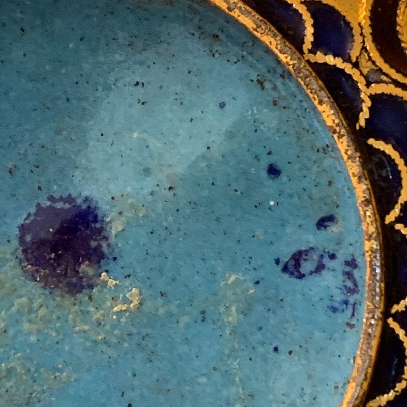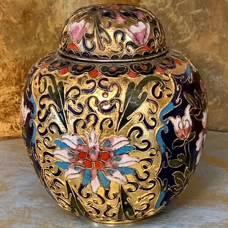 Decorative ginger jar, applied cloisonne like designs, enamel. Garish colors