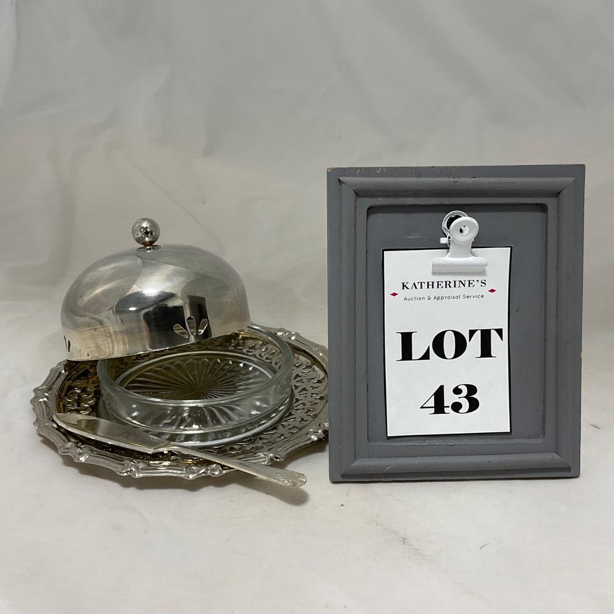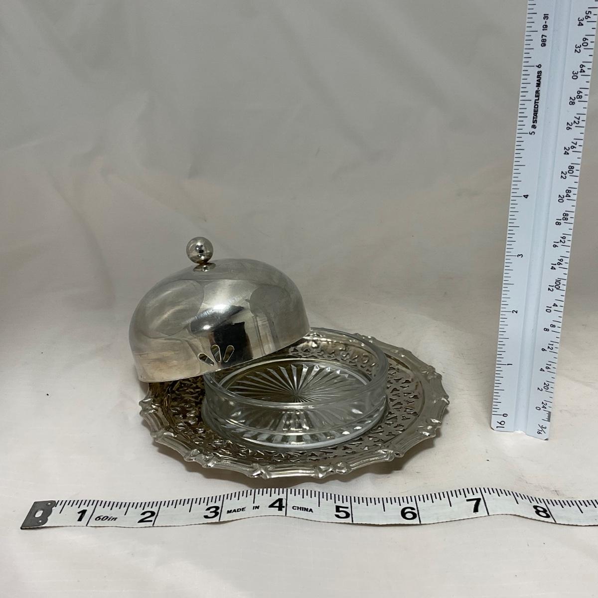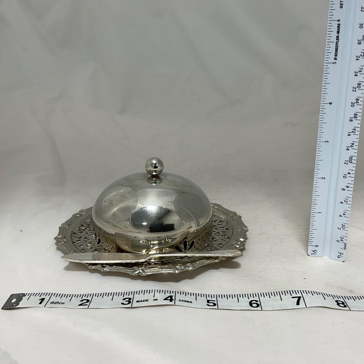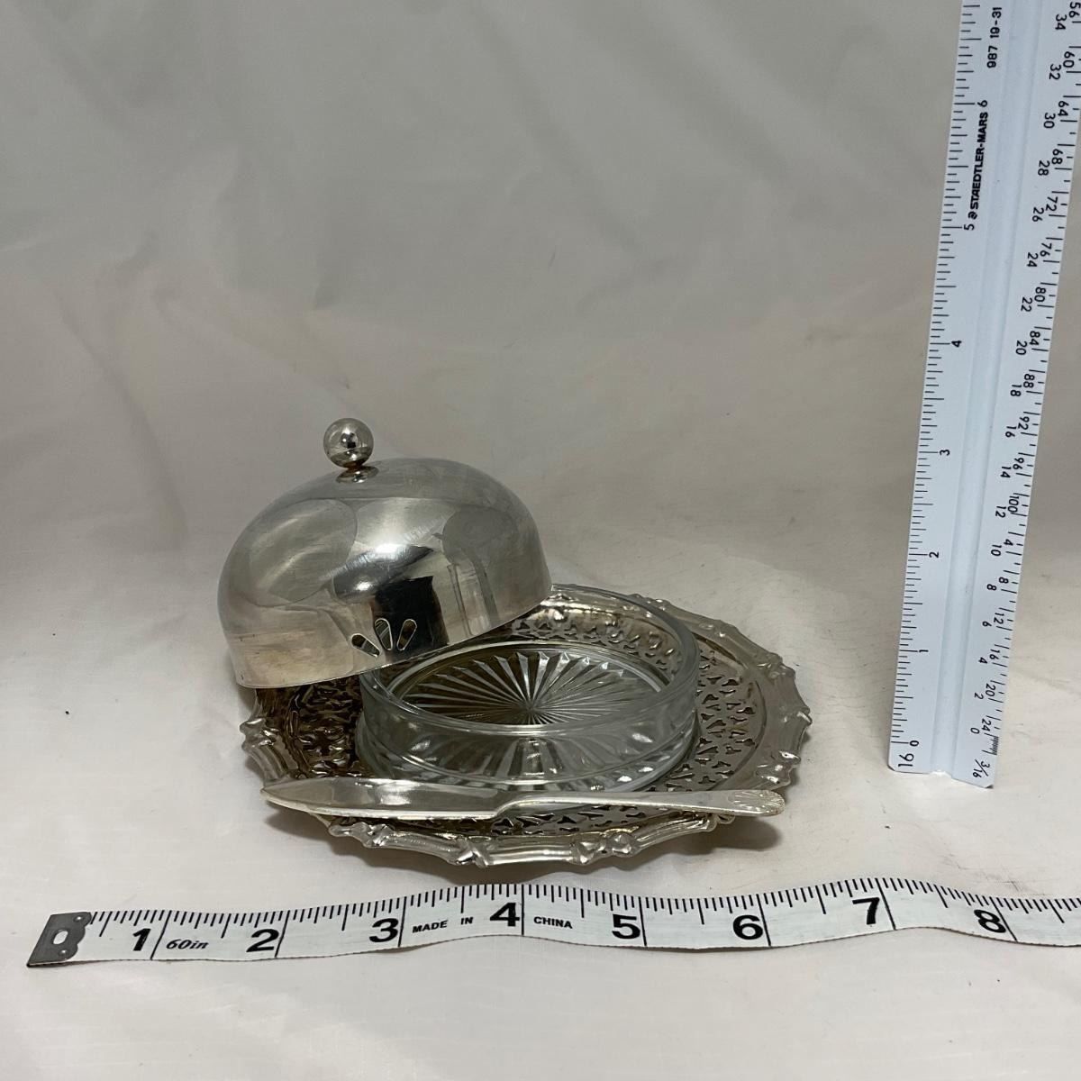 One covered intricate designed butter dish with glass bottom dish insert and serving knife. Please see photos for details and condition. ::: Shipping is available on this lot. If you require shipping you must let us know at the close of the auction. We will coordinate with you after the item has been won. Shipping fees will include insurance up to or exceeding the value of all items being mailed. If you have any questions regarding this lot please contact the auctioneer either via this website, by direct email or by phone. PICK UP TIMES and other important information can be found in the TERMS and DESCRIPTION of the auction. Please take a look for pertinent information. Thanks!