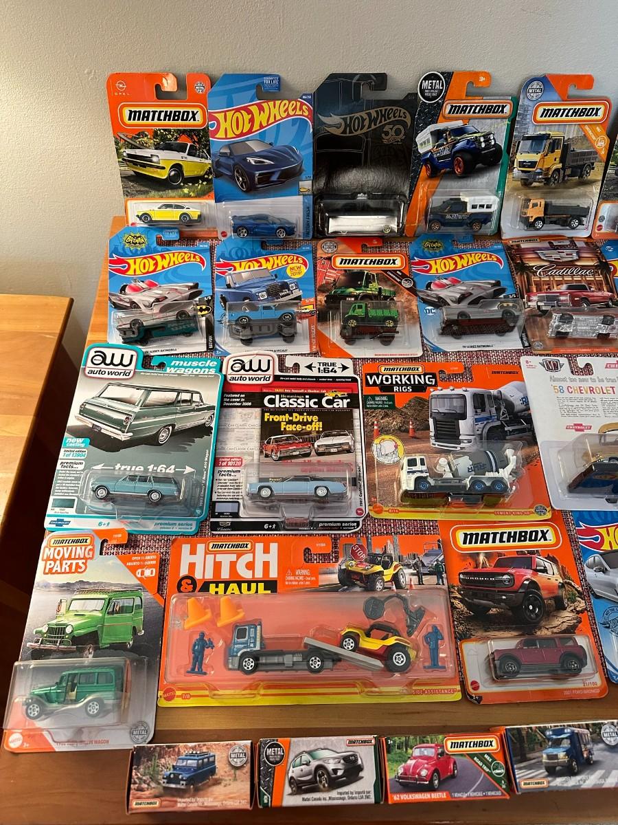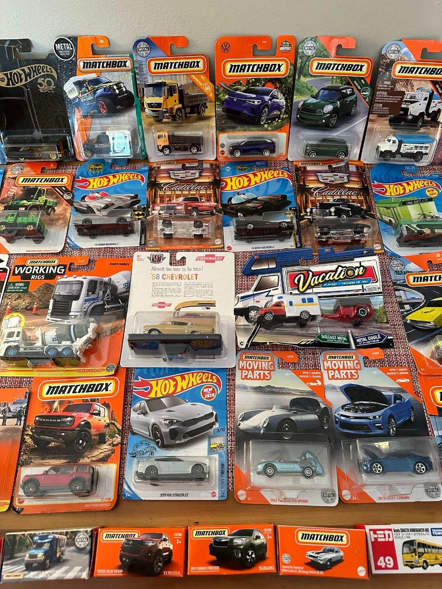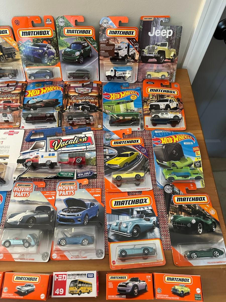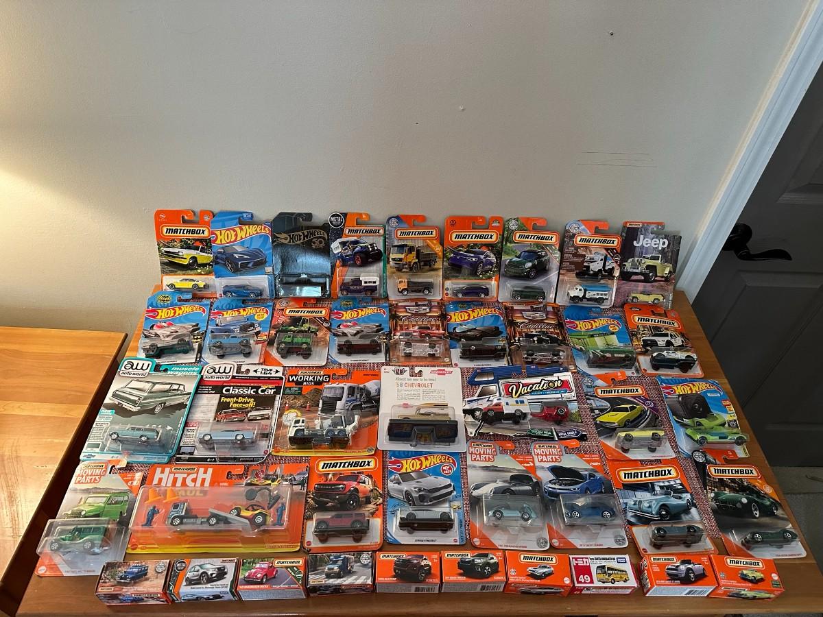 Assorted Hot Wheels, Matchbox, and other toy cars, new in package