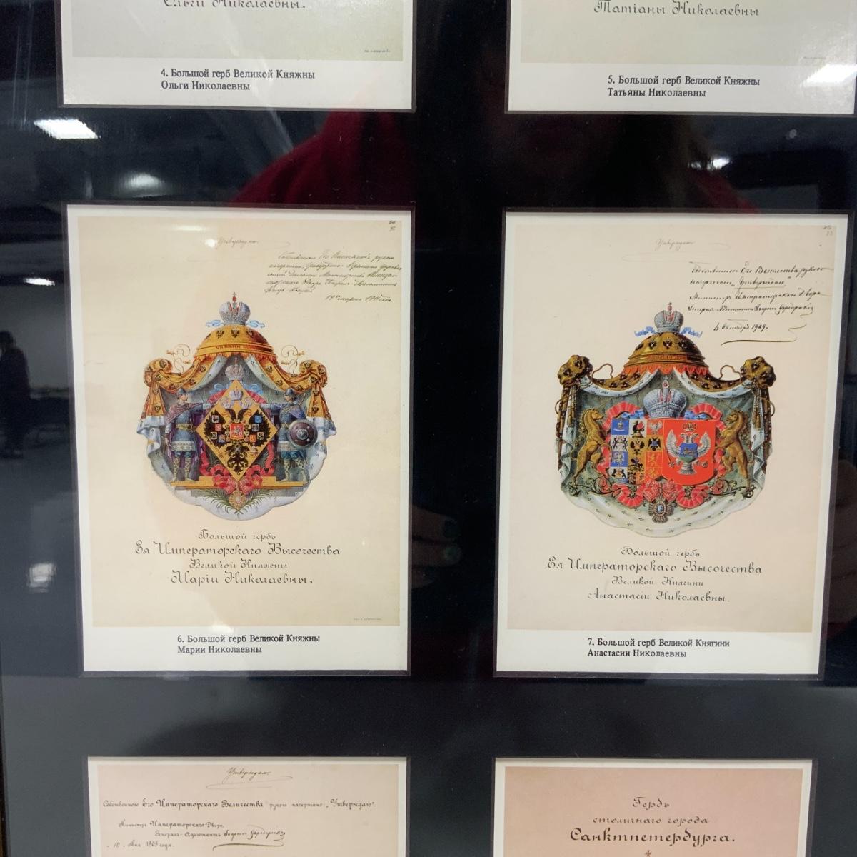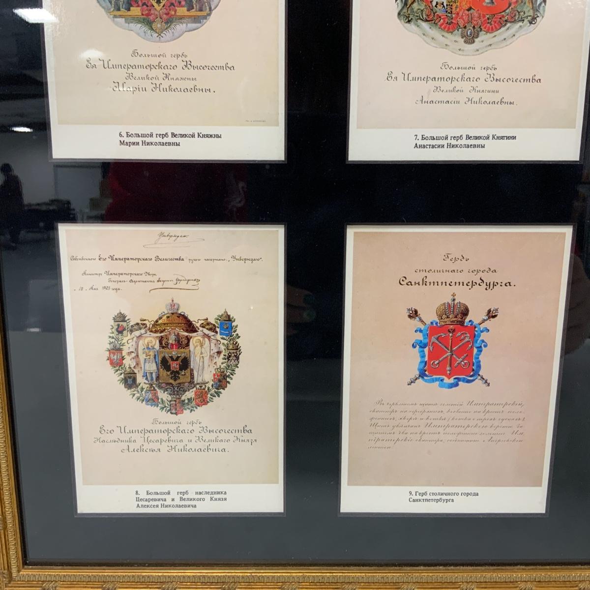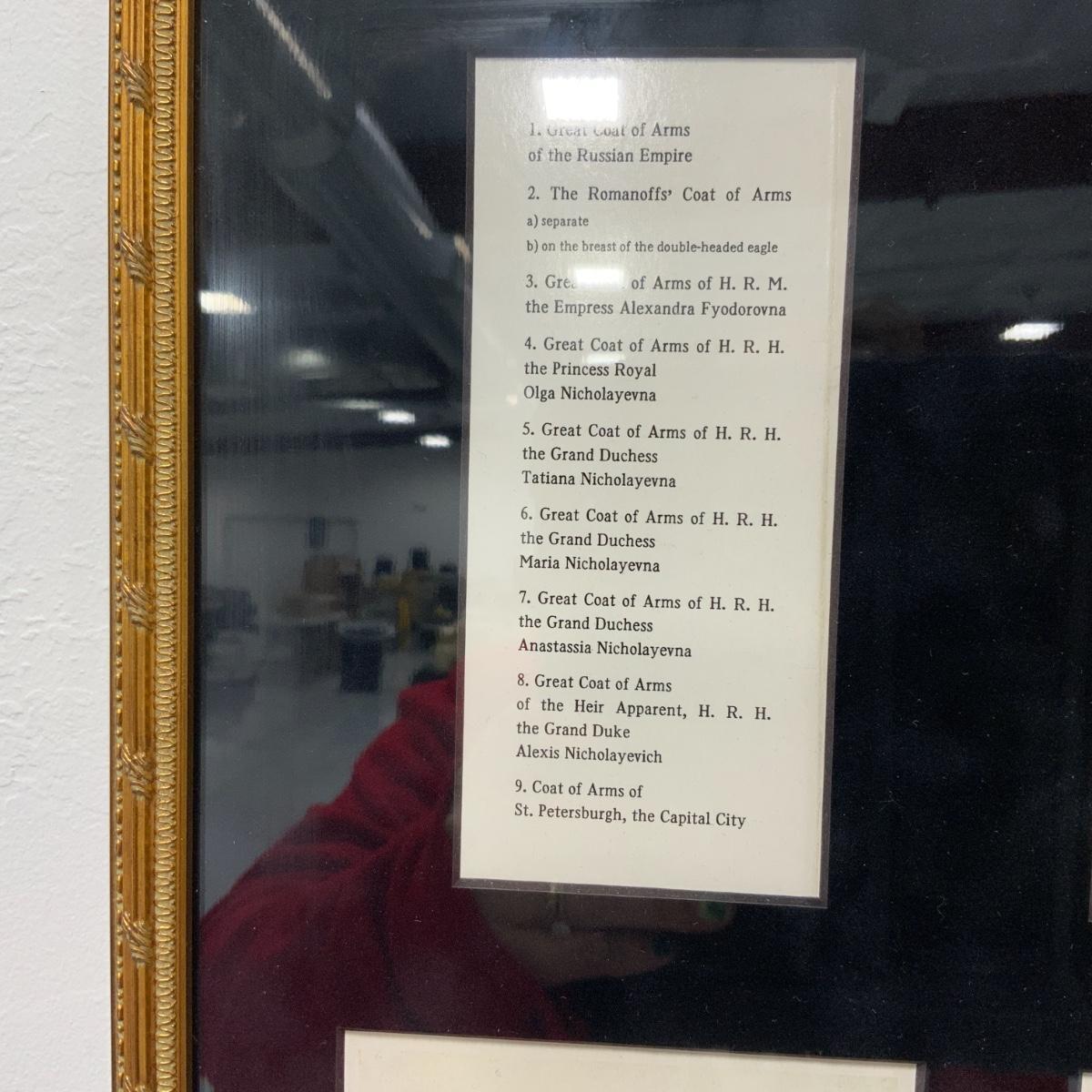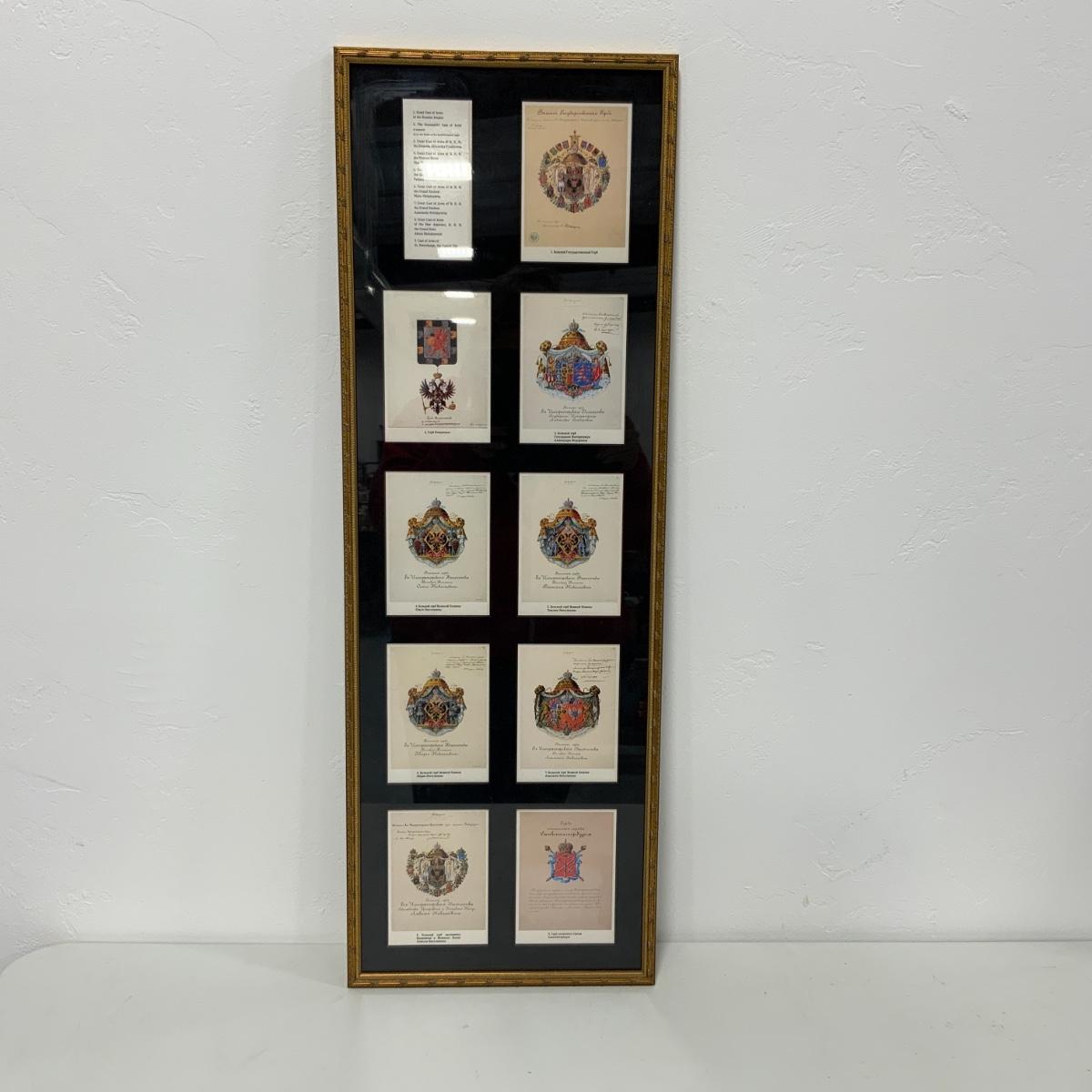 From the Estate of Peter and Alice Radovanovich: A stately print of a painting by Earnest Lipgart of Czar Nicholas II. It shows the Czar inside the residence and is circa 1900. Frame and picture are in excellent condition. Frame measures 18.25” x 12.5”. // Beautifully Framed Postcard Collection with Coats of Arms from the Russian Empire. Conveniently has a translation in the top left corner for those of us that cannot read Russian. Framed under conservation glass by a reputable local frame shop. The reverse of the frame has an attachment with the folder that the postcards came in. Frame measures 36” tall and 12.25” wide. Please see photos for details and condition. ::: Shipping is available on this lot. If you require shipping you must let us know at the close of the auction. We will coordinate with you after the item has been won. Shipping fees will include insurance up to or exceeding the value of all items being mailed. If you have any questions regarding this lot please contact the auctioneer either via this website, by direct email or by phone. PICK UP TIMES and other important information can be found in the TERMS and DESCRIPTION of the auction. Please take a look for pertinent information. Thanks!