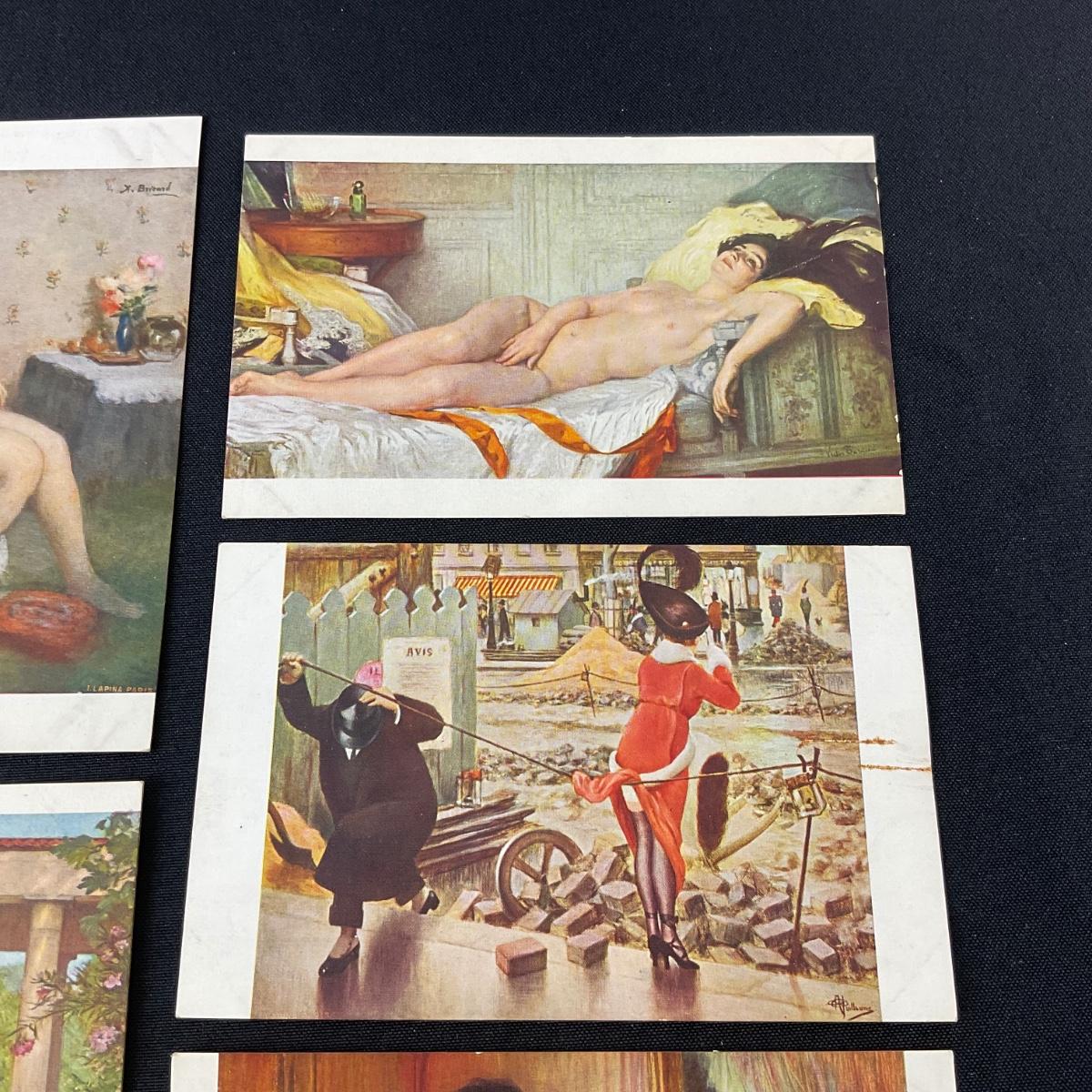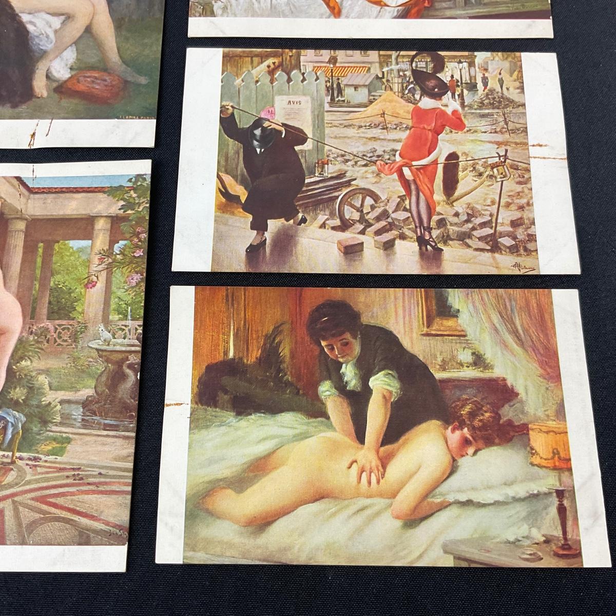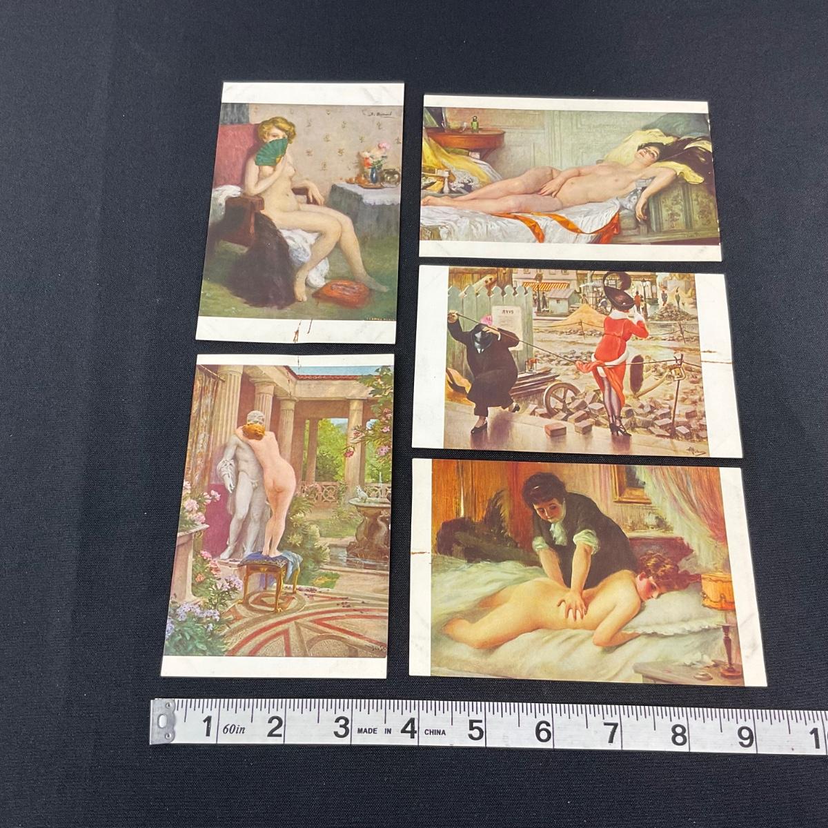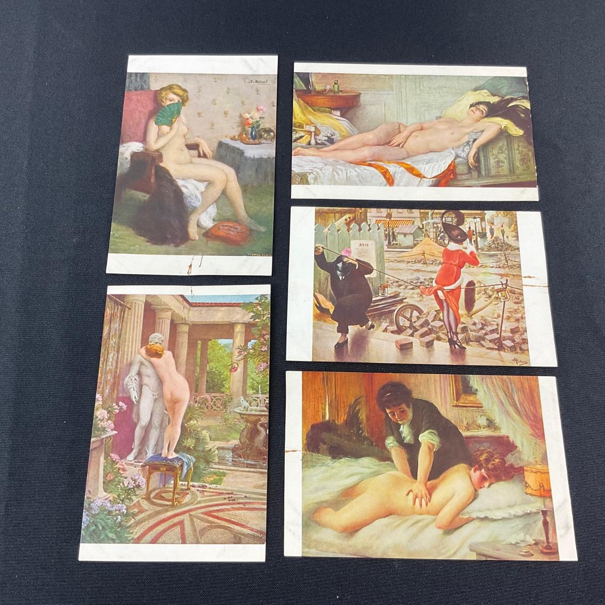 Five vintage risqué art nouveau style postcards. Please see photos for details and condition. Any condition statement is given as a courtesy to a client, is an opinion, and should not be treated as a statement of fact. Reference to condition written, oral or within a condition report shall not be regarded as a full account of condition and may not include all defects, alterations, or restorations. Absence of a condition report does not imply a lot is flawless or lacking imperfections or damage. Katherine’s Auction & Appraisal Service shall have no responsibility for any error or omission. Returns shall not be accepted on the basis of condition. ::: Shipping is available on this lot. If you require shipping you must let us know at the close of the auction. We will coordinate with you after the item has been won. Shipping fees will include insurance up to or exceeding the value of all items being mailed. If you have any questions regarding this lot please contact the auctioneer either via this website, by direct email or by phone. PICK UP TIMES and other important information can be found in the TERMS and DESCRIPTION of the auction. Please take a look for pertinent information. Thanks!