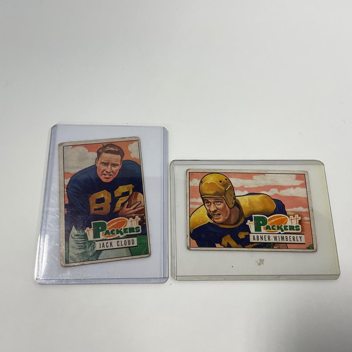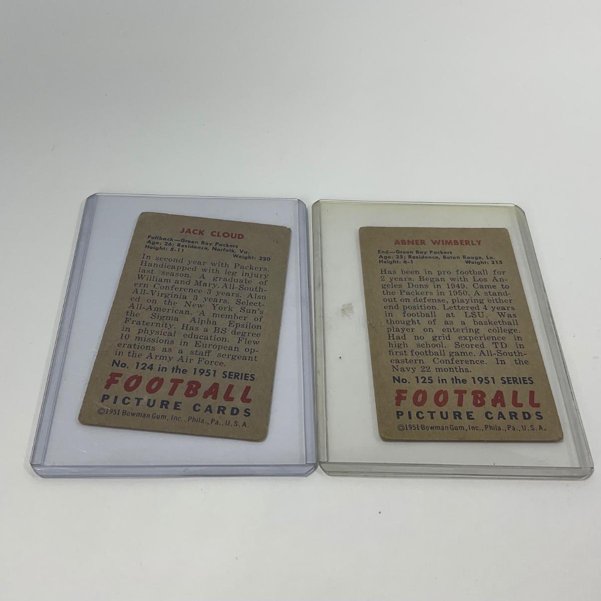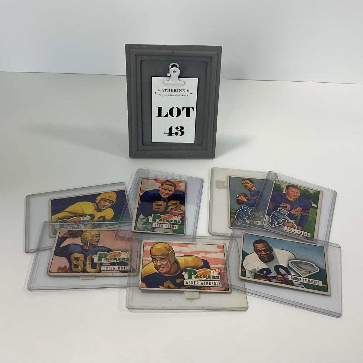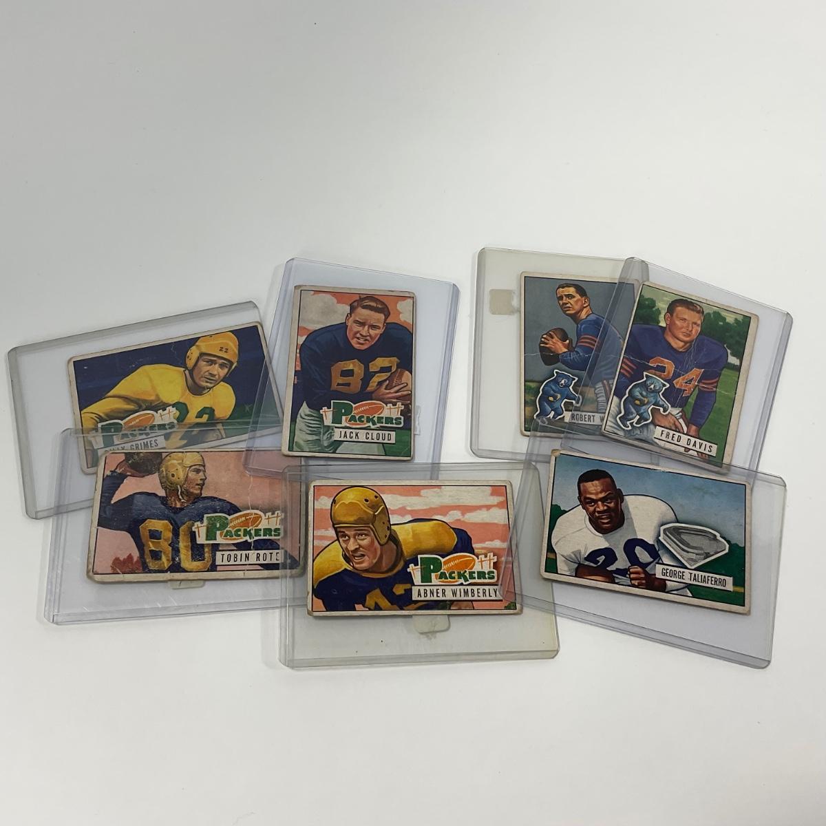 Seven vintage 1951 Bowman football cards in plastic sleeves. Please see photos for details and condition. ::: Shipping is available on this lot. If you require shipping you must let us know at the close of the auction. We will coordinate with you after the item has been won. Shipping fees will include insurance up to or exceeding the value of all items being mailed. If you have any questions regarding this lot please contact the auctioneer either via this website, by direct email or by phone. PICK UP TIMES and other important information can be found in the TERMS and DESCRIPTION of the auction. Please take a look for pertinent information. Thanks!