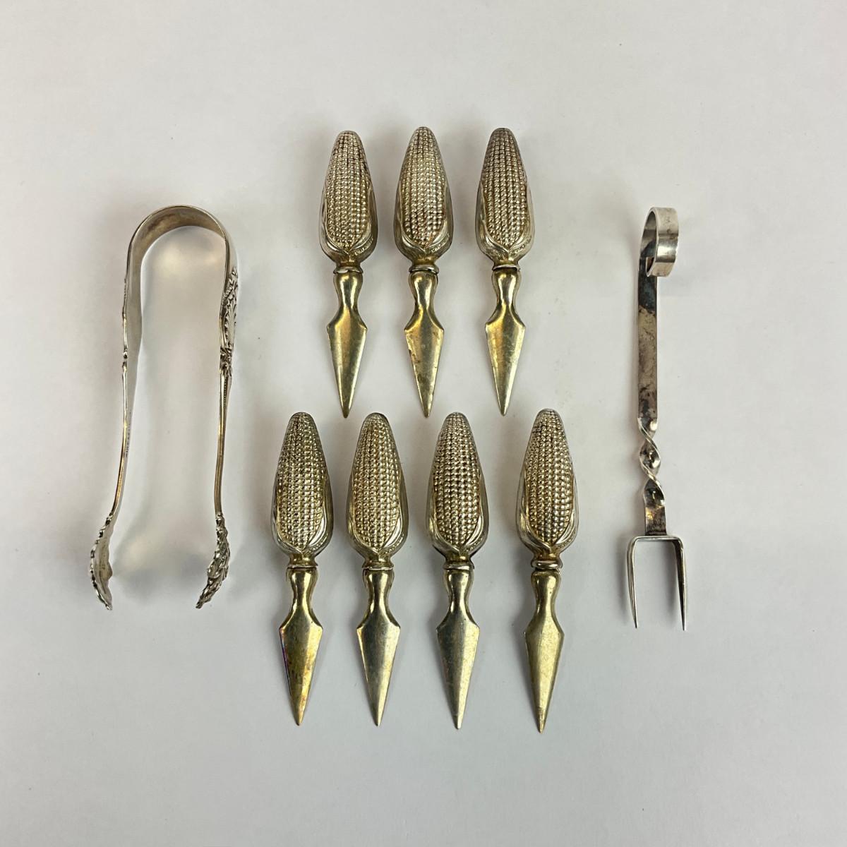 430 Sterling SIlver .925 Corn Holders, Small Tongs, Sugar Cube Tongs & Olive/Oyster Fork