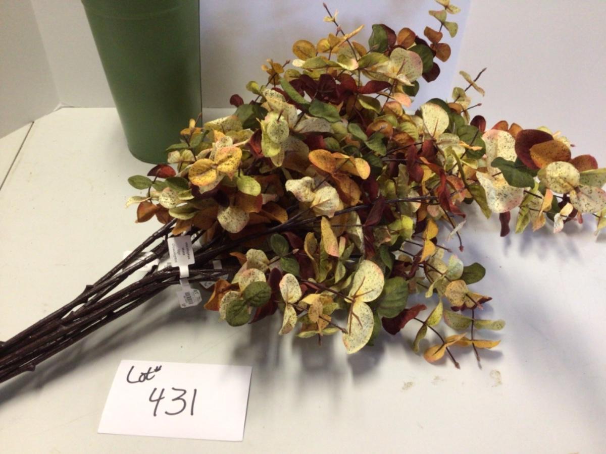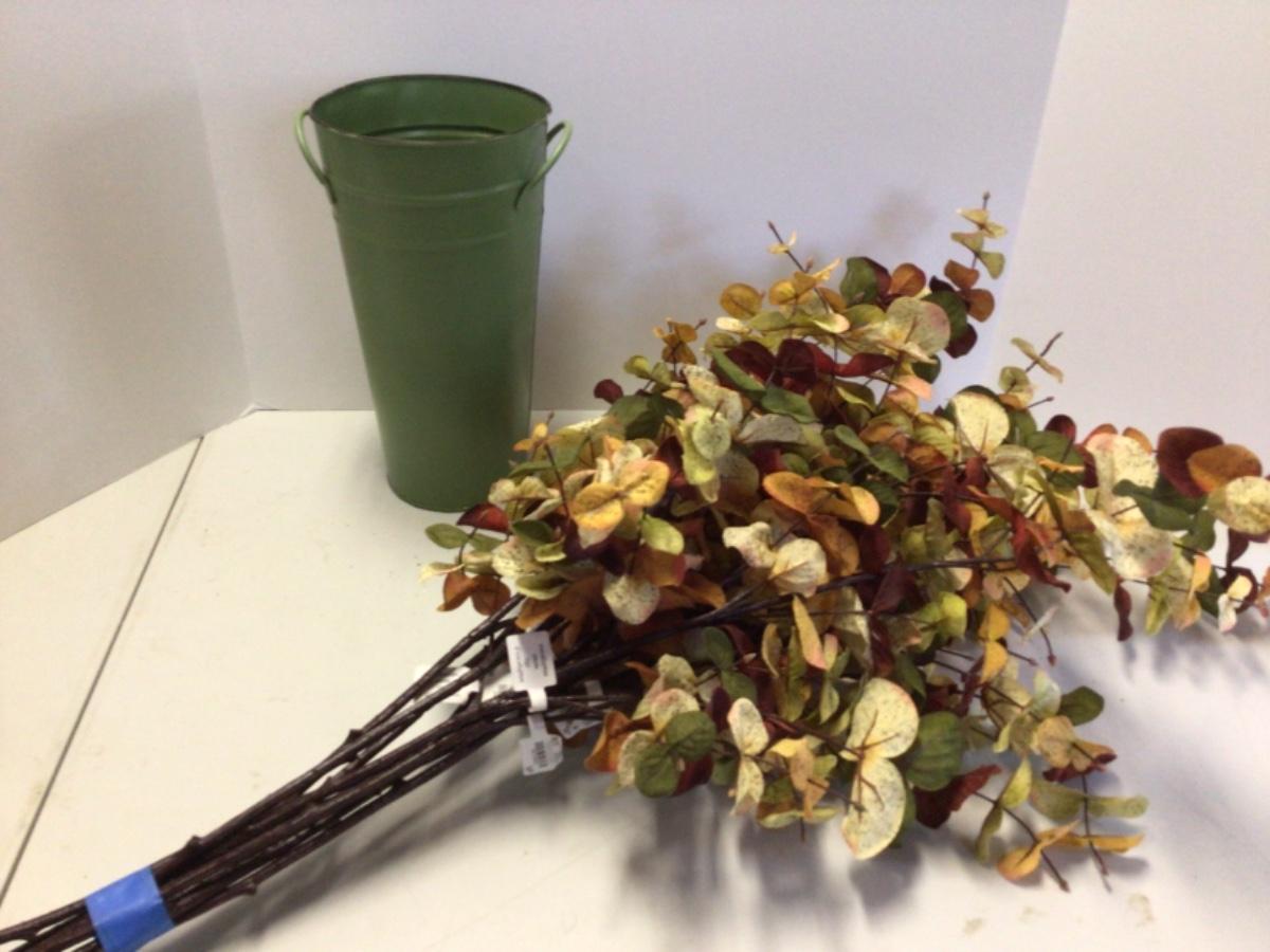 431 Bunch of Pier One Silk Eucalyptus Stems with Green metal vase