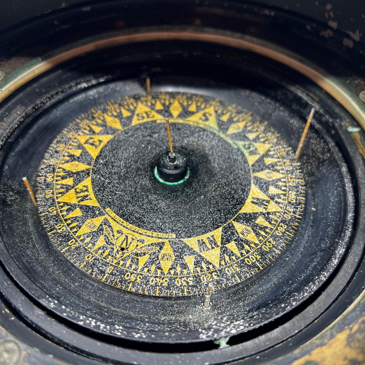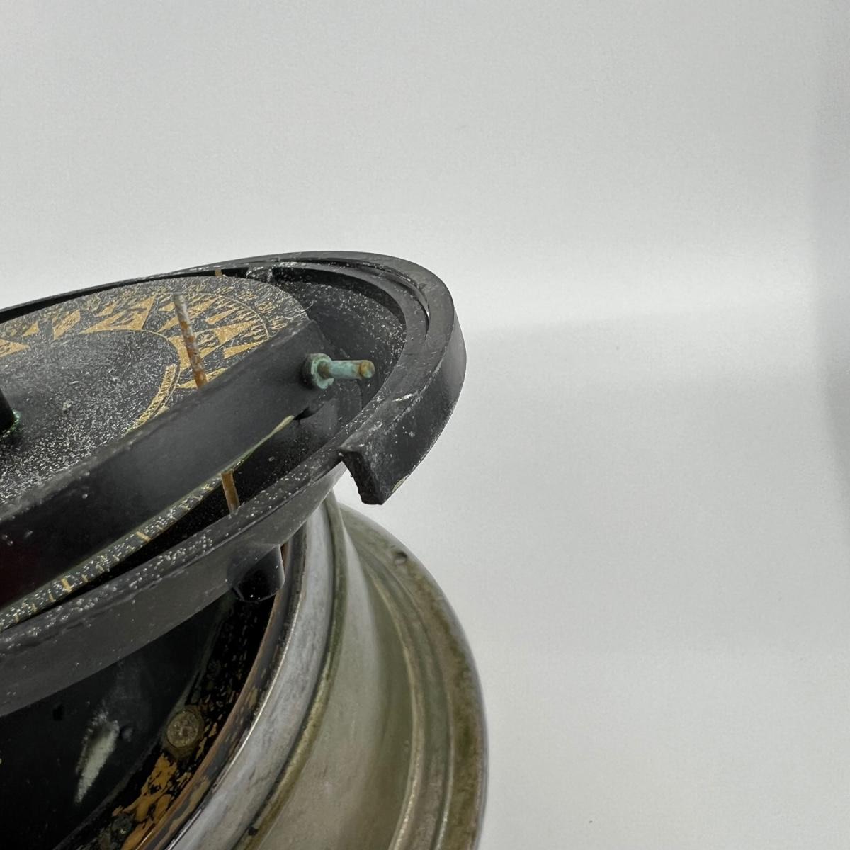 Binnacle is missing the glass globe, the compass ring is snapped, and it also has a spotted stains from some sort of powder as shown in photos.