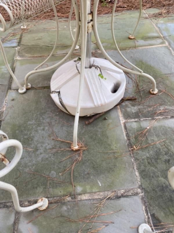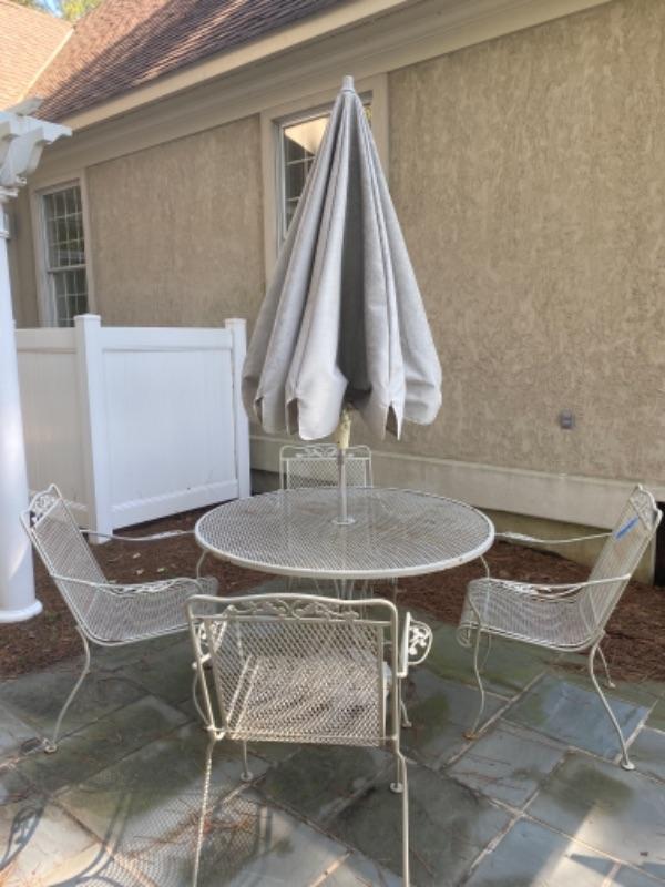Vintage Woodard Wrought Iron Table Set with Umbrella and Stand (stand is cracked)