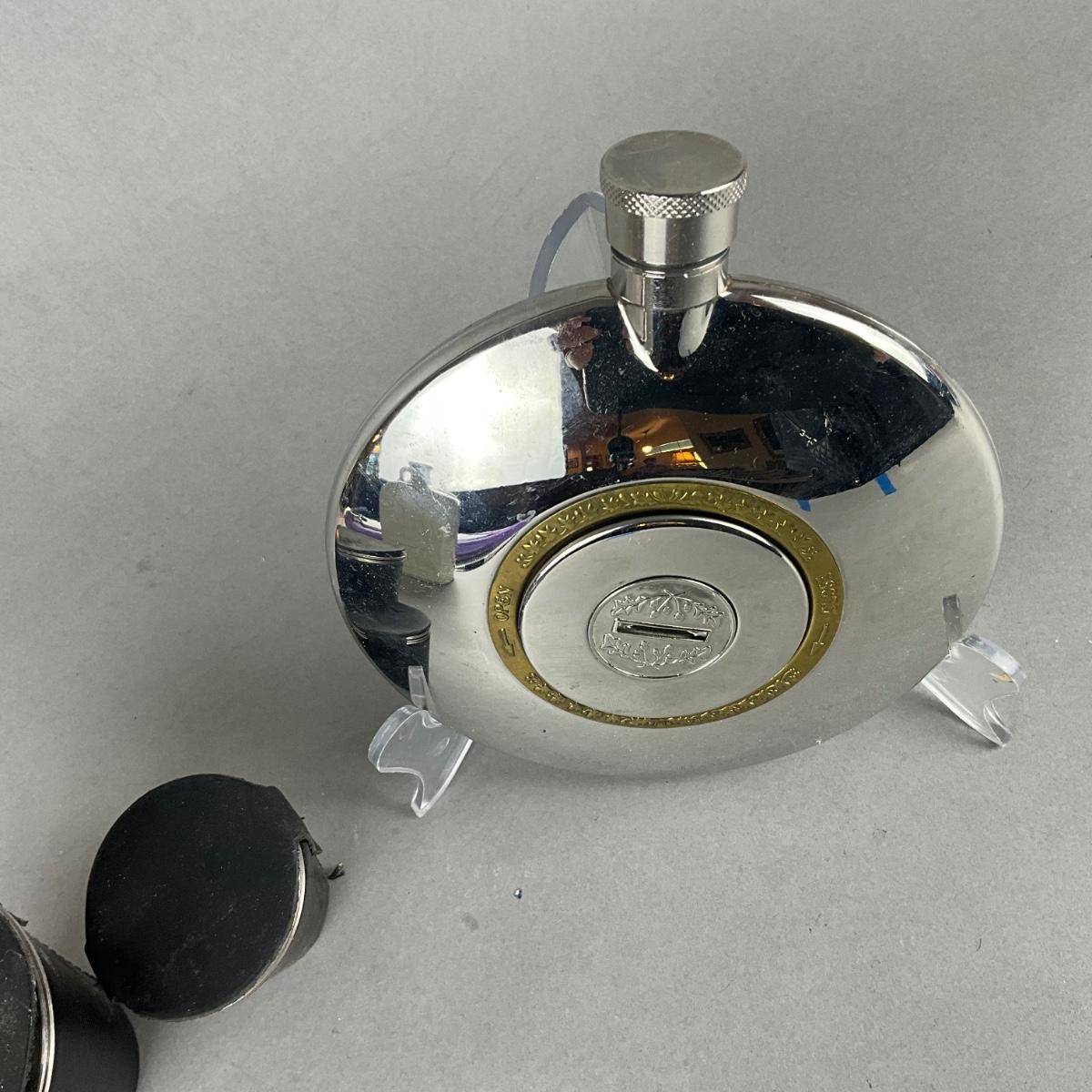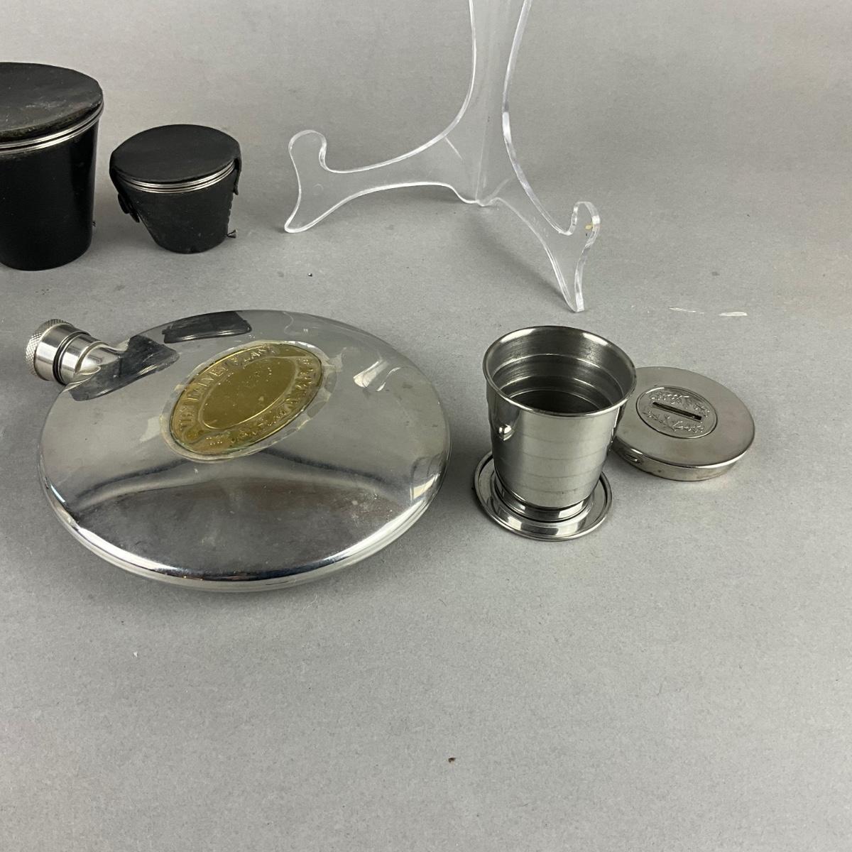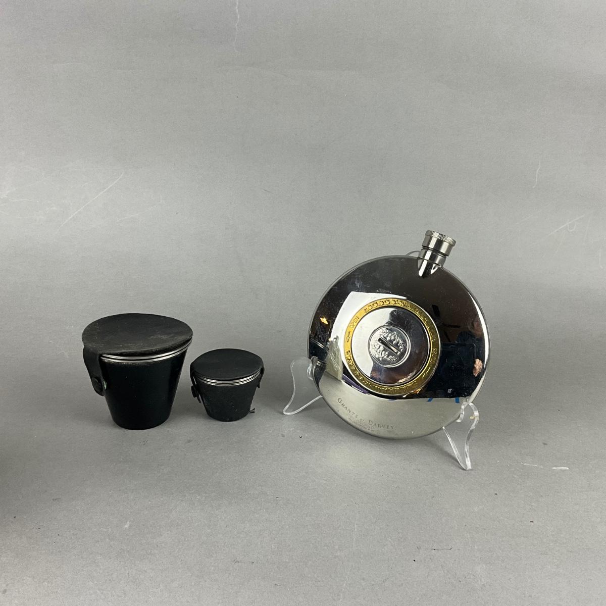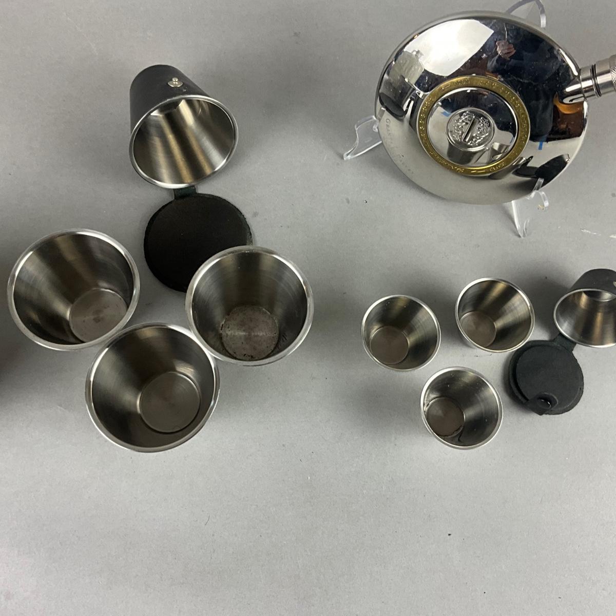 Two sets of stacking shot glasses , dalvey Scotland flask
