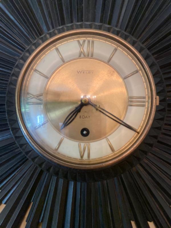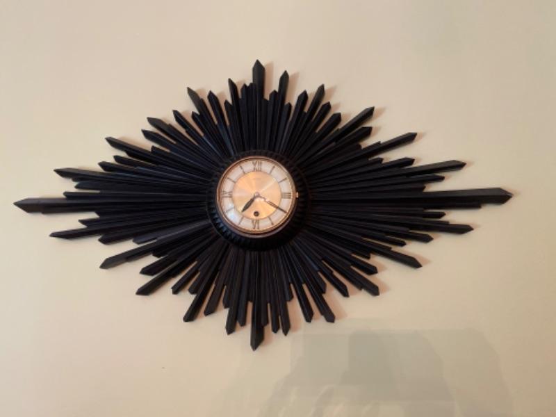 Measures 33” x 20” with glass case door . This is a wind up clock ( key is not present)