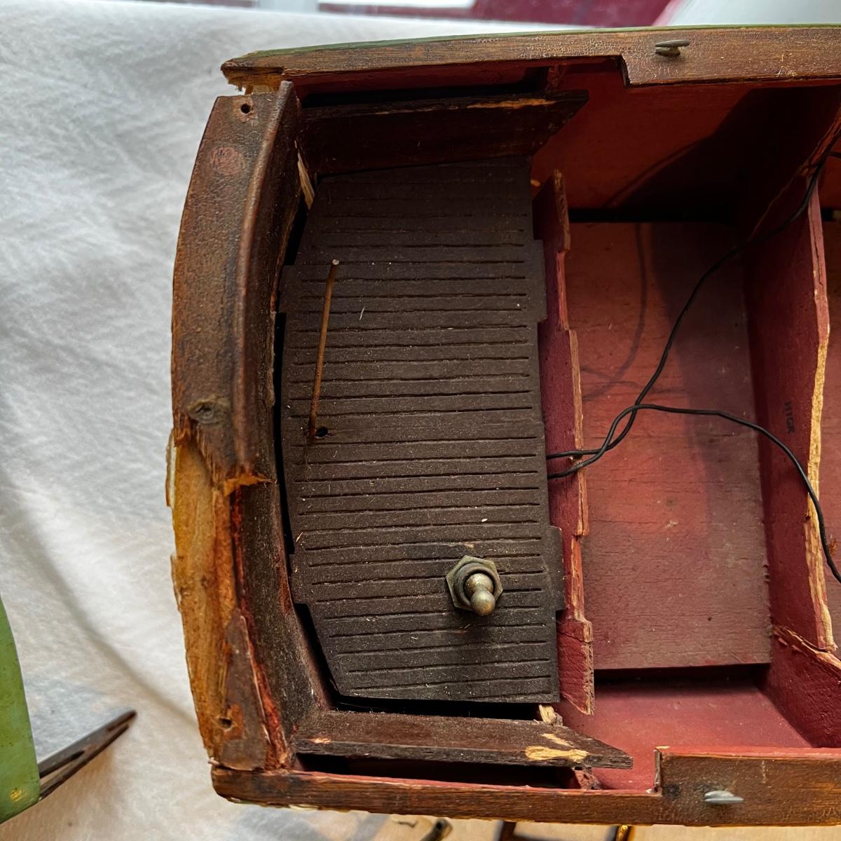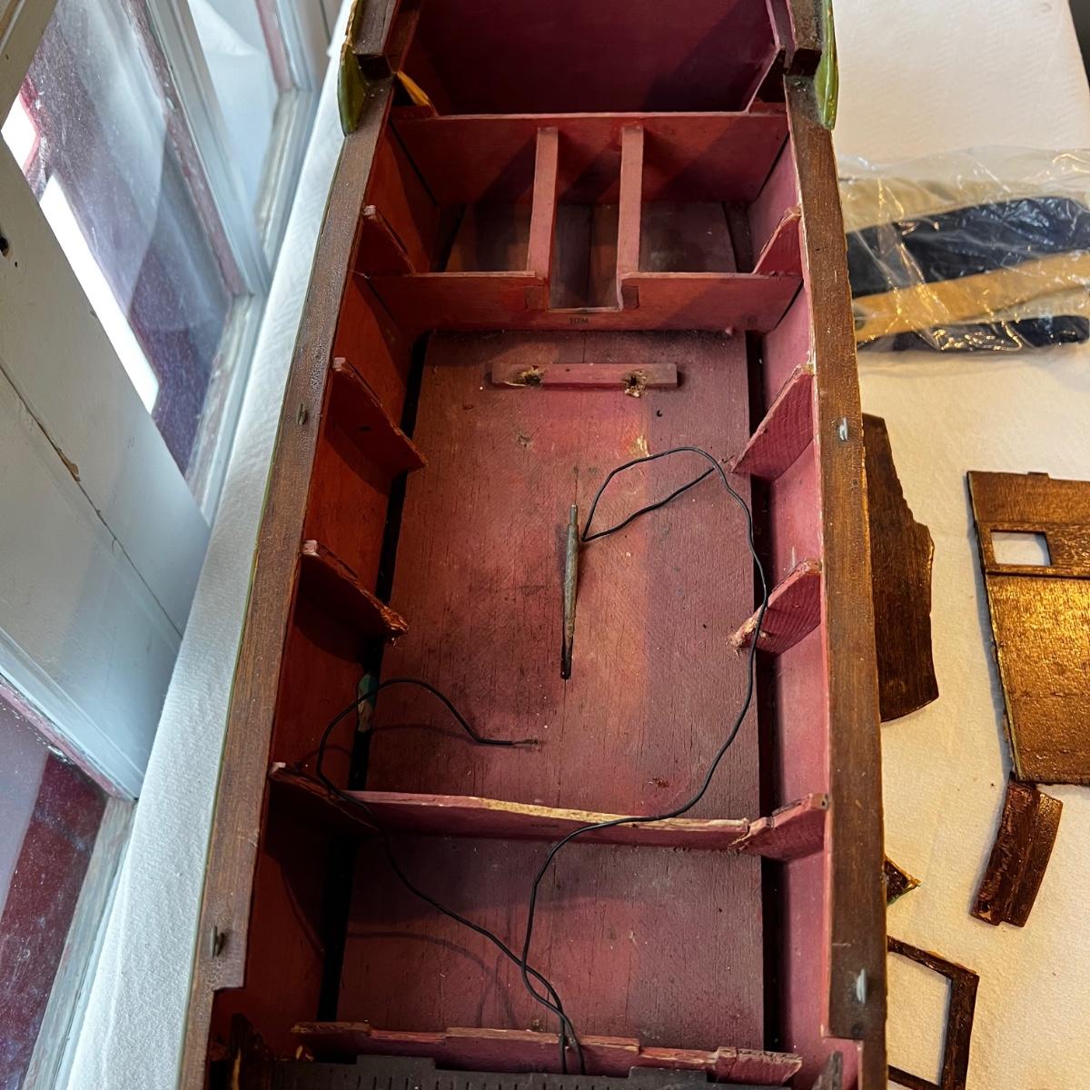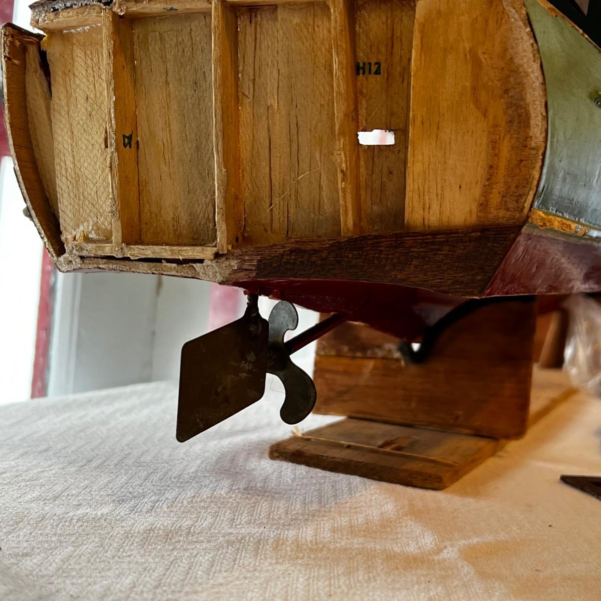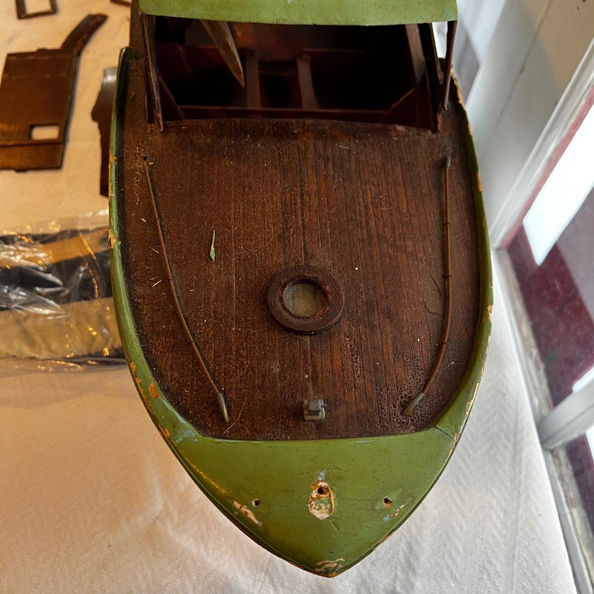 Model is in rough shape. There are pieces to the boat to be repaired but we are not sure if this is all the parts needed. Includes the electric motor, the back, wall for the inside of the hull, and the cockpit windows. Damage is shown in the photos.