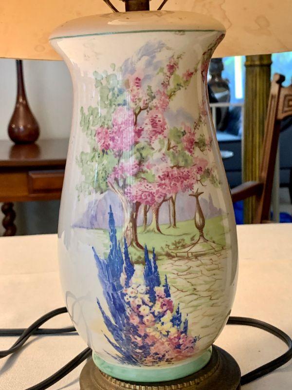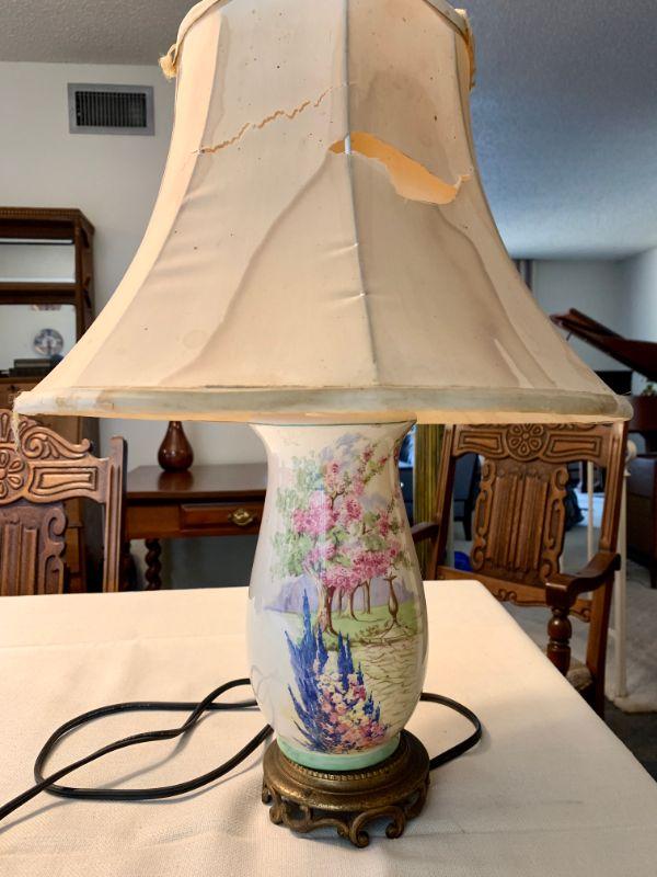Antique table lamp. English Stafford porcelain base, garden scene. 20" tall. Shade is in tatters.