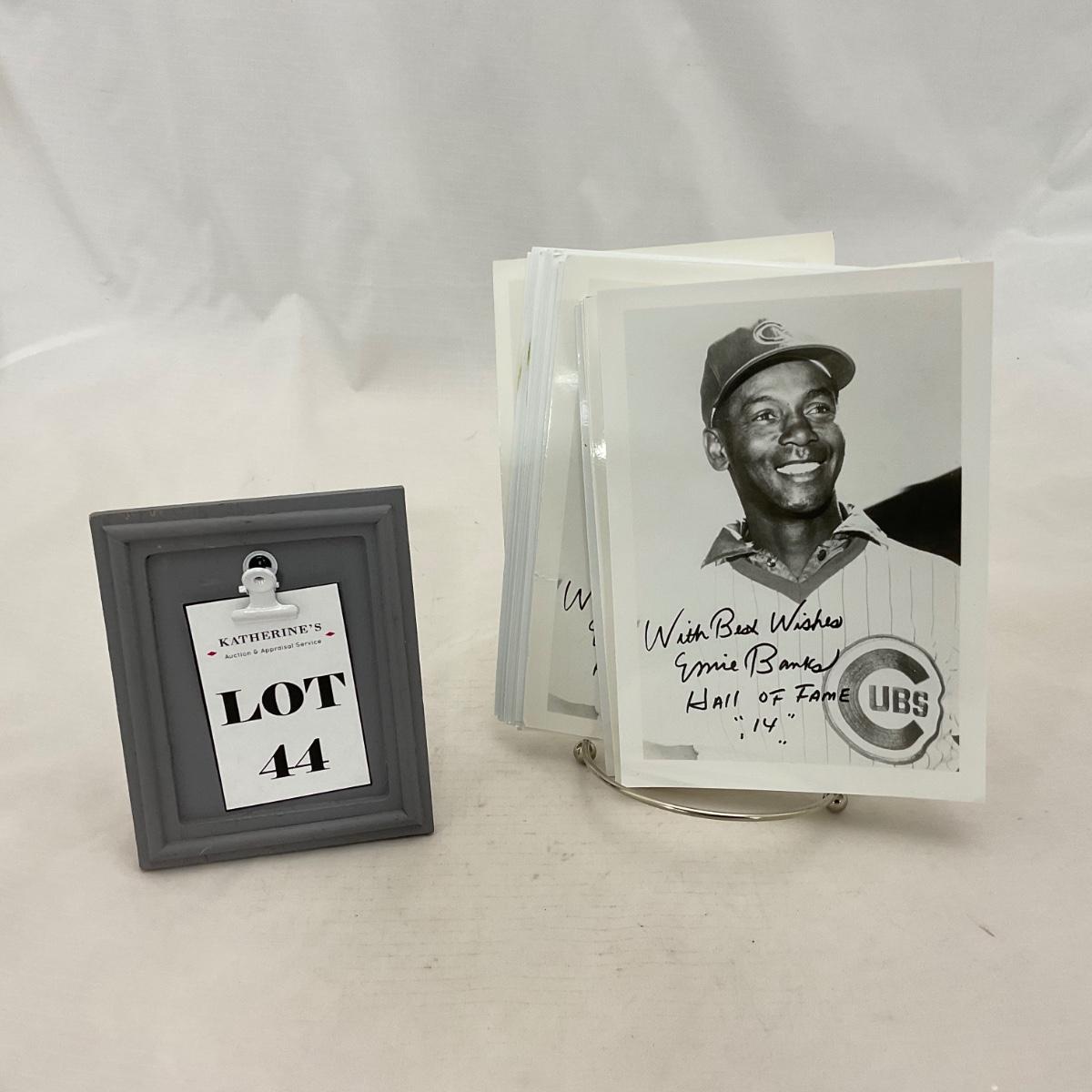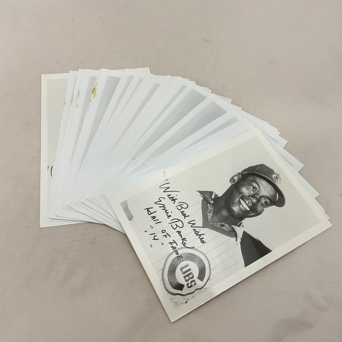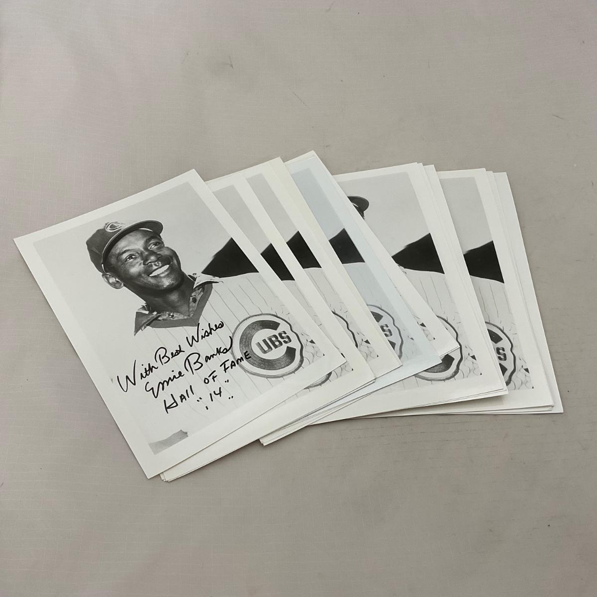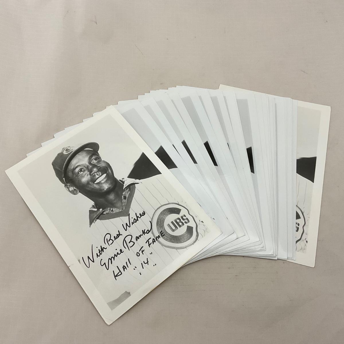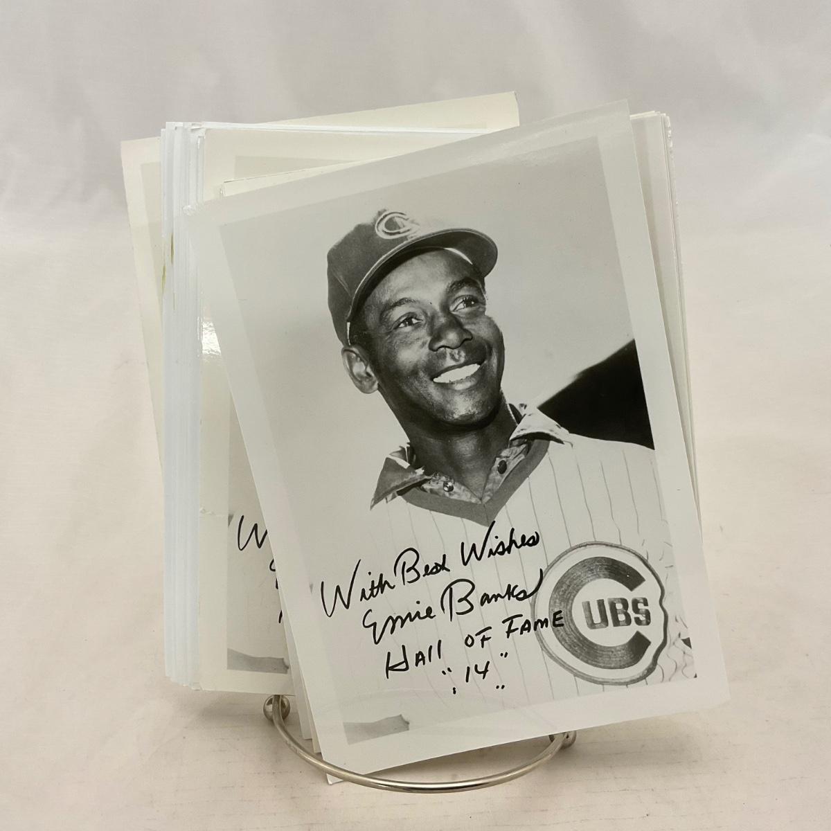 Just over 40 promo photographs of Chicago Cubs Hall of Fame star Ernie Banks. There are many of these 5 inches by 7 inches photographs, some of them are stuck together and have some damage. There are some in damaged and not stuck together as pictured. Please see photos for details and condition. ::: Shipping is available on this lot. If you require shipping you must let us know at the close of the auction. We will coordinate with you after the item has been won. Shipping fees will include insurance up to or exceeding the value of all items being mailed. If you have any questions regarding this lot please contact the auctioneer either via this website, by direct email or by phone. PICK UP TIMES and other important information can be found in the TERMS and DESCRIPTION of the auction. Please take a look for pertinent information. Thanks!