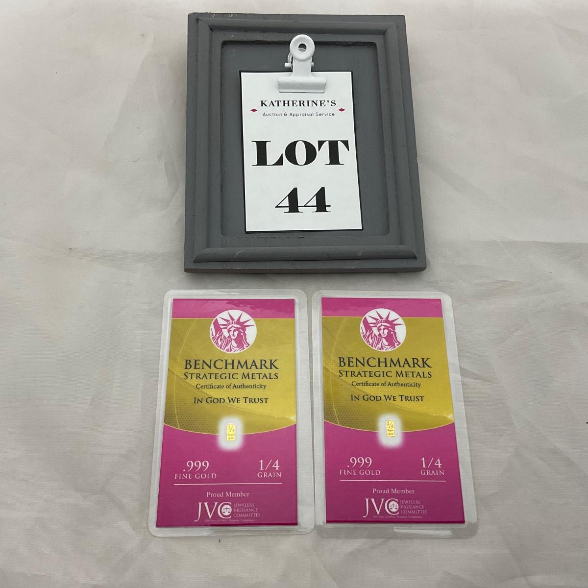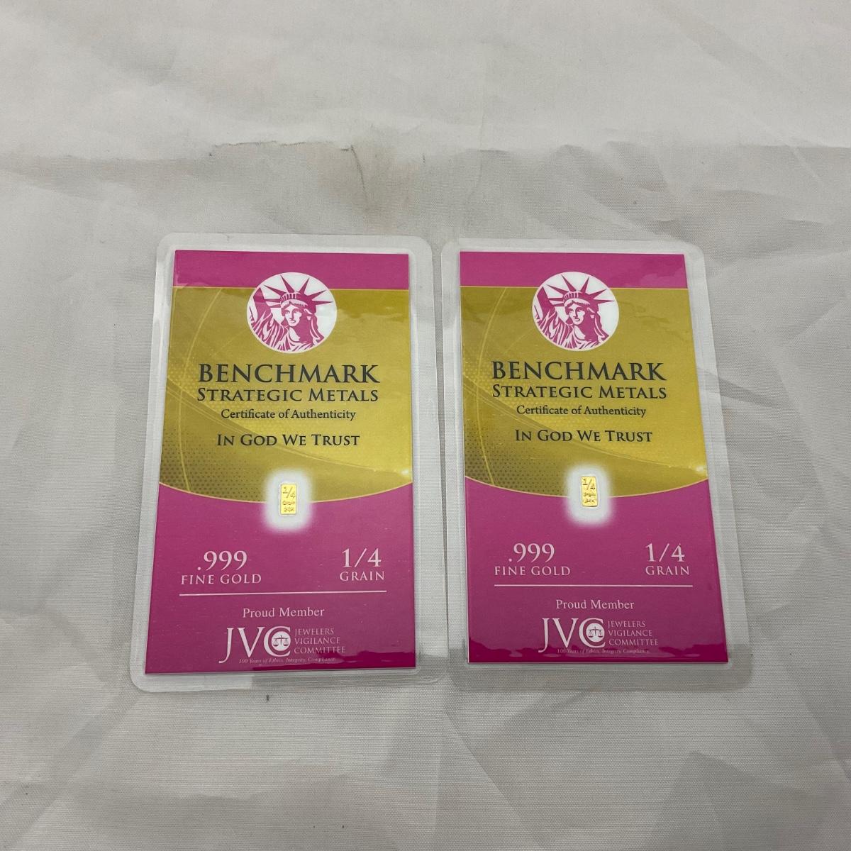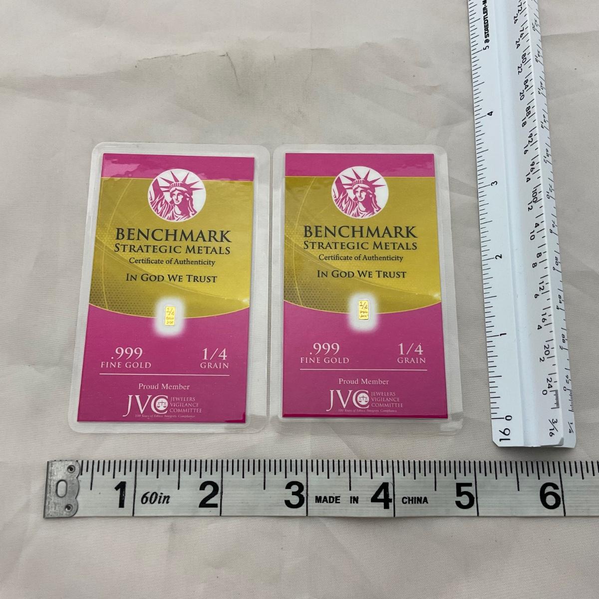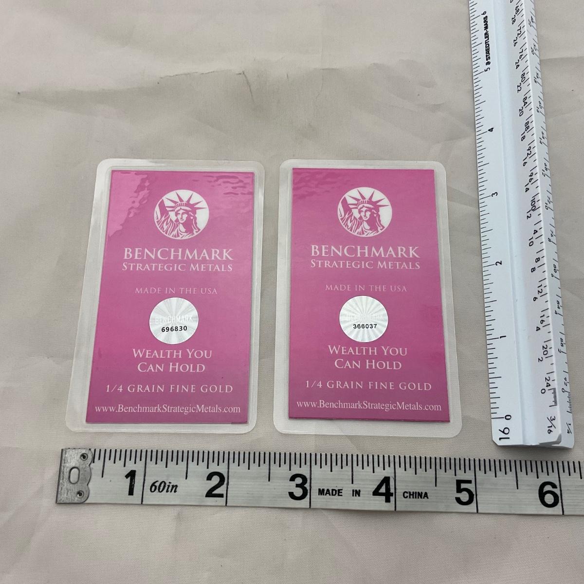 Two fraction 1/4 grain .999 fine gold Benchmark Strategic Metal authentic pieces. Please see photos for details and condition. ::: Shipping is available on this lot. If you require shipping you must let us know at the close of the auction. We will coordinate with you after the item has been won. Shipping fees will include insurance up to or exceeding the value of all items being mailed. If you have any questions regarding this lot please contact the auctioneer either via this website, by direct email or by phone. PICK UP TIMES and other important information can be found in the TERMS and DESCRIPTION of the auction. Please take a look for pertinent information. Thanks!