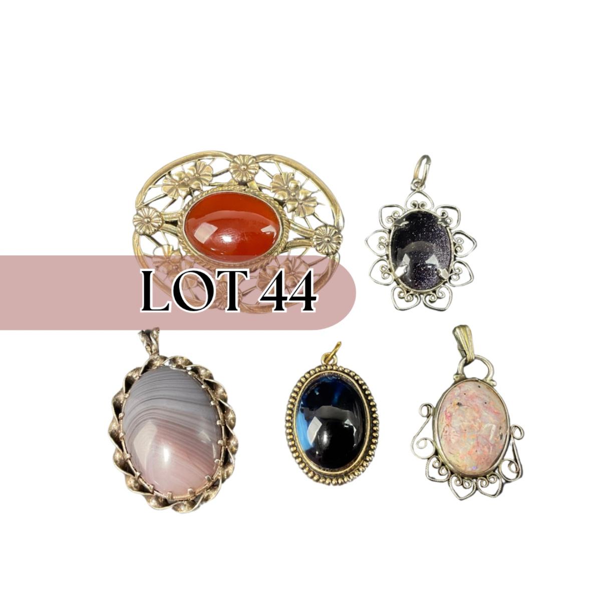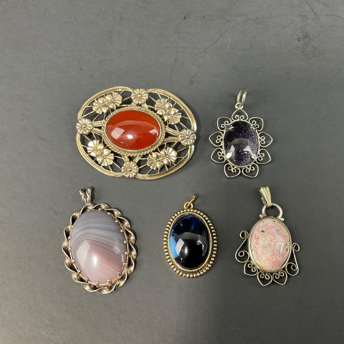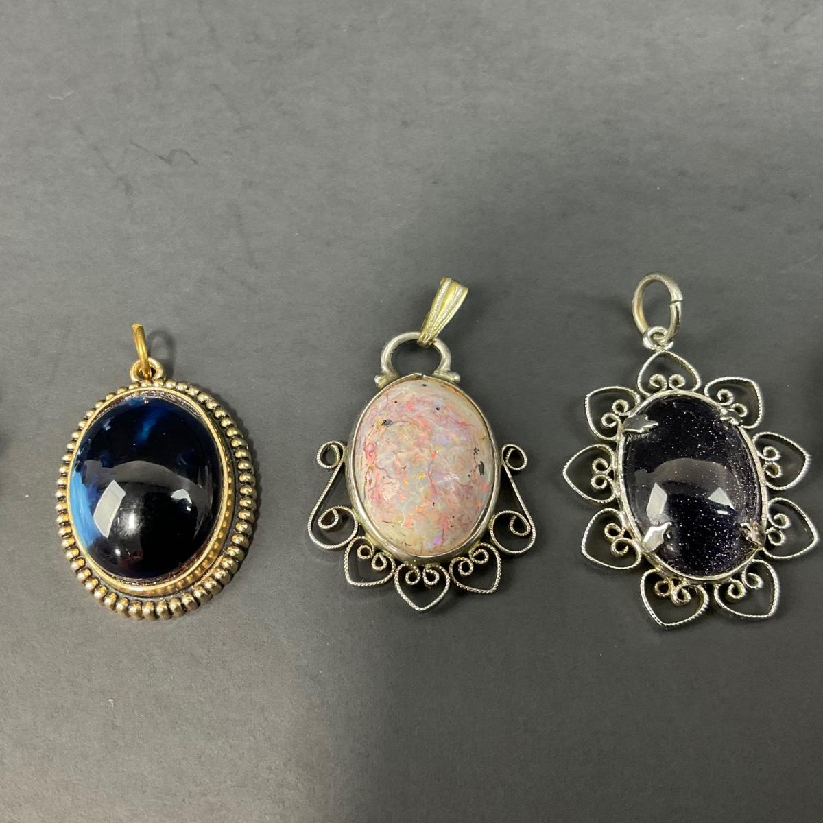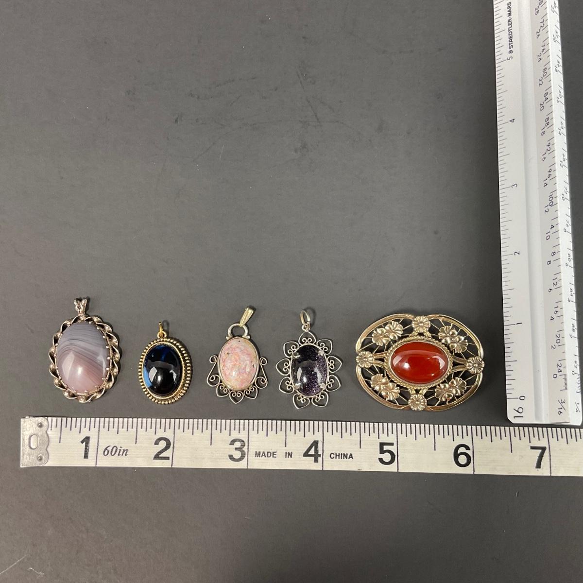 Lot of five pieces sterling pendants and brooch including one Carnelian sterling 14k brooch, one Agate pendant, one Goldstone (Blue in color) Pendant, one Opal pendant, and one Blue Stone pendant. This piece does have some scuffs, scratches, marks, or slight damage, but otherwise appears to be in great shape. Please see photos for details and condition. Any condition statement is given as a courtesy to a client, is an opinion, and should not be treated as a statement of fact. Reference to condition written, oral or within a condition report shall not be regarded as a full account of condition and may not include all defects, alterations, or restorations. Absence of a condition report does not imply a lot is flawless or lacking imperfections or damage. Katherine’s Auction & Appraisal Service shall have no responsibility for any error or omission. Returns shall not be accepted on the basis of condition. ::: Shipping is available on this lot. If you require shipping you must let us know at the close of the auction. We will coordinate with you after the item has been won. Shipping fees will include insurance up to or exceeding the value of all items being mailed. If you have any questions regarding this lot please contact the auctioneer either via this website, by direct email or by phone. PICK UP TIMES and other important information can be found in the TERMS and DESCRIPTION of the auction. Please take a look for pertinent information. Thanks!