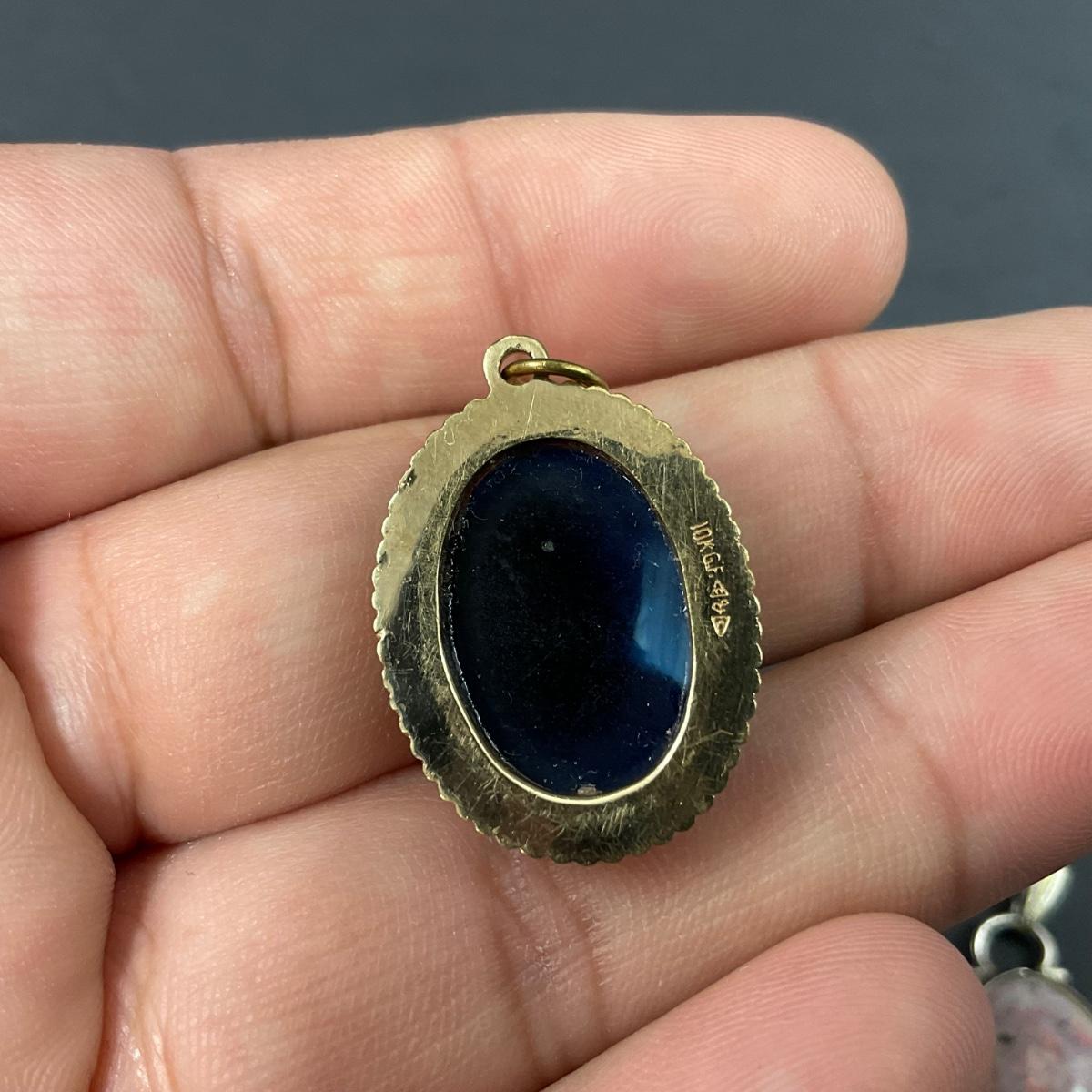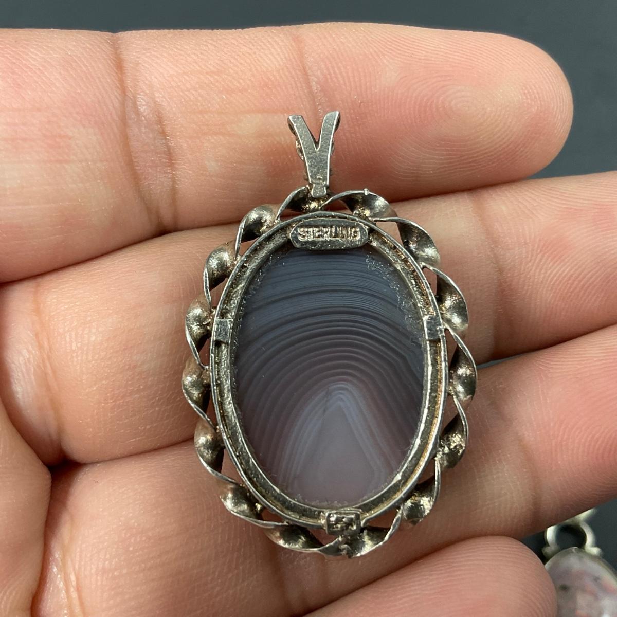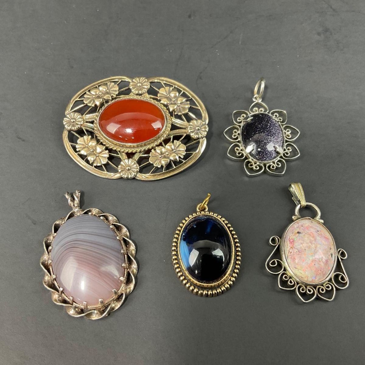Lot of five pieces sterling pendants and brooch including one Carnelian sterling 14k brooch, one Agate pendant, one Goldstone (Blue in color) Pendant, one Opal pendant, and one Blue Stone pendant. This piece does have some scuffs, scratches, marks, or slight damage, but otherwise appears to be in great shape. Please see photos for details and condition. Any condition statement is given as a courtesy to a client, is an opinion, and should not be treated as a statement of fact. Reference to condition written, oral or within a condition report shall not be regarded as a full account of condition and may not include all defects, alterations, or restorations. Absence of a condition report does not imply a lot is flawless or lacking imperfections or damage. Katherine’s Auction & Appraisal Service shall have no responsibility for any error or omission. Returns shall not be accepted on the basis of condition. ::: Shipping is available on this lot. If you require shipping you must let us know at the close of the auction. We will coordinate with you after the item has been won. Shipping fees will include insurance up to or exceeding the value of all items being mailed. If you have any questions regarding this lot please contact the auctioneer either via this website, by direct email or by phone. PICK UP TIMES and other important information can be found in the TERMS and DESCRIPTION of the auction. Please take a look for pertinent information. Thanks!