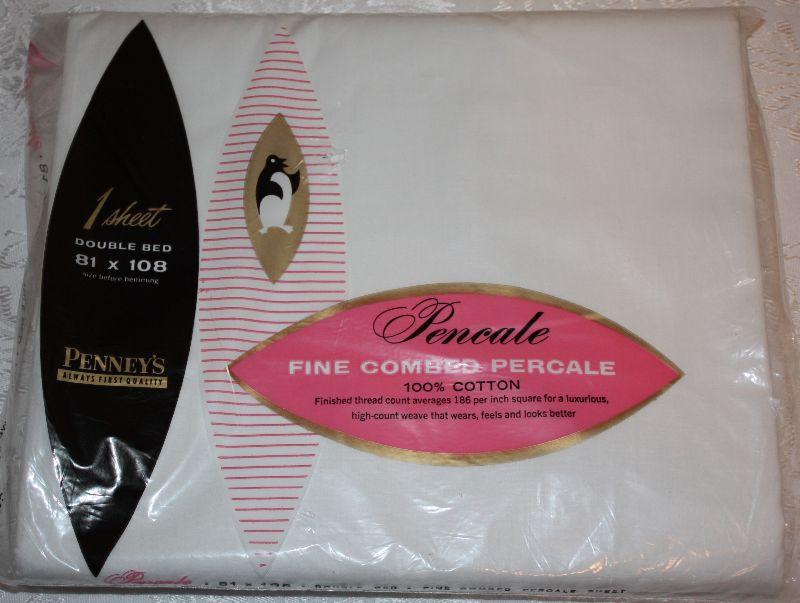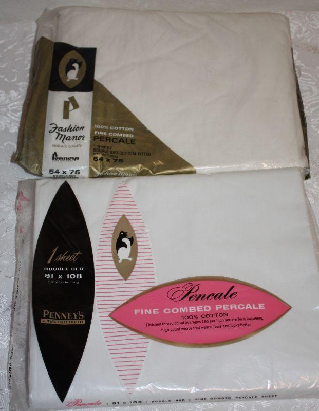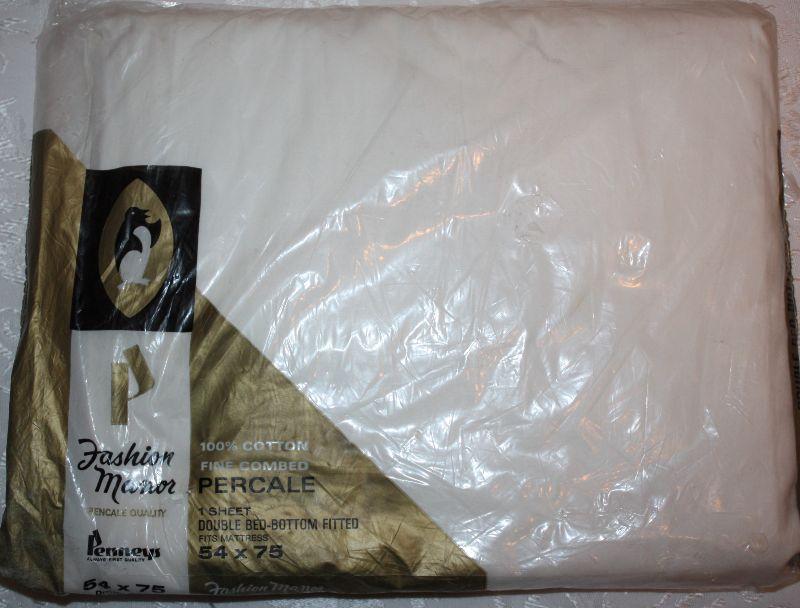 Penneys Fashion Manor full fitted sheet, light beige; Penneys Pencale flat sheet, 100% cotton, finished size 81"x108" white